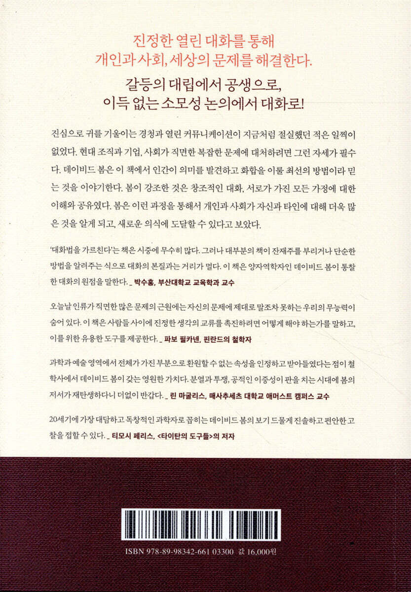 ‘대화법을 가르친다’는 책은 시중에 무수히 많다. 그러나 대부분의 책이 잔재주를 부리거나 단순한 방법을 알려주는 식으로 대화의 본질과는 거리가 멀다. 이 책은 양자역학자인 데이비드 봄이 통찰한 대화의 원점을 말한다. - 박수홍 (부산대학교 교육학과 교수)