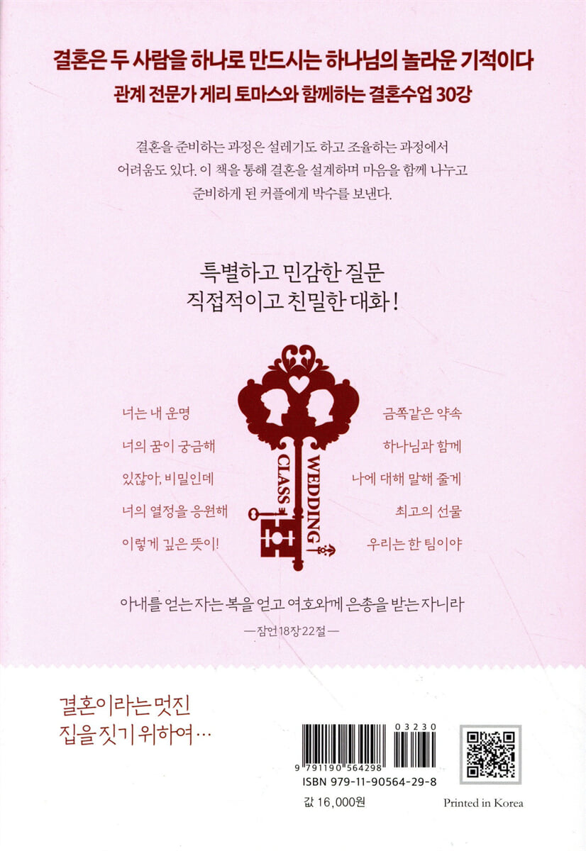 게리 토마스의 결혼 준비 학교 특별하고 민감한 질문 직접적이고 친밀한 대화! 태어나서 부모의 보호 아래 살다가 한 가정을 이룬다는 것은 설레고 기대되는 일이지만, 결혼은 현실이라는 말도 무수히 들어왔다. 저자는 결혼하기로 한 커플에 대한 축하 인사부터 시작한다. 그리고 결혼이 어렵기만 한 건 아니고 결혼으로 인해 더 풍성하고 멋진 관계를 이루어가는 많은 커플도 있다는 얘기로 책을 시작한다. 그리고 결혼이라는 멋진 집을 짓기 위해 무엇을 미리 준비하고, 어떤 대화를 나누어야 할지 제안한다. 데이트 과정에서 서로를 알아가는 시간, 결혼하면 직면할 상황들에 대해 생각을 나누고 함께 고민하고 솔직해지는 시간은 매우 요긴하다. 데이트 중에 시간을 내어 이 책을 함께 읽어보라. 자연스럽게 결혼이라는 공통 주제에 빠져들며, 서로의 이야기를 자연스럽게 나눌 수 있게 될 것이다. 또한 이 책은 결혼예비학교 또는 결혼준비학교 교재로도 적절하다. 결혼을 약속한 커플에게 저자가 분명 결혼을 앞둔 두 사람은 서로 가슴 설레는 사이겠지만, 결혼에 준비되어 있어 더는 성장이 필요 없을 만큼 ‘다 갖추어진’ 사람은 없다. 이 책은 결혼을 약속한 커플의 마음을 준비하도록 돕기 위한 것이다. 장래의 남편 또는 아내에게 최선의 배우자이자, 서로가 계속 성숙해 가는 관계를 선물하고자 함이다. - 저자 게리 토마스 |