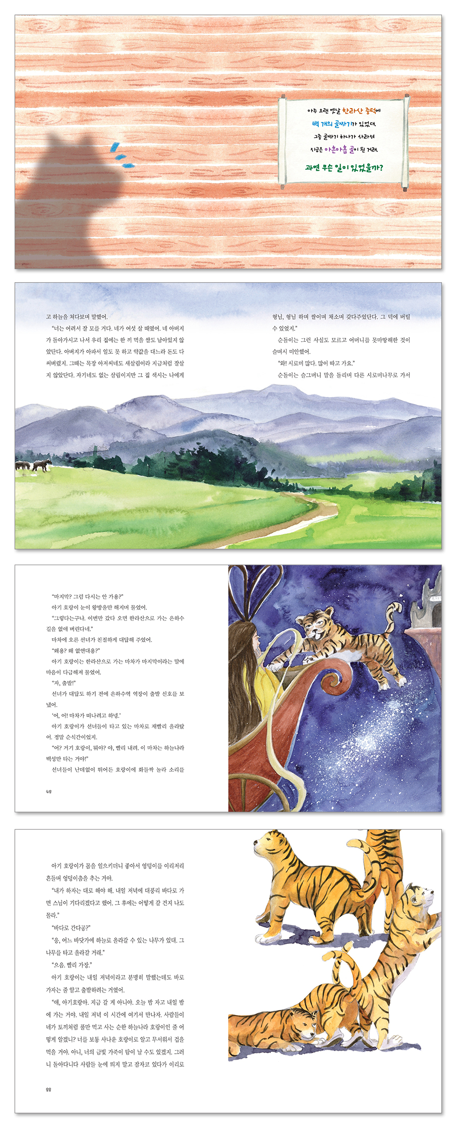 개성 넘치는 아기 호랑이와 덕을 베푸는 순돌이의 우정과 모험 작품 속 순돌이와 아기 호랑이라는 두 캐릭터가 만나 사건을 해결하는 모습은 기존 아흔아홉 골 설화에 구체적인 상상을 더해 더욱 생생하고 입체감 있게 풀어냈다. 하늘나라에서 내려온 아기 호랑이는 기존 동화 속에서 묘사되었던 무서운 호랑이 캐릭터들과는 사뭇 다르게 유머러스한 구석이 있다. 독특한 대화법을 구사하는 한라산에 나타난 호랑이의 정체는 무엇일까? 어디로 튈지 알 수 없는 통통 튀는 매력을 보유한 호랑이와는 다르게 순돌이는 주변을 잘 보살피는 세심한 성격의 소유자다. 이웃이 아플 때 직접 산에 올라가 열매를 따서 가져다 주는 것으로 보답할 줄 아는 소년은 한라산을 헤메는 호랑이의 말을 듣고서 선뜻 도와주기로 하는데…. 잔잔한 옛풍경과 함께 흥미진진한 사건과 가슴 따뜻한 이야기가 아흔아홉 골짜기를 가득 채운다. |
