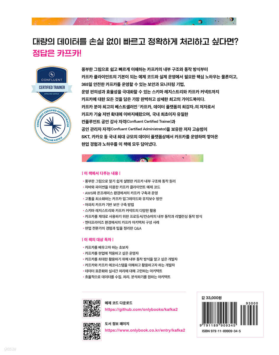 예상보다 카프카를 이미 도입했거나 추후 도입을 검토하는 국내 기업들이 많다는 사실을 최근 체감하고 있습니다. 저자 고승범 님이 자신이 체득한 카프카 운영 경험을 모두 녹여내고 담아낸 이 책은 카프카를 처음 접하거나 카프카에 대한 전반적인 정보가 필요한 분들께 없어서는 안 될 바이블 역할을 할 것이라 생각합니다. 많은 미션 크리티컬한 업무에 카프카가 꾸준히 적용되고 있으며, 이와 관련한 운영 기술력을 요구하는 곳은 더욱 많아질 것입니다. 따라서 이 책은 훌륭한 카프카 엔지니어를 양성하는 데 크나큰 귀감이 될 것이라 믿습니다. - 최영주 (컨플루언트 코리아 대표)