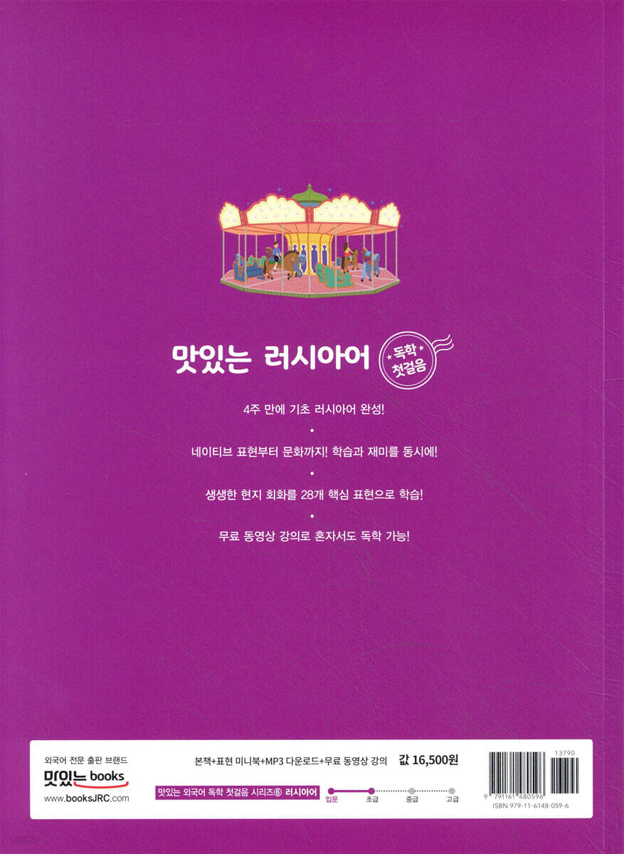 맛있는 러시아어 독학 첫걸음 1. 4주 만에 기초 러시아어 완성! 네이티브 표현부터 문화까지 총망라! -러시아어 첫걸음 학습자에게 꼭 필요한 내용만을 수록 -‘재미X문화X러시아어’라는 흥미 있는 콘셉트로 러시아어 학습의 문턱은 낮추고 흥미는 up 2. 현지에서 바로 통하는 생생 단어와 28개 핵심 표현 수록! -4주 동안 러시아 현지에서 펼쳐지는 생생한 회화 학습 -28개의 핵심 표현으로 기초 러시아어 문법 마스터 -다양한 연습 문제로 말하기 능력 배양 3. 무료 동영상 강의로 학습과 재미를 동시에! -러시아어 발음, 문법, 회화 등을 담은 알찬 동영상 강의로 독학 가능 -한국인 강사의 쉬운 설명과 원어민 강사의 생생한 현지 회화의 결합 4. 독학을 응원하는 알찬 특별 부록 구성! -표현 미니북 -러시아 지도 -러시아어 키보드 자판 -러시아어 발음 -무료 동영상 강의 -MP3 무료 다운로드 |