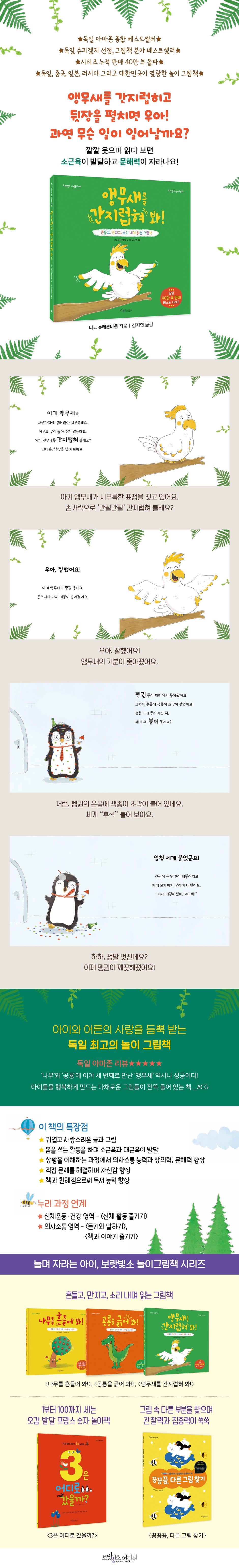 깔깔 웃으며 읽다 보면 소근육이 발달하고 문해력이 자라나요! *누리 과정 연계 신체운동·건강 영역 - 〈신체 활동 즐기기〉 의사소통 영역 - 〈듣기와 말하기〉, 〈책과 이야기 즐기기〉 이 책은 함께 놀아 줄 독자 친구를 기다리고 있어요. 친구가 없어서 심심한 앵무새, 온몸에 색종이 조각이 덕지덕지 붙은 펭귄, 아슬아슬 높은 나뭇가지에 매달린 너구리 등 책 속에 등장하는 친구들은 저마다 혼자서는 아무것도 해결하기 어려운 상태에 있어요. 아이가 책을 흔들거나, 만지거나, 소리를 내면 비로소 답답했던 일들이 술술 풀리게 되고, 모두 환하게 웃게 된답니다. 아이는 행동이 책에 미치는 결과를 볼 수 있어 무척 짜릿하고 통쾌한 느낌이 들 거예요. 이렇게 책과 노는 과정에서 의사소통 능력과 창의력, 문해력을 기를 수 있고, 소근육 발달에도 도움이 돼요. 아이들에게 책을 읽어 주는 어른들도 어느새 책과 노는 재미에 푹 빠져들게 되지요. 책과 신나고 재밌게 놀았다면, 어느새 책을 가만히 놓아 줄 시간도 다가와요. 겨울잠을 자야 하는 갈색 곰 브루노를 위해 커튼을 쳐 주세요. 그런 다음, 책을 덮고 조용히 책장에 꽂아 주세요. 그럼 책 놀이가 비로소 끝이 난답니다. 독일에서 시작돼 일본, 러시아, 중국 그리고 한국까지 꾸준한 사랑을 받은 독자가 인정한 그림책! 나무와 공룡에 이어 세 번째로 만난 앵무새 역시 매우 성공적이었다! 아이들을 행복하게 해 주는 다채로운 그림들이 잔뜩 들어 있는 책. _ACG 한 살이든 여덟 살이든 아이들은 모두 니코 슈테른바움의 책을 좋아한다. 아무리 어려도 이 책이 시키는 일을 잘 해낼 수 있기 때문이다. _SaPa 내 딸은 이 책에 푹 빠져 있다. (당연히 모든 시리즈를 전부 소장하고 있다.) 무엇보다 딸아이는 다른 캐릭터들을 돕는 일을 매우 즐거워한다. _Bianca 『앵무새를 간지럽혀 봐!』는 같은 시리즈인 『나무를 흔들어 봐!』와 『공룡을 긁어 봐!』와 함께 세계 각국에 수출되어 있고, 독일에서만 누적 40만 부 넘게 판매되었어요. 그중 첫 번째 시리즈인 『나무를 흔들어 봐!』의 경우 독일 아마존 성인, 아동 분야를 통틀어 ‘종합 1위’까지 오르며 폭발적인 인기와 관심을 얻었고, 그 후로도 독일 유력 언론 ‘슈피겔지’ 선정 그림책 분야 베스트셀러 상위권에 꾸준히 올라 있는 만큼, 독일 독자의 지지가 식지 않고 있지요. 또한 국내에서도 2021년에 EBS에서 방영된 〈당신의 문해력〉에서 서울대 연구진이 직접 엄선한 ‘문해력 챌린지 도서’에 선정되며 많은 사랑을 받고 있답니다. 아이들이 읽기에 어렵지 않은 쉽고 재미있는 내용과 풍성한 놀잇거리, 간결하고 사랑스러운 글과 그림의 조화가 이 시리즈의 인기 요인으로 꼽히고 있어요. 이 책의 특장점 - 귀엽고 사랑스러운 글과 그림 - 몸을 쓰는 활동을 하며 소근육과 대근육이 발달 - 상황을 이해하는 과정에서 의사소통 능력과 창의력, 문해력 향상 - 직접 문제를 해결하며 자신감 향상 - 책과 친해짐으로써 독서 능력 향상 |