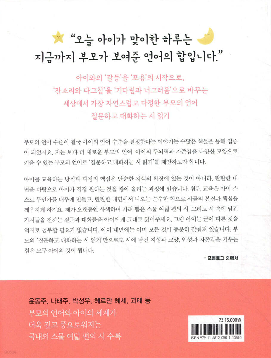 자신의 내면에 담습니다. 부모가 사랑을 말하면 아이는 사랑을 배우고, 부모가 미움을 전하면 아이는 미움을 배웁니다. 아이가 어떤 가치를 배우며 자라기를 바라나요? 어떤 마음들이 아이의 내면에 담기기를 바라나요? 지금 당신의 메시지를 사랑하는 아이에게 전해주세요. 오늘 아이가 맞이한 하루는 지금까지 부모가 보여준 언어의 합입니다.” --- p.9 ‘프롤로그’ 중에서 “너, 참 생각이 깊구나. 어쩌면 그런 멋진 생각을 했니?” “시에 등장하는 친구의 마음을 아주 깊게 이해했구나. 너의 상상력과 이해심은 앞으로 많은 사람들의 처지와 어려움을 너그럽게 감싸줄 수 있을 거야.” 이런 부모의 말을 들은 아이의 미래는 어떤 식으로 바뀔까요? 더 깊이 생각하고 상대방을 더 많이 이해할 수 있는 멋진 사람으로 성장할 겁니다. 평소에 아주 작은 문제라도 아이와 함께 대화를 통해 이야기를 나눠보세요. 이때 중요한 것은 아이가 내놓은 답변의 수준을 평가하려는 마음을 버려야 한다는 사실입니다. 평가는 좋은 수단이 아닙니다. 그저 좋은 마음을 전하고 싶다는 눈빛으로 바라봐주세요. 그런 시간을 통해 아무리 책을 읽고 강연을 들어도 도저히 찾아낼 수 없었던, 아이의 내면을 탄탄하게 만드는 언어의 비밀을 발견할 수 있을 테니까요. --- p.21 ‘상대방의 마음을 헤아리는 공감력 기르기 : 박성우 〈삼학년〉’ 중에서 “아무도 밟지 않은 눈길을 걸을 때 기분이 어땠어?” 아이들이 대답을 잘 못하는 이유 중 하나는 질문에 대해 관심이 없기 때문입니다. 그러므로 아이 입장에서 가장 친숙한 경험, 관심 있는 주제로 대화를 시작하는 것이 좋습니다. 누구나 자신이 잘 알고 있는 것에 대해서는 쉽고 빠르게 대답할 수 있지요. 첫 번째 질문을 시작했다면, 이제 답변의 길이를 늘려나가는 과정이 필요합니다. 아이들을 자꾸, 조금 더 구체적으로 생각하게 만들어야 합니다. 아이들이 단순히 “좋아.” “최고지!”라고 짧게 대답하는 것으로만 끝나게 하지 말고, 부모가 먼저 구체적인 질문을 차근차근 던져보세요. --- p.42 ‘느낀 것을 일상의 실천으로 옮기는 법 : 서산대사 〈답설야〉’ 중에서 “너는 지금 꼭 이루고 싶은 꿈이 있어?” 그 꿈을 이루기 위해서는 지금 이 시간을 어떻게 보내면 좋을까?” 만약 우리가 지금 낮은 곳에서 방황하고 있다면 그 이유는, 높은 곳에 도달하기 위한 준비가 필요하기 때문이고요. 지금 원하지 않는 삶을 살고 있는 이유는, 앞으로 원하는 모든 것을 가지고 살아갈 준비가 필요하기 때문입니다. 세상에 쓸모없이 지나가는 시간은 없다는 멋진 사실을 아이가 깨달을 수 있다면, 아이가 보내는 하루는 차곡차곡 쌓여 역사가 만들어질 겁니다. 모든 아이는 날아갈 준비를 하는 멋진 새입니다. 당장 창공을 향해 날지 않는다고, 새를 다른 이름으로 부르지는 않습니다. 아이가 자신의 가능성을 믿게 해주세요. 새가 날 수 있는 이유는 날개가 있어서가 아니라, 날 수 있다고 생각하기 때문이라는 멋진 생각을 할 수 있게요. 날 수 없다는 생각을 버리면 더 멀리 멋지게 날 수 있습니다. --- p.71 ‘자신의 가능성을 믿는 아이는 내면의 깊이가 다르다 : 나태주 〈내가 너를〉’ 중에서 아이는 무언가를 발견하는 것을 좋아합니다. 하지만 그보다 더 좋아하는 것은 자신이 발견한 것을 부모에게 말하며 서로 웃고 즐기는 시간이랍니다. 부모의 역할은 대단한 것을 가르치는 게 아니라, 말할 기회를 허락하고 오랫동안 지켜보는 데 있다는 사실을 잊지 말아요. 그리고 아이가 자신이 답변한 내용을 현실에 더욱 적절히 적용하기를 바란다면, 이렇게 다가가보세요. 만약 아이가 ‘공부’라는 키워드를 제시했다면, 이렇게 질문해보는 겁니다. “콘크리트를 시멘트 가루와 모래, 자갈을 더해서 만들 수 있는 것처럼, ‘공부’를 구성하는 것에는 뭐가 있을까?” --- p.105 ‘일상의 모든 사물은 아이의 창의력이 된다 : 유용주 〈시멘트〉’ 중에서 언어는 매우 사용하기 어려운 도구입니다. 왜냐하면 상대를 아끼고 사랑하는 마음을 정확하게 표현하는 것이 생각처럼 쉬운 일이 아니기 때문이죠. 각종 경조사에서 엄청나게 많은 돈을 주는 것은 쉽지만, 돈에 담은 마음을 언어로 표현하는 것은 매우 어려운 일이지요. 아이들의 세계도 마찬가지입니다. 마음과 다른 말이 나와서 오해가 생기고 친구끼리 다투기도 하니까요. 말실수로 다투거나 힘든 상황에 놓였던 기억이 있는지 아이에게 질문하면서, 그 기억을 떠올리게 해주세요. 그리고 이렇게 차례로 질문하며 자연스럽게 아이 스스로 방법을 찾게 해주세요. “그때 어떤 일이 생겼었니?” “다툼이 생긴 이유는 뭐야?” “친구에게 어떻게 말하고 행동했어야 다투지 않을 수 있었을까?” --- p.142 ‘언어 감각을 훈련하는 시 읽기 : 윤동주 〈서시〉’ 중에서 |