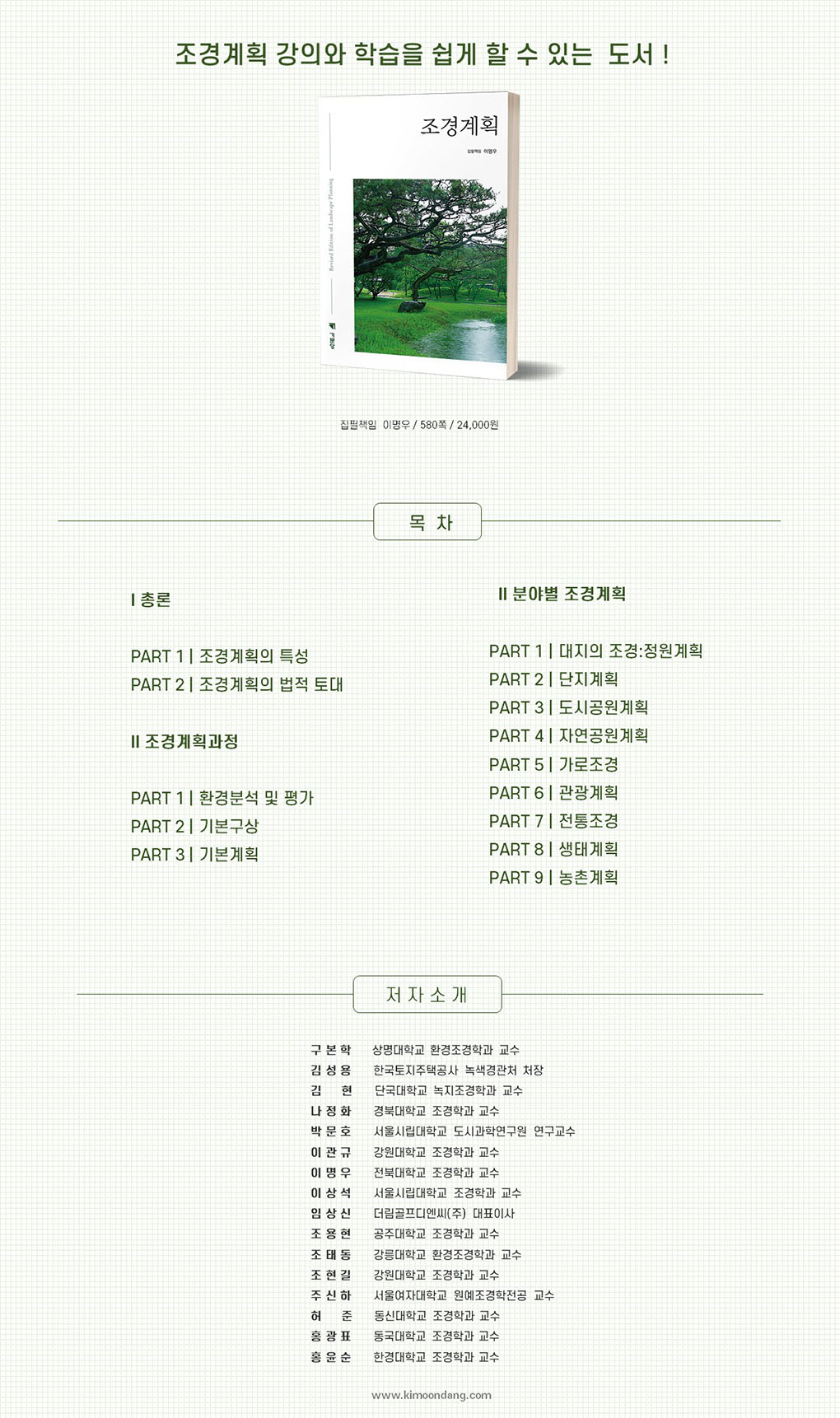 PART 1 | 조경계획의 특성 제1장 현대조경과 조경계획 제2장 조경계획과정 PART 2 | 조경계획의 법적 토대 제1장 법정계획과 조경법규 제2장 환경성평가 제3장 토지적성평가와 사업타당성 II 조경계획과정 PART 1 | 환경분석 및 평가 제1장 자연환경분석 제2장 인문환경 및 행태분석 제3장 시각환경분석 제4장 종합분석 및 평가 PART 2 | 기본구상 제1장 서론 제2장 프로그래밍 제3장 대안 설정 및 평가 PART 3 | 기본계획 제1장 서론 제2장 토지이용계획 제3장 동선계획 제4장 부지 및 시설물계획 제5장 녹지 및 식재계획 III 분야별 조경계획 PART 1 | 대지의 조경:정원계획 제1장 서론 제2장 주택 정원계획 제3장 비주거 정원계획 제4장 주제정원계획 PART 2 | 단지계획 제1장 서론 제2장 지구단위계획 제3장 주거단지계획 PART 3 | 도시공원계획 제1장 서론 제2장 도시공원녹지의 유형 제3장 공원녹지계획 제4장 공원녹지의 운영 및 관리 PART 4 | 자연공원계획 제1장 서론 제2장 자연공원 유형 제3장 자연공원 계획·관리 PART 5 | 가로조경 제1장 가로공간계획 제2장 가로·공공디자인 PART 6 관광계획 제1장 관광과 관광지 제2장 관광개발 제3장 골프장계획 PART 7 | 전통조경 제1장 서론 제2장 역사경관계획 제3장 고도보존계획 제4장 전통조경공간계획 PART 8 | 생태계획 제1장 생태조경계획 제2장 경관생태계획 제3장 생태복원계획 PART 9 | 농촌계획 제1장 서론 제2장 농촌마을계획 제3장 농촌어메니티자원계획과 그린투어리즘계획 제4장 농촌경관계획 |