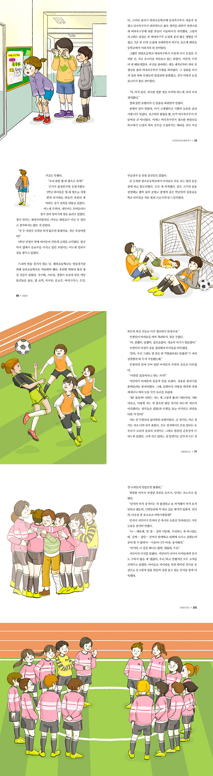 --- p. 36 지민이는 마음속으로 한 팀과 열한 명의 차이가 뭘까 생각하고 있었다. 분명, 축구에서 한 팀은 열한 명인데 말이다. 둘의 차이는 알 수 없었다. 다만, 지민이는 ‘열한 명’보다 ‘한 팀’이라는 말이 더 좋다는 생각이 들었다. --- p. 37 “자, 한 발 더 뛰어 한 발씩! 집중해! 서로 말 많이 하고!” --- p. 73 “우리 도내 학교스포츠클럽 축구 대회 규정상 천재지변과 같은 부득이한 상황이 없는 한 경기 시각은 반드시 지키게 되어 있다. 만일 한 팀이 지각하는 경우, 먼저 도착한 팀이 최소한 10분은 기다리는 것을 원칙으로 하고 있지. 10분을 기다려도 도착하지 않는 경우 몰수패를 선언할 수 있으며, 몰수패는 3대0을 의미한다.” --- p. 121 “어제 내가 여자축구 영상을 봤는데, 시작하자마자 중앙선에서 슛을 날리고 시작하는 것도 괜찮겠더라고.” “그래도 돼? 킥오프 할 때?” “어, 상관없던데? 약간 골키퍼 키가 작으면 머리 위로 슛을 날리고 시작하는 거지.” --- p. 124 경기가 열리는 운동장은 열기가 대단했다. 아이들 눈이 휘둥그레졌다. 검은색 진짜 심판복을 입고 있는 주심, 노란색 깃발을 들고 있는 부심과 기온, 시간, 점수까지 한 번에 표시되는 전자식 점수판. 이곳저곳에 걸린 필승을 다짐하는 현수막들, 제각각의 유니폼 색으로 모여 뭐라 뭐라 구호를 외치며 워밍업을 하고 있는 여러 초등학교의 선수들까지. --- p. 130 “재밌었어. 축구 진짜 잘하더라.” 그라운드에 누워 흐느껴 울고 있는 하선연에게 지민이가 손을 내밀었다. 하선연은 지민이의 손을 잡고 일어섰다. 지민이는 함께 울고 있었다. 대회를 위해 얼마나 힘들고 어려운 시간을 겪었을지 잘 알기 때문이었다. 두 팀은 중앙선을 기준으로 서서 서로에게 정중하게 인사를 하고 운동장을 한꺼번에 빠져 나왔다. --- p. 145 |