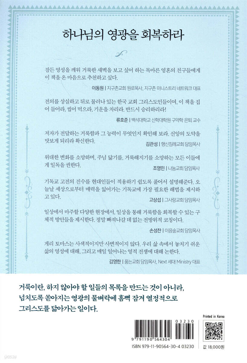 게리 토마스는 사색적이지만 사변적이지 않다. 삶 속에서 놓치기 쉬운 삶의 영성에 대해, 그리고 매일 일어나는 영적 전쟁에 대해 논한다. - 김영한 (품는교회 담임목사, Next 세대 Ministry 대표)