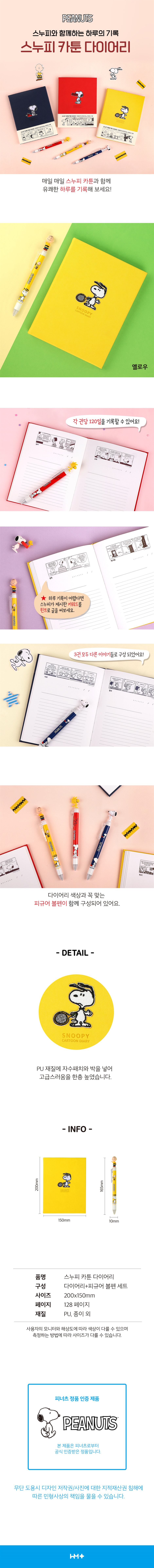 잔잔한 감동과 웃음이 있는 스누피 카툰 다이어리 3종 출시! 〈피너츠〉는 반세기가 넘는 시간 동안 전 세계 사람들의 사랑을 받아온 애니메이션이다. 엉뚱한 몽상가 스누피와 그의 주인 찰리브라운, 다소 까칠하지만 반전 매력의 소유자 루시, 꼬마 철학가 라이너스까지, 피너츠의 등장인물들은 하나하나 사람들의 기억에 남을 만큼 개성만점의 사랑스러운 친구들이다. 『스누피 카툰 다이어리』는 저자 찰스 슐츠가 오랜 기간 동안 연재한 피너츠 코믹 스트립에서 각 캐릭터들의 성격이 잘 드러난 에피소드로 구성하였다. 한 컷짜리 짧은 만화 속에 잔잔한 감동과 웃음이 섞여 있고, 예상치 못한 결말의 진한 여운이 두고두고 뇌리에 남아 있다. 이것이 전 세계인의 마음을 훔친 피너츠만의 사랑스러운 매력이다. 다이어리의 매 페이지마다 피너츠 친구들의 일상을 카툰 형식으로 담았고, 그 아래 나의 하루를 기록할 수 있도록 구성하였다. 또한 스누피, 찰리브라운, 우드스탁의 피규어가 달린 귀여운 펜이 함께 구성되어 피너츠 펜들에게 좋은 선물이 될 것이다. |