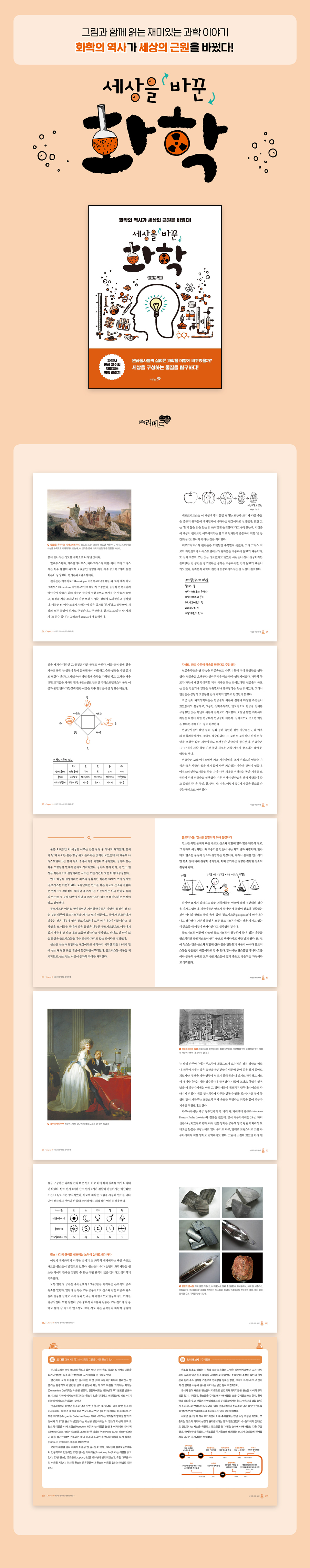 들어가는 글 Chapter 1 세상은 무엇으로 만들어졌을까? | 물질 이론과 원소 세상을 구성하는 단 하나의 물질을 찾아서 세상이 물, 불, 공기, 흙으로 이루어졌다고? 플라톤과 아리스토텔레스, 네 뿌리를 재해석하다 자비르, 황과 수은이 금속을 만든다고 주장하다 원소 종류가 수십 가지나 된다고? 과학자들, 물질을 계속해서 쪼개다 Chapter 2 과학, 연금술에서 실험을 받아들이다 | 실험과 근대 화학 금을 만들고 싶었던 연금술사들 신비주의적인 연금술이 자연을 분석하는 화학으로 바뀌다 근대 유럽, 과학에 실험을 도입하다 실험 도구, 과학 발견에서 핵심적인 역할을 맡다 실험, 공평하고 객관적인 지식을 생산하는 방법 Chapter 3 모든 것을 태우는 불의 정체 | 연소와 기체 플로지스톤, 연소를 설명하기 위해 등장하다 공기가 단일한 원소가 아니라는 사실이 밝혀지다 프리스틀리, 플로지스톤 없는 공기를 발견하다 라부아지에, 물체를 연소시키는 기체에 산소라는 이름을 붙이다 라부아지에의 명명법, 과학의 언어가 되다 Chapter 4 원소를 정리하는 방법을 만들다 | 주기율표 그림으로 그리던 원소 표기가 문자로 바뀌다 원소 사이의 규칙을 찾으려는 노력이 실패로 돌아가다 멘델레예프, 원소를 정리해 주기율표를 만들다 원자를 배열하는 기준이 달라지다 주기율표, 화학 발전의 이정표가 되다 Chapter 5 생명의 근원, 물을 탐구하다 | 분자 구조 기체 연구를 통해 물이 원소라는 믿음이 깨지다 물질의 결합 비율은 언제나 일정하다 원자가 결합한 분자의 개념이 탄생하다 수소와 산소가 전자를 공유해 결합하다 물의 비밀, 생명을 이해하는 길 Chapter 6 작은 알갱이가 구름 모양이 되기까지 | 원자 모형 데모크리토스, 세상을 구성하는 가장 작은 입자를 가정하다 돌턴이 원자설을 다시 세워 연구 기반을 다지다 톰슨, 음극선 연구로 전자를 발견하다 태양계를 닮은 러더퍼드의 원자 모형 보어, 전자가 궤도를 따라 핵을 도는 모형을 만들다 양자역학이 원자 모형을 구름 모양으로 바꾸다 Chapter 7 작은 입자가 위험한 폭탄으로 | 핵반응과 원자 폭탄 물체를 통과하는 강력한 광선, 엑스선을 발견하다 동위 원소, 성질은 같은데 질량은 다르다 페르미, 중성자를 이용해 새로운 물질을 만들다 원자 폭탄 개발을 위한 비밀 프로젝트, 맨해튼 프로젝트 핵물리학, 전쟁을 넘어 다양한 영역으로 뻗어가다 참고 자료 사진 출처 |