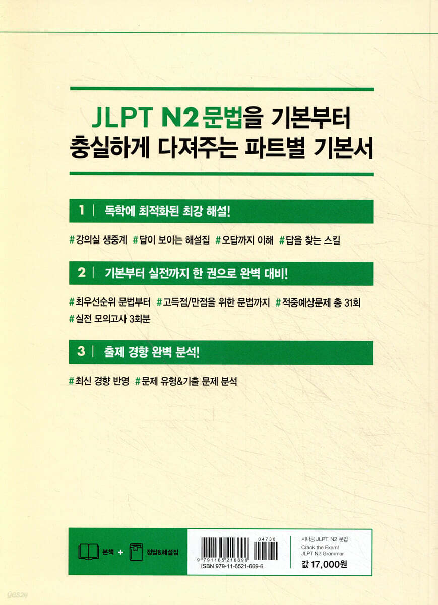 충실하게 다져주는 파트별 기본서! 1. 독학에 최적화된 상세한 설명! #최우선순위 문법부터 #고득점/만점을 위한 문법까지 #강의실 생중계 시험에 잘 나오는 N2 핵심 문법만 모아, 최우선순위 문법부터 고득점/만점을 위한 문법까지 15개의 시나공 문법으로 꼼꼼하게 정리했습니다. 풍부하게 수록된 예문으로 해당 문법이 어떻게 쓰이는지 확인할 수 있으며, ‘강의실 생중계’ 코너를 통해 현장 강의를 그대로 옮긴 듯 상세한 문법 해설을 맛볼 수 있습니다. 오랫동안 현장에서 일본어시험 전문으로 강의한 저자의 경험과 노하우가 이 책 한 권에 농축되어 있습니다. 2. 예상문제 31회, 모의고사 3회분으로 완벽한 실전 대비! #시나공 확인문제 #적중예상문제 총 31회 #실전 모의고사 3회분 중간중간 학습한 내용을 확인할 수 있는 ‘시나공 확인 문제’, 실제 시험 문제를 100% 분석하여 출제한 ‘적중 예상문제’, 각 마당 학습이 끝난 후 다시 한번 정리하는 ‘총정리 적중 예상문제’, 실전과 똑같은 형태의 ‘실전 모의고사 3회분’을 실었습니다. 실제 시험과 같은 형식의 문제를 많이 풀어보면서 실전에 강해지세요! 3. 오답까지 이해할 수 있는 최강 해설집! #답이 보이는 해설집 #오답까지 이해 #답을 찾는 스킬 #책속의책 왜 답이 되는지, 왜 답이 될 수 없는지 상세한 해설을 통해 문제 풀이 요령과 스킬을 터득할 수 있습니다. 출제 포인트&난이도 표시부터 꼼꼼한 어휘 정리까지 독학 학습자에게 필요한 포인트 정보를 보기 쉽게 정리했습니다. 또한 해설집에도 문제를 실어 해설을 가리고 문제를 한 번 더 풀어보며 효과적으로 복습할 수 있게 설계했습니다. 책을 펼쳐서 시나공만의 특별한 해설집을 경험해보세요! ※ 이 책은 2010년에 출간된 《시나공 JLPT 일본어능력시험 N2 문법》의 개정판입니다. 최신 경향에 맞춰 기출 문법을 새롭게 반영하고, 문제 해설을 확충하였으며, 실전 모의고사 1회분을 추가 편성하였습니다. 현장 강의를 듣는 것처럼 상세한 설명으로 무장한 2021년 개정판을 만나보세요! 본문 구성 미리보기 ① 한눈에 미리 보기 각 시나공 문법에서 배울 문법과 해석을 학습에 앞서 한눈에 확인할 수 있습니다. 공부 시작하기 전에 알고 있는 문법이 어느 정도인지 미리 체크해볼 수 있습니다. ② 시나공 문법 소개 이 책은 시나공 01에서 시나공 15까지 총 15개의 시나공 문법으로 구성되어 있습니다. 각 시나공 문법에서 배울 학습 내용을 간단하게 요약 정리해두었습니다. ③ 시험에 이렇게 나온다! 각 시나공 문법에 대한 소개와 문제 유형을 살펴볼 수 있도록 예시 문제를 실었습니다. 본 학습 전에 가볍게 풀어보면서 정답 찾기 요령을 익혀보세요. ④ 문법 설명 각 문법의 접속형태와 의미를 정리했으며 예문과 예문에 나오는 어휘까지 꼼꼼하게 실었습니다. ⑤ 강의실 생중계! 현장 경험을 토대로 선생님만의 문제 풀이 비법을 실었습니다. 시험에 출제되는 형태, 학습 시 주의할 점, 정답을 찾는 포인트 등 강의실에서만 들을 수 있는 내용을 생생하게 공개합니다! ⑥ 시나공 확인 문제 학습 진행 사이사이에 문제를 실었습니다. 적중 예상 문제 풀이에 앞서 간단하게 문제 형태를 익히고 학습한 내용을 확인해볼 수 있습니다. ⑦ 적중 예상 문제 실전에 강해지려면 실제 시험과 같은 형식의 문제를 풀어보는 것이 가장 좋습니다. 문제를 푼 다음에는 예문을 통째로 암기해보세요. 학습 효과 100%입니다. ⑧ 총정리 적중 예상 문제 각 마당 학습이 끝난 후에 다시 한번 총정리하기 위한 문제입니다. 모의고사 전 단계의 확인 학습 과정이라고 생각하시고 집중해서 풀어보세요. ⑨ 실전 모의고사 3회분 실전과 똑같은 형태의 실전 모의고사 3회분을 실었습니다. 실전처럼 시간을 체크하면서 시험 직전에 풀어보세요. [책속의책] 정답&해설집 ① 문제 문제를 한 번 더 풀어볼 수 있도록 정답 & 해설집에도 문제를 실었습니다. 복습하면서 해설을 가리고 다시 한번 풀어보세요. ② 출제 포인트 & 난이도 표시 모든 문제에 출제 포인트를 제시하여 출제 의도를 파악할 수 있도록 했습니다. 또한 모든 문제에 ★로 난이도를 표기했습니다. ③ 해석 지문과 문제에 대한 한글 해석을 실었습니다. ④ 정답 찾기 상세한 해설로 정답 찾는 길을 알려줍니다. ⑤ 오답분석 나머지 선택지가 답이 안 되는 이유를 상세히 설명했습니다. ⑥ 복습 꼭! 문제에서 핵심이 되는 문법을 한 번 더 짚어줍니다. ⑦ 어휘 지문과 문제에 나온 단어들을 꼼꼼하게 정리하였습니다. |