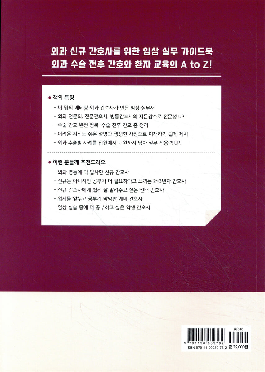 외과에 발령받은 선생님들이 수술환자 간호를 할 때 정말 많은 도움이 될 만한 책이라고 생각이 들었습니다. 수술 전 준비부터 수술 후 간호, 합병증 간호, 퇴원까지 아우를 수 있는 내용이 포함되어 있어 내용을 잘 참고하고 정리한다면 실무에 많은 도움이 될 수 있을 것 같습니다. - 석지혜 (삼성서울병원 외과 병동 10년 차 간호사)