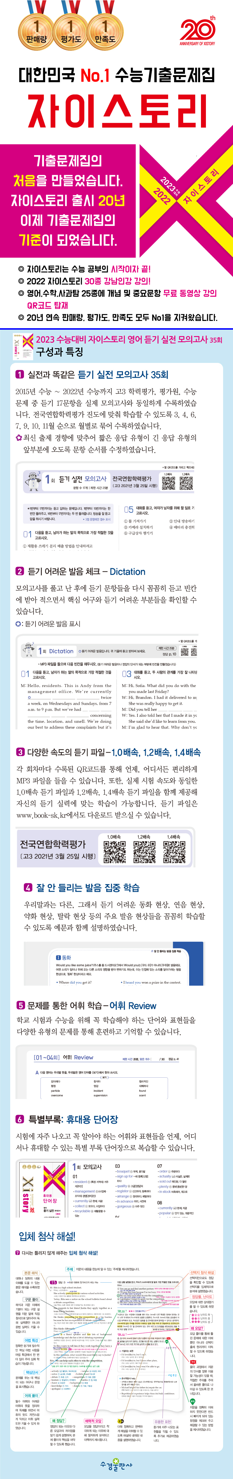 - 최신 출제 경향에 맞춘 문항 배열 수정 (2020~2015년 실시 시험) · 회차별 딕테이션 + 듣기 어려운 발음 훈련 · 다양한 문제로 외우는 기출 어휘 리뷰 7회 · 직독직해, 정답의 근거, 매력적 오답 분석 꼼꼼한 해설 · 함정, 주의, 꿀팁, 어법 특강 입체 첨삭 해설 · 1.0배속, 1.2배속, 1.4배속 QR코드 및 MP3 파일 제공 (www.book-sk.kr) · [특별부록] 휴대용 단어장 본 교재의 추천학생은 다음과 같습니다. · 2023 수능을 준비하는 수험생 · 듣기 집중 훈련으로 듣기 실력 능력 향상을 원하는 고2, 고3 수험생 · 첨삭 해설, 왜 정답, 왜 오답으로 자기 주도 학습을 원하는 수험생 |