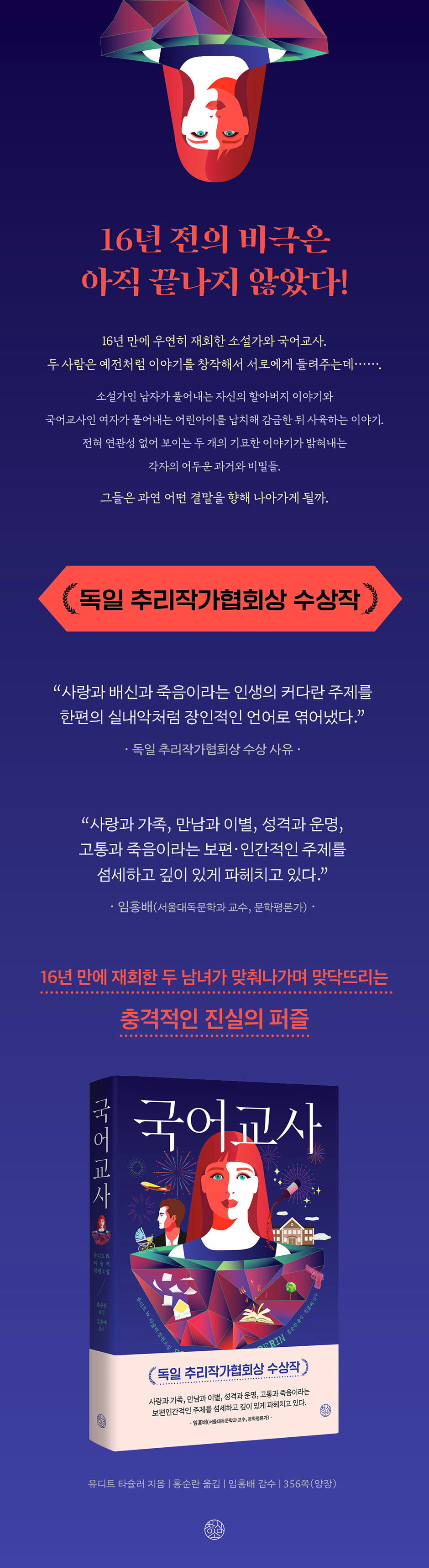 오스트리아의 유명 청소년문학 작가 크사버 잔트는 어느 날 중학교 학생들을 대상으로 한 글쓰기 워크숍의 강사로 초청받는데. 프로그램을 맡은 여교사와 메일을 주고받던 크사버는 여교사가 16년 전 헤어진 옛 연인 마틸다라는 사실을 알게 된다. ‘천사 3부작’의 성공으로 무명작가에서 유명작가로 신분 상승을 하자 아무런 통보도 없이 사라져 대부호의 딸과 결혼한 크사버. 그 충격으로 실어증에 걸려 오랜 시간 병원 신세까지 져야 했던 마틸다. 16년 만에 우연히 재회한 크사버와 마틸다는 기묘한 이야기를 상대방에게 들려주기 시작하는데……. 크사버가 풀어내는 이야기는 자신의 외할아버지인 리하르트에 관련된 이야기이다. 돈을 벌기 위해 떠난 미국에서 만난 사랑하는 여인과 1차 세계대전으로 인해 파괴된 집안을 일으키기 위해 고향으로 돌아왔다가 사귀게 된 또 다른 여인. 인생의 갈림길 앞에서 고뇌하던 리하르트의 선택과 그로 인해 완전히 달라진 인생의 향방을 통해 크사버가 이야기하고자 하는 것은 무엇일까? 마틸다가 풀어내는 이야기는 한층 더 기묘하다. 어린아이를 납치해 지하실에 감금한 뒤, 언어를 가르치지 않으며 사육하는 한 여자교사의 이야기인 것. 전혀 연관성 없어 보이는 두 이야기이지만, 일련의 사건들을 기술하는 과정에서 이야기들은 기묘하게 얽혀들기 시작한다. 과연 얼키설키 엮인 사건들의 진실을 각자의 이야기를 통해 풀어내는 그들 앞에는 어떤 결말이 기다리고 있을까? 우리의 삶은 언제나 불확실하다. 따라서 현재의 선택 역시 불완전할 수밖에 없고, 우리는 잘못된 선택으로 많은 순간 후회하게 된다. 한때 죽을 만큼 사랑했으나 잘못된 선택으로 이별한 두 연인이 잃어버린 시간의 퍼즐을 맞춰가며 다시 사랑을 되찾고 진정한 화해와 인간적 성숙에 이르는 여정을 따라가는 것을 보며 우리는 어떤 것을 알게 될까? 추리소설임에도 슬프고도 아름다운 『국어교사』가 그에 대한 단서를 제공할 것이다. |