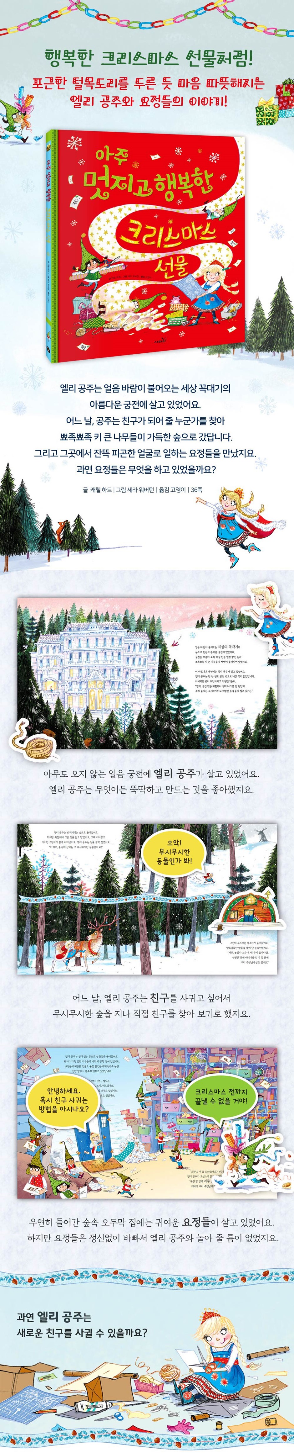 《아주 멋지고 행복한 크리스마스 선물》은 제목 그대로 아이들이 가장 좋아하는 ‘크리스마스’와 ‘선물’에 대한 이야기를 담고 있어요. 크리스마스는 아이들이 기다리는 날이고, 그만큼 크리스마스 선물은 어린 시절의 소중한 기억으로 남게 되지요. 주인공 엘리 공주는 친구를 찾아 숲속을 걸어가다 우연히 요정들의 집으로 가게 됩니다. 그리고 바쁘디 바쁜 요정들을 위해 다양한 발명품을 만들어 도와주지요. 그것도 아무도 모르게 말이에요. 산타 할아버지는 요정들을 남모르게 도와준 엘리 공주를 칭찬하며, 어떤 크리스마스 선물을 원하냐고 묻습니다. 그러자 엘리 공주는 멋진 장난감이나 예쁜 드레스가 아니라 함께 놀 ‘친구’를 원했어요. 그런데 깨닫지 못하는 사이, 엘리 공주에게는 이미 많은 친구들이 있었답니다. 엘리 공주는 많은 친구들 외에도 특별한 크리스마스 선물을 하나 더 받았어요. 멋진 작업실과 멋진 공구들이었지요. 왕과 왕비는 지금껏 부모로써 바라던 공주의 모습이 아니라, 있는 그대로의 공주를 받아들이게 되었어요. 그리고 엘리 공주가 남다른 재능으로 다른 이들을 도와준 사실을 자랑스러워했지요. 이 그림책을 보면 크리스마스 시즌이 아닌 때에도 온 세상이 사랑으로 가득한 크리스마스의 행복한 분위기를 느낄 수 있어요. 그리고 무엇보다 값진 선물은 따뜻한 관심과 사랑이라는 것을 마음 가득 느낄 수 있답니다. 누리과정 의사소통 영역과 연계된 우리 아이에게 꼭 필요한 그림책! 《아주 멋지고 행복한 크리스마스 선물》은 누리과정 5개 영역 가운데 「의사소통」 영역과 연계된 그림책입니다. 아이들은 자신의 존재감을 나타내기 위해 다양한 행동과 말들로 친구들에게 표현합니다. 이 책에는 엘리 공주뿐 아니라, 숲속에 숨어 있는 무시무시한 동물들, 산타클로스의 집에서 열심히 일하는 요정들이 등장합니다. 그림 속 다양한 인물의 입장이 되어 이야기를 스스로 만들다 보면 의사소통 능력이 쑥쑥 자랄 거예요. 또한 ‘산타클로스 할아버지는 크리스마스 선물을 어떻게 배달할까?’ 하는 기분 좋은 궁금증을 통해 상상력도 풍부해집니다. 이 책은 ‘똑똑 사파리펜’으로 책 읽는 재미를 한층 더 느낄 수 있습니다. 사파리펜으로 그림 속 등장인물을 눌러 보세요. 생생한 효과음과 함께 숨겨진 또 다른 이야기가 펼쳐집니다. 책장에 숨어 있는 엘리 공주를 찾아 사운드펜을 누르면 숨은그림찾기 놀이를 하듯 책을 읽을 수 있어요. 엄마 아빠가 읽어 주지 않아도 처음부터 끝까지 친절하게 읽어 주지요. 문장별로도 들을 수 있어 글자를 배우는 시기에 많은 도움을 받을 수 있어요. |