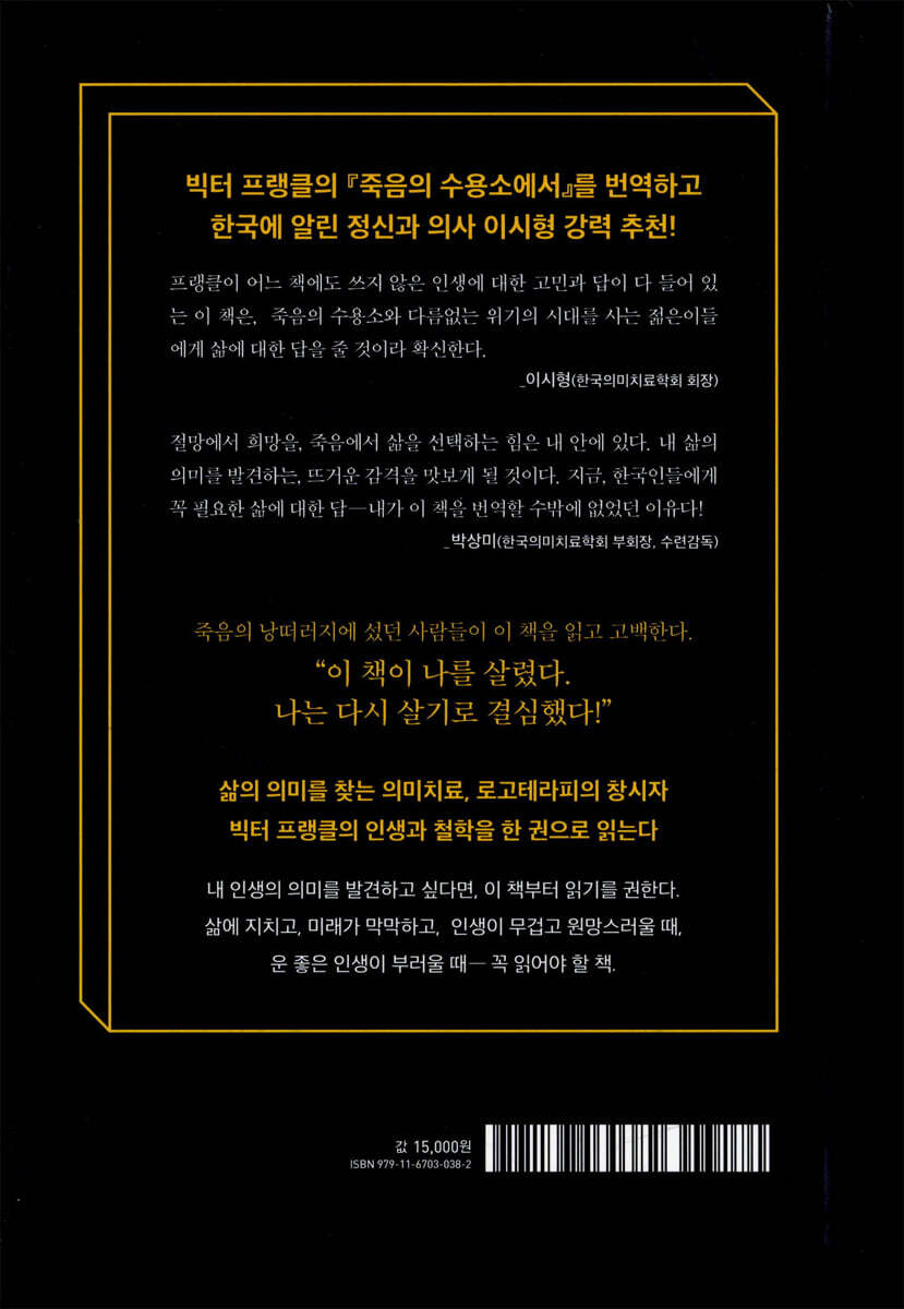프랭클이 어느 책에도 쓰지 않은 인생에 대한 고민과 답이 다 들어 있는 이 책은, 죽음의 수용소와 다름없는 위기의 시대를 사는 젊은이들에게 삶에 대한 답을 줄 것이라 확신한다. - 이시형 (한국의미치료학회 회장)