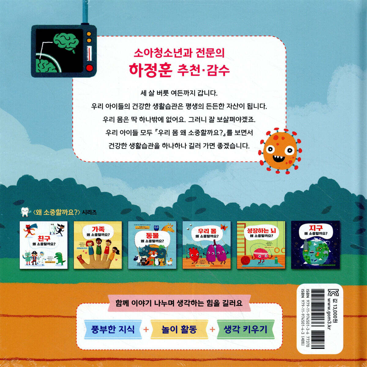 건강한 생활 습관을 길러 주는 그림책 아이들이 보는 애니메이션 속 캐릭터들은 넘어지고 다쳐도 금세 회복합니다. 또한, 아이들이 하는 게임 속 캐릭터들은 아이템을 통해 다시 살아나기도 하고, 강해지기도 하죠. 하지만, 현실을 살아가는 우리 몸은 평생 딱 하나뿐입니다. 아이가 다쳤을 때 남은 상처는 잘 아물기도 하지만, 흉터가 되어 영원히 남기도 하지요. 코로나 팬데믹으로 여느 때보다 자신의 몸을 지키는 게 중요한 시기. 열심히 손을 씻고 마스크를 쓰는 우리 아이는 과연 ‘왜 몸을 지켜야 하는지’ 알고 있을까요? 『우리 몸 왜 소중할까요?』는 자기 몸을 건강하게 지켜야 하는 이유를 분명하게 알려 주며, 아이가 스스로 건강한 생활 습관을 길러 나갈 수 있도록 돕습니다. 소아청소년과 전문의 하정훈 추천·감수 평생 소중한 우리 몸을 위한 건강한 생활 습관 당근을 먹지 않는 입 짧은 우리 아이, 늦은 시간까지 잠자리에 들지 않고 깨어 있는 우리 아이, 어떻게 도와줄 수 있을까요? 『우리 몸 왜 소중할까요?』는 음식을 골고루 먹어야 하는 이유부터, 성장하는 아이들이 더 일찍 자야 하는 이유를 친절하게 알려 줍니다. 더불어 여느 때보다 중요한 성장기, 아이 스스로 몸이 보내는 신호에 귀를 기울이고, 필요한 것을 표현하는 방법을 배울 수 있도록 돕습니다. 소아청소년과 전문의 하정훈 선생님은 아이들이 『우리 몸 왜 소중할까요?』를 통해 딱 하나밖에 없는 우리 몸을 잘 보살피는 방법을 배우고, 평생의 든든한 자산이 되는 건강한 생활 습관을 만들어 나가기를 추천합니다. 자신을 소중히 여기는 아이, 그리고 믿을 수 있는 어른을 위한 특별한 그림책 자신의 몸을 소중하게 여길 줄 아는 아이는, 몸뿐만 아니라 자신의 마음과 생각을 살필 줄 아는 사람으로 성장합니다. 그리고 이런 건강한 마음을 지닌 아이의 곁에는 ‘믿을 수 있는 어른’인 좋은 보호자가 함께하지요. 우리 아이, 병균으로부터 몸의 건강을 지키고 부정적인 생각으로부터 마음의 건강을 지킬 줄 아는 사람으로 자라기를 바라시나요? 『우리 몸 왜 소중할까요?』는 아이가 몸과 마음을 지키는 책임감, 꾸준히 건강을 관리하는 성실함, 그리고 자신을 귀하게 여기는 자존감을 기를 수 있도록 함께 합니다. 다양한 활동으로 재밌게 배우는초등 교과, 누리 과정 맞춤형 놀이배움지 『우리 몸 왜 소중할까요?』는 아이들이 그림책과 연계된 다양한 활동을 통해 내용을 더욱 깊이 이해할 수 있도록 돕는 ‘놀이배움지’를 제공합니다. 놀이배움지는 초등 교과용과 누리 과정용 두 가지 종류로, 초등 교과 과정의 6대 핵심 역량과 누리 과정 5대 영역에 기반한 활동이 6개씩 수록되어 있습니다. 인쇄되어 제공되는 놀이배움지 외에도 곰세마리 홈페이지를 통해, 놀이배움지 활용 가이드와 지속적으로 업데이트되는 다양한 활동을 다운로드할 수 있습니다. 아이들이 교육기관과 가정 어디에서나 그림책을 능동적으로 즐길 수 있도록 제공되는 놀이배움지는 교사와 학부모가 아이들의 내면적인 성장과 통합적인 사고력을 교육할 수 있도록 돕습니다. ※누리 과정 - 신체운동·건강 영역 | 초등 교과 - 자기관리 역량※ |