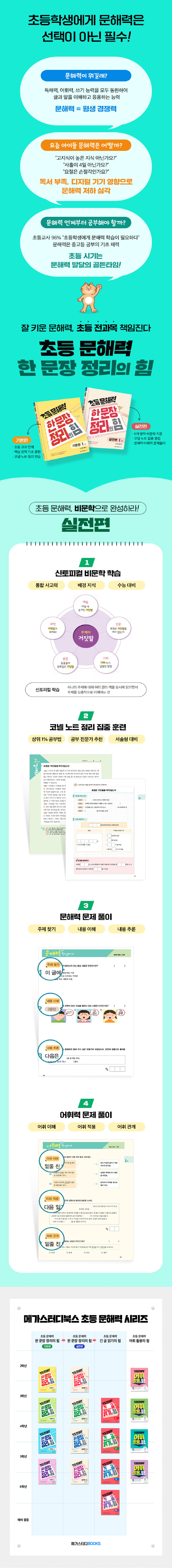 『초등 문해력 한 문장 정리의 힘 실전편』이 특별한 이유 3가지! (1) 6개 영역의 비문학 지문으로 ‘통합적 사고력 향상’ 예술, 인문, 사회, 기술, 융합, 과학으로 구성된 6개 영역의 비문학 지문을 읽으며 배경지식을 확장할 수 있습니다. 1주차 학습에 5개의 지문이 하나의 주제어로 연결되어 있어 통합적 사고력을 기를 수 있습니다. (2) 상위 1% 노트 포맷으로 ‘핵심 내용 정리 훈련’ 실전편에서 더욱 업그레이드된 노트 포맷에 핵심 내용을 정리하고 한 문장으로 요약하는 과정을 훈련하며 효율적인 공부 방법과 문해력을 기릅니다. (3) 문해력?어휘력 실전 문제를 통한 ‘문해력 4주 완성’ 노트에 정리하여 내 것으로 만든 지식을 바탕으로, 6가지 유형의 문해력?어휘력 실전 문제를 통해 초등 문해력을 완성할 수 있습니다. |