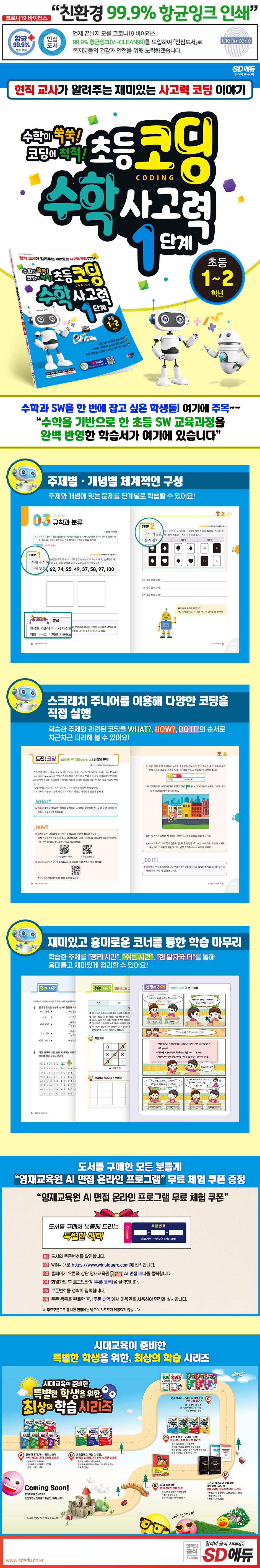 요즘 이 단어들을 빼놓고 미래 사회에 대해 이야기하기란 쉽지 않습니다. 인공지능이 일상 곳곳에 스며들고, 점점 더 많은 사람들이 코딩에 관심을 가지고 있습니다. 또한, 최첨단 융합기술이 여러 매체에서 화려하게 소개되고 있습니다. 기술의 발전에 따라 우리 사회의 구조도 이전과는 다른 모습으로 변화하고 있습니다. 앞으로 10년, 20년, 30년 뒤 우리는 어떤 세상에 살고 있을까요? 기술은 계속하여 발전하고, 그에 따라 사회는 끊임없이 변화합니다. 이러한 변화무쌍한 미래 사회에 적응하기 위해 우리는 어떻게 해야 하고, 어떤 능력을 길러야 할까요? 2015 교육과정에서는 SW 교육(소프트웨어 교육)이 도입되고 있습니다. 미래 사회를 대비한 현재의 소프트웨어 교육은 ‘정보와 컴퓨팅 소양을 갖추고 더불어 살아가는 창의·융합적인 사람’을 기르고자 합니다. 여기서 창의·융합적인 사람은 자신이 가진 ‘컴퓨팅 사고력’을 활용하여 여러 문제를 해결할 수 있는 창의·융합적 능력과 협력적 태도를 가진 사람입니다. 사고력이란 무엇이고 어떻게 기를 수 있을까요? 사고력을 기르기 위해 우리는 내가 알고 있는 지식을 동원하여 문제를 해결하는 과정을 거쳐야만 합니다. 문제를 구조화하고, 추상화하고, 분해하고, 모델링 해 보는 과정을 거치며, 문제 해결에 필요한 알고리즘을 구합니다. 문제를 해결하기 위해 알고리즘을 적용하고 수정하는 과정에서 사고의 세계는 끊임없이 확장됩니다. 이 책은 코딩의 개념이 살며시 녹아든 창의사고 수학 문제들을 학생들이 풀어 보면서 사고력을 기르는 것을 궁극적인 목표로 삼고 있습니다. 문제에는 컴퓨팅 시스템, 알고리즘, 프로그래밍, 자료, 규칙성 등이 수학과 함께 녹아 들어 있습니다. 다양한 문제를 해결해 보는 과정에서 사고력이 자라나는 상쾌한 자극을 느껴 보세요. 문제에 대해 고민하고, 해결을 시도하고, 방법을 수정하고, 완성하며 여러분의 사고력 나무가 쑥쑥 자라 미래 사회 그 어디에서도 적응할 수 있는 든든한 기둥으로 자리매김하기를 바랍니다. |