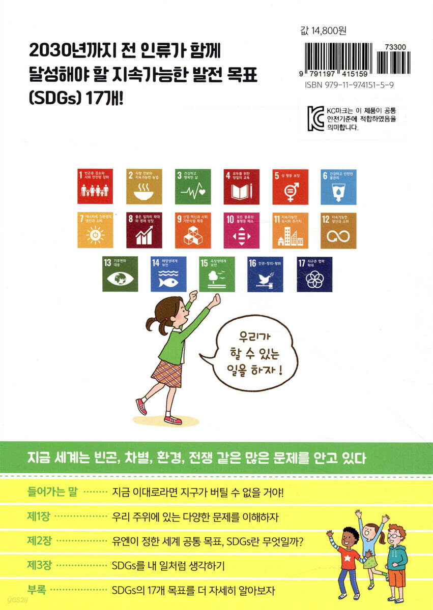 제1장 우리 주위에 있는 다양한 문제를 이해하자 1 세계에는 학교에 다니지 못하는 어린이들이 많이 있어 2 코로나바이러스가 나타난 것은 사람 탓 3 굶는 사람이 있는 한편 음식을 버리는 사람도 있어 4 하루에 약 2,000원으로 사는 사람이 7억 3,666만 명이나 있어 5 1억 4,400만 명은 더러운 호숫물이나 강물을 써야 해 6 많은 동식물이 사라지고 있어 7 환경이 파괴되며 지구온난화가 심각해지고 있어 8 인간은 돈을 벌기 위해 소중한 것을 희생해 왔어 9 기업이 만들어낸 공해로 지금도 많은 사람이 고통받고 있어 10 아동 노동으로 만드는 유명 기업의 상품들 11 세계적 기업이 일으킨 노동 문제 12 환경과 인권을 무시하면 사람들이 외면하게 될 거야 13 나는 부족한 것이 없으니까 주위는 아무래도 좋을까 14 똑같이 지구에서 태어났는데 이렇게 차이가 있어도 괜찮아 15 지금부터 지구에 사는 다른 누군가가 되어야 한다면 COLUMN 태국에는 성별이 18개나 있다고!? 제2장 유엔이 정한 세계 공통 목표, SDGs란 무엇일까 1 SDGs(지속가능발전목표)란 2 SDGs에는 17개의 목표와 169개의 세부 목표가 있어 3 ‘지속가능’이 무슨 뜻이야? 4 왜 SDGs를 달성하려고 노력해야 할까? 5 SDGs의 ‘다섯 개의 P’란 6 이대로는 SDGs를 달성하기 힘들어 7 SDGs의 기초가 된 MDGs(새천년개발목표) 8 모두가 SDGs 관계자 9 SDGs는 다양한 문제를 동시에 해결한다 10 할 수 있는 일부터 시작하자 11 우리나라의 SDGs 달성률은 세계 18위 COLUMN 신토불이가 SDGs에 도움이 된다? 제3장 SDGS를 내 일처럼 생각하기 1 이대로는 나쁜 일이 일어나는 걸까 2 SDGs 달성을 위해 노력하지 않아도 벌칙은 없지만 3 SDGs는 사업에 공헌한다 4 그레타가 어른들에게 분노하는 이유 5 남을 탓하지 말고 내가 할 수 있는 일을 생각하자 6 누가 만드는지 생각해 본 적 있어 7 윤리적 소비를 생각하자! 8 미래를 위해 지금 해야 할 일을 하자! 9 목표 달성을 위해 무엇이 필요한지 생각하자 10 할 수 있는 것, 할 수 있어 보이는 것부터 해보자 11 할 수 있는 일 레벨 1: 소파에 앉아서 할 수 있는 일 12 할 수 있는 일 레벨 2: 집에 있으면서 할 수 있는 일 13 할 수 있는 일 레벨 3: 집밖에서 할 수 있는 일 14 할 수 있는 일 레벨 4: 직장(학교)에서 할 수 있는 일 15 ‘좋은 일을 하자’는 마음만으로는 지속할 수 없는 일도 있어 16 SDGs를 이용한 이미지 세탁은 안 돼! 17 가족들에게 SDGs를 위한 사회의 노력을 물어보자! 18 어른들에게 요구하자! ‘어린이를 생각해 주세요’ COLUMN 학교 급식에서 식품 손실을 줄이자 부록 SDGs의 17개 목표를 더 자세히 알아보자 SDGs의 17개 목표를 더 자세히 알아보자 목표 1 ~ 목표 17 SDGs와 관련된 유용한 사이트 SDGs를 즐겁게 배울 수 있는 편리한 도구들 |