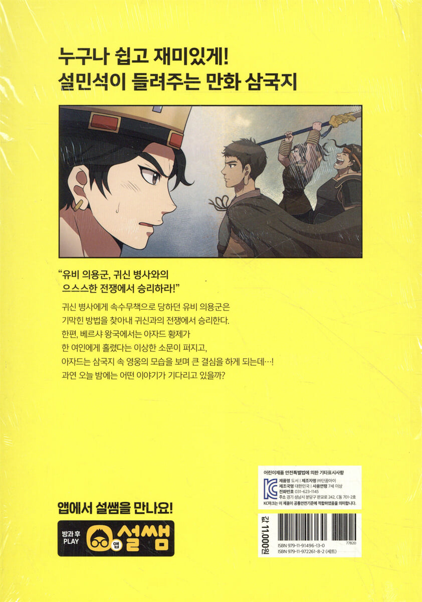 삼국지를 난생 처음 읽는 독자를 위해, 방대한 내용을 핵심적으로 담았습니다. 복잡한 이름, 반복되는 사건은 간결하게 정리하여 삼국지를 그 누구보다 쉽고 재미있게 설민석 선생님이 들려드립니다. 2. 눈길을 사로잡는 색다른 그림 웹툰 명가 ‘재담미디어’ 산하의 〈스튜디오 담〉이 각색과 작화에 참여하여, 새로운 스타일의 만화 『삼국지 대모험』이 탄생했습니다. 생동감 넘치는 캐릭터와 그림이 요즘 어린이의 눈길을 사로잡습니다. 3. 놀라운 상상력으로 탄생한 새로운 인물 ‘유비, 관우, 장비’ 같은 영웅뿐만 아니라, 삼국 시대를 살았던 평범한 사람들이 이름을 가지고 등장합니다. 상상력으로 탄생한 새로운 인물을 지켜보며 이야기에 더욱 공감하고 몰입해 보세요. 4. 이야기 속의 또 다른 이야기! 삼국지 이야기를 실감나게 들려주는 ‘마람카’, 그 이야기에 점점 빠져드는 어린 황제 ‘아자드’! 마람카와 아자드에게 무슨 일이 벌어지고 있는 걸까요? 두 사람의 긴장감 넘치는 이야기는 또 다른 기대를 불러일으킵니다. 5. 꼼꼼하게 담은 권말 역사 정보 삼국지의 배경이 되는 실제 인물과 사건 등 배경 지식과 정보를 꼼꼼하고 정확하게 담았습니다. 『삼국지연의』와 비교하여 이 책에서만 볼 수 있는 이야기도 살펴볼 수 있습니다. 또한 「정사 삼국지」 내용까지 간략하게 비교한 표를 수록하여, 방대한 내용의 삼국지 정보를 한눈에 볼 수 있습니다. |