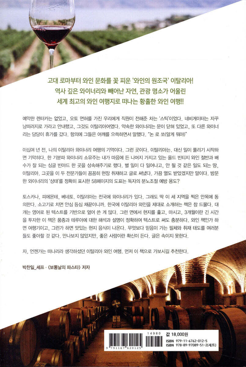 이십여 년 전, 나의 이탈리아 와이너리 여행의 기억이다. 그런 곳이다. 이탈리아는. 대신 일이 풀리기 시작하면 기막히다. 한 기분파 와이너리 소유주는 내가 마음에 든 나머지 가지고 있는 올드 빈티지 와인 절반과 배수가 잘 되는 싱글 빈야드 한 곳을 상속해주기로 했다. 별 일이 다 일어나고, 안 될 것 같은 일도 되는 땅, 이탈리아. 그곳을 이 두 전문가들이 꼼꼼히 현장 취재하고 글로 써냈다. 가끔 열도 받았겠지만 말이다. 방문한 와이너리의 ‘상태’를 정확히 표시한 58페이지의 도표는 독자의 분노조절 예방 용도? 토스카나, 피에몬테, 베네토. 이탈리아는 전국에 와이너리가 있다. 그래도 딱 이 세 지역을 찍은 안목에 동의한다. 소고기로 치면 안심 등심 채끝이니까. 한국에 이탈리아 와인을 제대로 소개하는 책은 참 드물다. 대개는 영어로 된 텍스트를 기반으로 엎어 쓴 게 많다. 그런 면에서 현지를 훑고, 마시고, 3개월이란 긴 시간을 투자한 이 책은 품종과 테루아에 대한 해석과 설명이 정확하여 텍스트로 써도 충분하다. 와인 책인가 하면 여행기이고, 그런가 하면 맛있는 현지 음식이 나온다. 무엇보다 믿음이 가는 필체와 취재 태도를 여러분들도 좋아할 것 같다. 만나보지 않았지만, 좋은 사람이란 확신이 든다. 글은 속이지 못한다. 자, 언젠가는 떠나리라 생각하셨던 이탈리아 와인 여행. 먼저 이 책으로 가보시길 추천한다. - 박찬일 (셰프,《보통날의 파스타》 저자) |