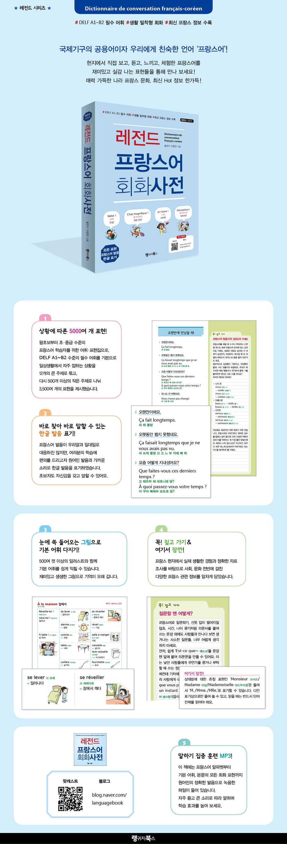 Unite 1 프랑스어 알파벳 Unite 2 프랑스어의 특징 Chapitre 1 첫 만남부터 당당히! Unite 1 인사 처음 만났을 때 때에 따른 인사 오랜만에 만났을 때 안부를 묻는 인사 안부 인사에 대한 대답 헤어질 때 인사 환영할 때 말 걸기 화제를 바꿀 때 Unite 2 소개 상대방에 대해 묻기 자기에 대해 말하기 개인 신상에 대해 말하기 소개하기 Unite 3 감사 감사하다 ① 감사하다 ② 감사 인사에 대한 응답 Unite 4 사과 사과하기 내가 잘못했을 때 타인이 잘못했을 때 사과에 대한 응답 Unite 5 대답 잘 알아듣지 못할 때 양해를 구할 때 긍정적으로 대답할 때 부정적으로 대답할 때 완곡히 거절할 때 기타 대답 맞장구칠 때 맞장구치지 않을 때 반대할 때 Unite 6 주의&충고 주의를 줄 때 ① 주의를 줄 때 ② 충고할 때 ① 충고할 때 ② Unite 7 기타 존경 칭찬 격려 부탁 재촉 긍정적 추측 부정적 추측 동정 비난 Chapitre 2 사소한 일상에서도! Unite 1 하루 생활 일어나기 씻기 식사 옷 입기&화장하기 TV 보기 잠자리 들기 잠버릇 숙면 꿈 Unite 2 집 화장실 사용 화장실 에티켓 욕실에서 거실에서 부엌에서 냉장고 요리하기 식탁에서 식사 예절 ① 식사 예절 ② 설거지 위생 청소 분리수거 세탁 집 꾸미기 Unite 3 운전&교통 운전 ① 운전 ② 주차 교통체증 교통 규정 위반 지하철 Unite 4 이사 부동산 집 구하기 부동산 조건 보기 부동산 계약하기 이사 계획 짐 싸기 이사 비용 정리 Unite 5 전화 전화를 걸 때 전화를 받을 때 전화를 바꿔 줄 때 다시 전화한다고 할 때 전화를 받을 수 없을 때 전화 메모 남기기 잘못 걸려 온 전화 전화를 끊을 때 전화 기타 Chapitre 3 정겨운 말 한마디! Unite 1 날씨&계절 날씨 묻기 일기 예보 맑은 날 흐린 날 비 오는 날 천둥&번개 봄 날씨 황사 장마 여름 날씨 태풍 가뭄 홍수 가을 날씨 단풍 겨울 날씨 눈 계절 Unite 2 명절&기념일 설날 주현절 추석 크리스마스 ① 크리스마스 ② 부활절 생일 ① 생일 ② 축하 Unite 3 음주 주량 술에 취함 술에 대한 충고 술에 대한 기호 금주 술 기타 Unite 4 흡연 흡연 담배 금연 ① 금연 ② Unite 5 취미 취미 묻기 취미 대답하기 사진 스포츠 계절 스포츠 구기 스포츠 음악 감상 악기 연주 미술 감상 영화 감상 영화관 가기 독서 취미 기타 Unite 6 애완동물 애완동물 ① 애완동물 ② 개 키우기 ① 개 키우기 ② 개 키우기 ③ 고양이 키우기 기타 애완동물 Unite 7 식물 가꾸기 식물 가꾸기 ① 식물 가꾸기 ② Chapitre 4 거울 속 내 모습! Unite 1 신체 신체 특징 체중 체격&기타 Unite 2 얼굴&피부 모습&얼굴 얼굴형 피부 피부 상태 Unite 3 이목구비 눈 ① 눈 ② 시력 코 귀 입&입술 입 관련 동작 구강 치아 관련 Unite 4 헤어스타일&수염 헤어스타일 헤어스타일&수염 Unite 5 스타일 스타일 ① 스타일 ② 닮았다고 말할 때 못생긴 외모 Unite 6 옷 옷 취향 옷차림 ① 옷차림 ② 옷차림 ③ Unite 7 화장 화장 ① 화장 ② 화장 ③ Chapitre 5 어디서든 당당하게! Unite 1 음식점 음식점 추천 식당 예약 예약 없이 갔을 때 메뉴 보기 주문하기 - 음료 주문하기 - 메뉴 고르기 주문하기 - 선택 사항 주문하기 - 디저트 불만 사항 요청 사항 맛에 대한 평가 계산 패스트푸드점에서 카페에서 기타 식당 관련 Unite 2 쇼핑 쇼핑하기 쇼핑몰 옷 가게 ① 옷 가게 ② 신발 가게 화장품 가게 구입 결정 시장 식료품점&마트 벼룩시장 할인 계산하기 할부 구매 환불&교환 Unite 3 병원&약국 진료 예약&접수 진찰실 외과 내과 - 감기 내과 - 열 내과 - 소화기 치과 - 치통 치과 - 충치 기타 진료 입원&퇴원 수술 병원비&의료보험 문병 처방전 약국 Unite 4 은행&우체국 계좌 개설 입출금 송금 현금인출기 사용 신용카드 환전 환율 대출 은행 기타 편지 발송 소포 발송 우체국 기타 Unite 5 도서관 도서관 도서 대출 도서 반납 연체&대출 연장 Unite 6 미술관&박물관 관람 안내 위치 설명 기념품 구입 미술관&박물관 기타 Unite 7 미용실 미용실 상담 커트 ① 커트 ② 파마 염색 네일 미용실 기타 Unite 8 세탁소 세탁물 맡기기 세탁물 찾기 세탁물 확인 얼룩 제거 수선 Unite 9 렌터카&주유소 렌터카 대여 렌터카 반납 주유소 ① 주유소 ② 세차&정비 Unite 10 서점 서점 책 찾기 ① 책 찾기 ② 책 찾기 ③ 도서 구입 인터넷 서점 헌책방 Unite 11 종교 기독교 교회 활동 교회 기타 활동 이슬람교 종교 기타 ① 종교 기타 ② Unite 12 놀이공원&헬스클럽 놀이공원 안내 놀이공원 이용 헬스클럽 등록 헬스클럽 이용 Unite 13 영화관&공연장 영화관 영화표 상영관 에티켓 콘서트장 공연 기타 Unite 14 술집&클럽 술집 술 약속 잡기 술 권하기 술 고르기 클럽 Unite 15 파티 파티 준비 파티 초대 파티 후 다양한 파티 Chapitre 6 감정에 솔직해지세요! Unite 1 좋은 감정 기쁘다 ① 기쁘다 ② 행복하다 안심하다 만족하다 충분하다 재미있다 Unite 2 좋지 않은 감정 슬프다 괴롭다 실망하다 화내다 ① 화내다 ② 밉다 억울하다 후회하다 부끄럽다 걱정하다 애도를 표하다 무섭다 놀라다 ① 놀라다 ② 지겹다 귀찮다 짜증 나다 아쉽다 긴장하다 불안하다 불평하다 신경질적이다 Unite 3 성격 낙천적이다 착하다 진취적이다 순진하다 내성적이다 우유부단하다 비관적이다 이기적이다 Unite 4 기호 좋아하다 싫어하다 Chapitre 7 사랑이 어디 쉬운가요? Unite 1 