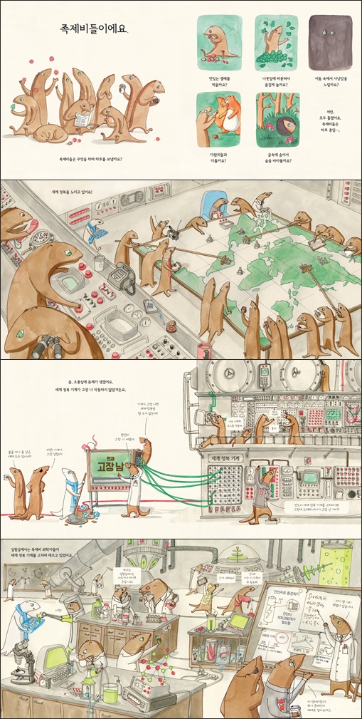 『족제비들은 무얼 할까?』는 누리과정 5개 영역 가운데 「의사소통 영역」과 연계된 그림책입니다. 이 책에는 세계 정복 기계를 고치기 위해 이리저리 바쁘게 움직이는 족제비들을 생생하게 그려 놓았습니다. 유아기의 아이들은 작고 세밀하게 표현된 그림과 사물에 큰 흥미를 느낍니다. 아이들은 벽지의 복잡한 패턴, 옷의 무늬, 줄지어 기어가는 개미, 나뭇잎의 잎맥을 관찰하는 것을 좋아합니다. 어른들은 무심코 지나치는 것들도 아이들은 고도의 집중력을 발휘해 발견해 냅니다. 이렇듯 작은 사물에 대한 민감한 반응은 아이들이 세상을 학습하기에 앞서 거쳐야 하는 중요한 단계입니다. 아이들이 이 시기에 보인 왕성한 호기심과 탐구심은 세상을 바라보는 눈을 키우는 밑거름이 됩니다. 책 속 족제비들의 행동을 단서로 책을 꼼꼼하게 읽다 보면 세계 정복 기계가 고장 난 원인을 찾을 수 있을 거예요. 이 책은 사파리펜으로 책 읽는 재미를 한층 더 느낄 수 있습니다. 사파리펜으로 책 안의 모든 글과 그림을 눌러 보세요. 그러면 그림 속 족제비들의 숨겨진 이야기를 다양한 효과음과 함께 들을 수 있어요. 또한 엄마 아빠가 읽어 주지 않아도 처음부터 끝까지 친절하게 읽어 주지요. 문장별로도 들을 수 있어 글자를 배우는 시기에 많은 도움을 받을 수 있어요. |
