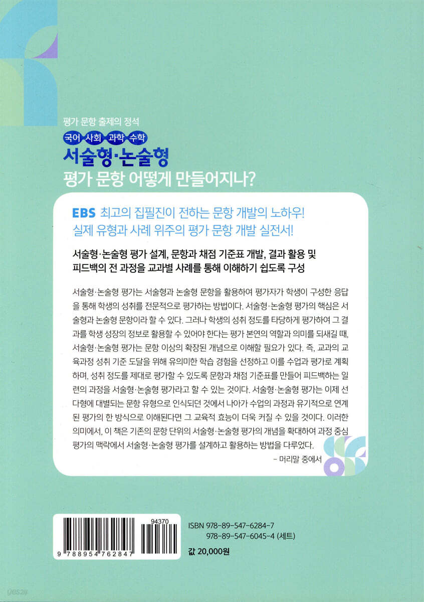 이 책은 이러한 서술형?논술형의 필요성과 비판적·창의적 사고, 문제 해결력과 같은 미래 사회에 대응할 수 있는 서술형?논술형의 중요성을 인지하여 만들어졌다. 이 책에서는 실제 학교 현장에서 효과적으로 활용할 수 있도록 서술형?논술형에 대한 전반적인 이해 및 각 과목별(국어, 사회, 과학, 수학) 특성에 맞게 서술형?논술형 출제 과정 전반을 다루고 있다. Ⅰ장에서는 서술형?논술형의 전반을 이해시키기 위해 서술형과 논술형 평가의 개념을 소개하면서 서술형 문항과 논술형 문항을 구분하는 기준과 유형을 설명하고, 교육과정과 수업, 그리고 평가가 연계된 서술형·논술형 평가를 위한 절차별 지침을 제시하고 있다. 그리고 Ⅱ~Ⅴ장에서는 국어, 사회, 과학, 수학 교과별로 서술형·논술형 평가의 이해 및 실제를 제시하고 있다. 즉 평가 목표 설정하기, 서술형·논술형 문항 세트 설계하기, 평가 자료 선정하기, 문두 작성하기, 채점 기준 작성하기, 채점하기, 평가 결과 해석 및 피드백의 과정에 대한 이해 및 실제를 보여 줌으로써, 실제 학교 현장에서 손쉽게 서술형?논술형 문항을 출제할 수 있는 과정을 효과적으로 보여 주고 있다. 이 책은 이처럼 서술형?논술형 문항 과정을 체계적으로 보여 주고 있다는 점에서 서술형?논술형 문항 개발에 친절한 도우미이면서 지침서라 할 수 있다. 그래서 이 책은 비단 학교 현장에 계신 선생님들뿐만 아니라, 서술형·논술형 평가에 대해 알고 싶은 예비 선생님, 그리고 앞으로 변화되는 학교 교육과 서·논술형 평가에 대한 이해를 넓히고자 하는 학생, 학부모들에게도 도움이 될 것임을 확신한다. |