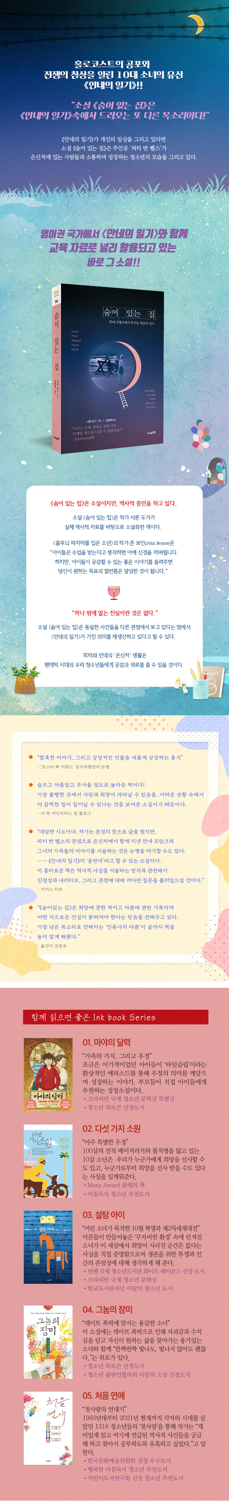 -더 북 어디딕티드 걸 블로그 “대담한 시도이다. 작가는 존경의 뜻으로 글을 썼지만, 피터 반 펠스의 관점으로 은신처에서 함께 지낸 안네 프랑크와 그녀의 가족들의 이야기를 서술하는 것은 논쟁을 야기할 수도 있다. …… 《안네의 일기》의 ‘동반자’라고 할 수 있는 소설이다. 이 흥미로운 책은 역사적 사실을 서술하는 방식과 관련해서 진정성과 내러티브, 그리고 관점에 대해 커다란 질문을 불러일으킬 것이다.” - 커커스 리뷰 “《숨어 있는 집》은 아픔의 기록이며 동시에 희망을 전하는 책이다. 어떤 식으로든 진실이 밝혀져야 한다는 믿음을 전해주고 있다. 가장 낮은 목소리로 전해지는 ‘인류사의 아픔’은 끝까지 책을 놓지 않게 해줬다. ‘팬데믹의 시대’를 살아가는 우리 청소년들에게는 ‘색다른’ 공감을 이끌어내고 위로를 전할 수도 있을 것이라고 생각한다.” - 옮긴이 김영욱 안네 프랑크의 일기장 ‘키티’ 속의 내성적인 소년으로 알려진 ‘피터 반 펠스’ 그의 눈에 비친 소녀 안네 프랑크와 ‘은신처’의 사람들, 그리고 홀로코스트!! “그래, 나는 죽었다. 하지만 당신이 내 이야기에 귀 기울여준다면 언제라도 내 아이기를 들을 수 있을 것이다.” - 본문 중에서 영국 3대 일간지 《Guardian》 에서 《안네의 일기》 속 인물들을 소설화한 것과 관련해서 지상 논쟁(https://www.theguardian.com/books/2010/jun/22/anne-frank-sharon-dogar : Sharon Dogar fights back over 'sexed up' Anne Frank novel ‘안네에게 성적 이미지를 씌웠다는 논쟁에 맞선 작가 샤론 도가’) 이 벌어졌던 작품으로 《안네의 일기》속 상황을 소설로 재구성한 최초의 작품이다. 영미권에서는 《안네의 일기》와 함께 교육 자료로 널리 활용되고 있다. * 《Guardian》의 내용을 간략하게 요약하자면, 10대인 피터의 성적 호기심을 다룬 부분을 두고 21세기의 관습을 다른 시대의 청소년(안네와 피터)들에게 적용했다는 비판에 대해 작가는 시대착오적인 주장에 대한 비난을 거부하며, 책 속에는 성에 관한 금기를 깰 만한 장면이나 상상력을 유발하는 대사와 내용이 전혀 없다고 반박했다. 1월 27일은 국제 홀로코스트 희생자 추모의 날 홀로코스트(Holocaust)는 그리스어 holokauston에서 유래하는데, 이는 고대 그리스에서 신에게 동물을(holos) 태워서(kaustos) 제물로 바치는 것을 의미한다. 1960년대 이전까지만 해도 홀로코스트는 대량 학살을 지칭하는 데 쓰였지만, 1960년대부터 학자들과 유명작가들에 의해 특별히 나치의 유대인 학살을 지칭하는 개념으로 쓰이기 시작하였다. 제2차 세계 대전 중 아돌프 히틀러가 이끈 국가사회주의 독일 노동자당이 나치 독일과 독일군 점령지 전반에 걸쳐 계획적으로 유대인과 슬라브족, 롬, 동성애자, 장애인, 정치범 등 약 1,100만 명의 민간인과 전쟁포로를 학살한 사건을 의미한다. 사망자 중 유대인은 약 600만여 명으로, 그 당시 유럽에 거주하던 900만 명의 유대인 중 약 2/3에 해당한다. 이러한 박해와 학살은 절차적으로 진행되었다. 먼저, 1935년 제정된 뉘른베르크법을 비롯하여 유대인을 사회에서 배척하는 각종 법령들이 제2차 세계 대전 발발 전에 제정되었다. 또한 집단 수용소를 지은 후 수감자들을 각종 노역에 동원하였고, 이들은 대부분 과로사하거나 병사하였다. 동유럽 점령지의 경우, 특별행동부대가 100만 명이 넘는 유대인과 정치범을 총살했다고 알려져 있다. 2005년 11월 1일 유엔 총회에서 매년 1월 27일을 국제 홀로코스트 희생자 추모의 날로 지정하여 홀로코스트로 학살당한 희생자들을 기리기 위한 결의를 채택하였다. 1월 27일로 정한 것은 1945년 1월 27일에 소련의 붉은 군대가 아우슈비츠 강제 수용소에 수감되어 있던 죄수를 해방시킨 날이었고, 이를 기념하기 위한 것이다. 《안네의 일기》속 ‘같은 사건’을 ‘다른 관점’에서 바라보는 《숨어 있는 집》 《안네의 일기》가 발표된 지 75년이 지났다. 그동안 《안네의 일기》는 2차 세계 대전의 참혹함과 나치의 만행을 볼 수 있는 중요한 역사 교과서였다. 《안네의 일기》가 나치를 피해서 숨어서 지낸 2년의 시간을 한 여자아이의 시선으로 기록해 놓은 것이라면 《숨어 있는 집》은 그 시간 동안 안네 프랭크와 같이 지냈던 안네의 남자 친구인 피터의 시선으로 재구성한 작품이라고 할 수 있다. 《안네의 일기》가 일기 그 자체였다면 《숨어 있는 집》은 일기 형식을 빌린 픽션, 즉 소설이다. 이 작품 《숨어 있는 집》은 ‘안네의 성 관념’이나 ‘피터와의 사랑’ 등이 수록되어 새롭게 출간된 《안네의 일기》‘완전 판’을 바탕으로 안네와 피터, 그리고 은신처의 이야기를 소설적으로 재구성했다. 《안네의 일기》와 비교했을 때 가장 뚜렷하게 드러나는 차이점은 페미니즘적 사고 방식, 즉 여성의 성 역할이나 고정관념에 대한 질문과 고민을 담고 있다는 것과 《안네의 일기》에는 수록되지 않은 아우슈비츠와 마우타우젠에서의 참혹한 수용소 생활의 이야기를 수록하고 있다는 것이다. “우리가 그녀(안네)의 이야기는 물론 그 이야기에 깃든 ‘미움을 넘어서는 진정한 사랑’을 공감하더라도, 증오의 결과가 얼마나 치명적일 수 있는지를 다음세대
