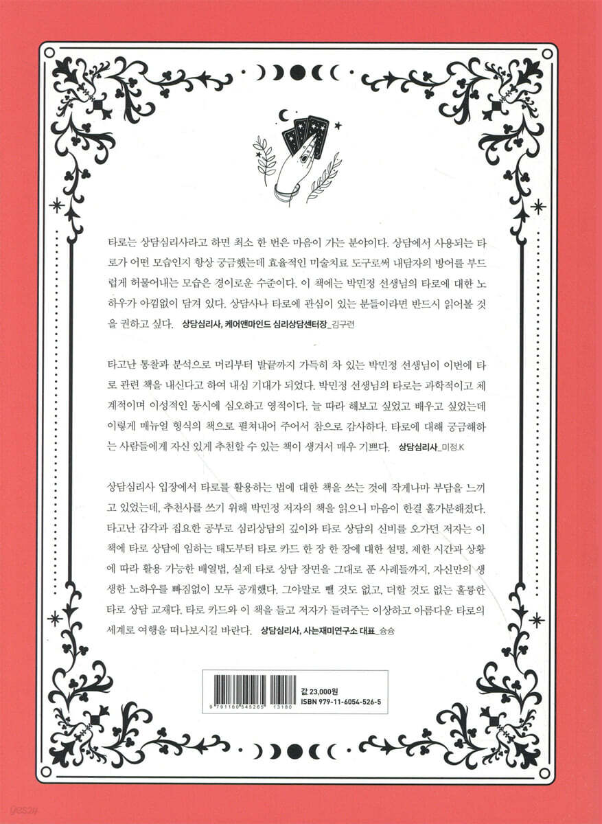 1장 타로 상담 방법 1. 타로 리딩 & 타로 리더 014 2. 타로 카드 선택 및 구입 015 3. 타로 용어 016 4. 타로 상담에 걸리는 시간 017 5. 타로 상담의 구성 019 · 질문 구체화 과정 019 · 카드 리딩 022 (1) 카드 고르고 늘어놓기(Spread) (2) 카드에 담긴 이야기 나누기 & 해석하기(Storytelling & Explanation) (3) 피드백 및 소감 나눔(sharing) 2장 타로 리딩 키워드와 화법 1. 타로 카드의 번호와 순서 040 2. 카드의 투사(projection) 기능 041 3. 카드 리딩 화법 042 2.5장 Major 22 Cards와 Minor 56 Cards 1. Major 22 cards 046 · 0번 : 바보(The Fool) 046 · 1번 : 마법사(The Magician) 048 · 2번 : 여사제(The High Priestess) 050 · 3번 : 여황제(The Empress) 052 · 4번 : 남자 황제(The Emperor) 054 · 5번 : 교황(The Hierophant) 056 · 6번 : 연인(The Lovers) 058 · 7번 : 전차(The Chariot) 060 · 8번 : 힘(Strength) 062 · 9번 : 현명한 자/은둔자(The Hermit) 064 · 10번 : 운명의 수레바퀴(Wheel of Fortune) 066 · 11번 : 정의(Justice) 068 · 12번 : 거꾸로 매달린 사람(The Hanged Man) 070 · 13번 : 죽음(Death) 072 · 14번 : 절제(Temperance) 074 · 15번 : 악마(The Devil) 076 · 16번 : 탑(The Tower) 078 · 17번 : 별(The Star) 080 · 18번 : 달(The Moon) 082 · 19번 : 해(The Sun) 084 · 20번 : 심판(Judgement) 086 · 21번 : 세계(The World) 088 2. Minor 56 cards 090 · 지팡이(Wand) Keywords 091 (1) 지팡이(Wand) 1번 (2) 지팡이(Wand) 2번 (3) 지팡이(Wand) 3번 (4) 지팡이(Wand) 4번 (5) 지팡이(Wand) 5번 (6) 지팡이(Wand) 6번 (7) 지팡이(Wand) 7번 (8) 지팡이(Wand) 8번 (9) 지팡이(Wand) 9번 (10) 지팡이(Wand) 10번 (11) 지팡이(Wand)-시종(Page) (12) 지팡이(Wand)-기사(Knight) (13) 지팡이(Wand)-왕(King) (14) 지팡이(Wand)-여왕(Queen) · 검(Sword) Keywords 102 (1) 검(Sword) 1번 (2) 검(Sword) 2번 (3) 검(Sword) 3번 (4) 검(Sword) 4번 (5) 검(Sword) 5번 (6) 검(Sword) 6번 (7) 검(Sword) 7번 (8) 검(Sword) 8번 (9) 검(Sword) 9번 (10) 검(Sword) 10번 (11) 검(Sword)-시종(Page) (12) 검(Sword)-기사(Knight) (13) 검(Sword)-왕(King) (14) 검(Sword)-여왕(Queen) · 컵(Cup) Keywords 115 (1) 컵(Cup) 1번 (2) 컵(Cup) 2번 (3) 컵(Cup) 3번 (4) 컵(Cup) 4번 (5) 컵(Cup) 5번 (6) 컵(Cup) 6번 (7) 컵(Cup) 7번 (8) 컵(Cup) 8번 (9) 컵(Cup) 9번 (10) 컵(Cup) 10번 (11) 컵(Cup)-시종(Page) (12) 컵(Cup)-기사(Knight) (13) 컵(Cup)-왕(King) (14) 컵(Cup)-여왕(Queen) · 동전(Pentacle) Keywords 127 (1) 동전(Pentacle) 1번 (2) 동전(Pentacle) 2번 (3) 동전(Pentacle) 3번 (4) 동전(Pentacle) 4번 (5) 동전(Pentacle) 5번 (6) 동전(Pentacle) 6번 (7) 동전(Pentacle) 7번 (8) 동전(Pentacle) 8번 (9) 동전(Pentacle) 9번 (10) 동전(Pentacle) 10번 (11) 동전(Pentacle)-시종(Page) (12) 동전(Pentacle)-기사(Knight) (13) 동전(Pentacle)-왕(King) (14) 동전(Pentacle)-여왕(Queen) 3장 상담사의 역할 1. 타로 상담 시 상담사의 태도 142 · 질문의 구체화의 중요성 142 · 내담자에게 주는 선물 카드 143 · 긍정적 메시지 vs 부정적 메시지 144 2. 타로 상담 시 유의할 점 145 3. 상담을 위한 필수 사용 멘트 146 4장 타로 상담의 한계와 보완 1. 점술 타로와의 혼동 152 2. 종교와의 배타적 관련성 153 3. 내담자의 욕구 오해석 154 4. 카드에 나온 상징과 해석 부정(不正) 155 5. 오라클 카드 병행 160 5장 특수 분야 리딩 : 금전 & 연애 & 펫(Pet) 1. 금전운 리딩 유의점 166 2. 금전운 리딩 방법 167 · Minor Card - 동전(Pentacle) 14장 사용 167 · 머니 매직 매니페스테이션 카드 사용 170 3. 연애운 리딩 시 유의점 170 4. 연애운 리딩 방법 173 · Major Card 22장 사용 173 · 로맨틱 타로(Romantic Tarot) 카드 사용 177 · 러버스 오라클(Lovers Oracle) 카드 사용 177 5. 특수 상황 리딩 178 · 성인용 타로 카드 사용 178 · 펫 타로(Pet Tarot) 178 6장 타로 상담의 실제 1. 타로 상담의 지침 184 2. 축어록 194 · 사례 ① 194 · 사례 ② 208 · 사례 ③ 215 · 사례 ④ 224 마치며 237 |