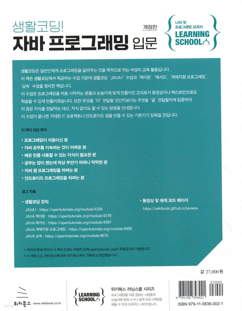 - 프로그래밍이 처음이신 분 - 자바 공부를 지속하는 것이 어려운 분 - 배운 만큼 사용할 수 있는 지식이 필요한 분 - 공부는 많이 했는데 막상 무언가 하려나 막막한 분 - 자바 웹 프로그래밍을 하려는 분 - 안드로이드 프로그래밍을 하려는 분 참고 자료 [생활코딩 강의] - JAVA1 : https://opentutorials.org/module/4294 - JAVA 제어문 : https://opentutorials.org/module/4378 - JAVA 메서드 : https://opentutorials.org/module/4397 - JAVA 객체지향 프로그래밍 : https://opentutorials.org/module/4406 - JAVA 상속 : https://opentutorials.org/module/4870 [동영상 및 예제코드] - https://wikibook.github.io/javarev |