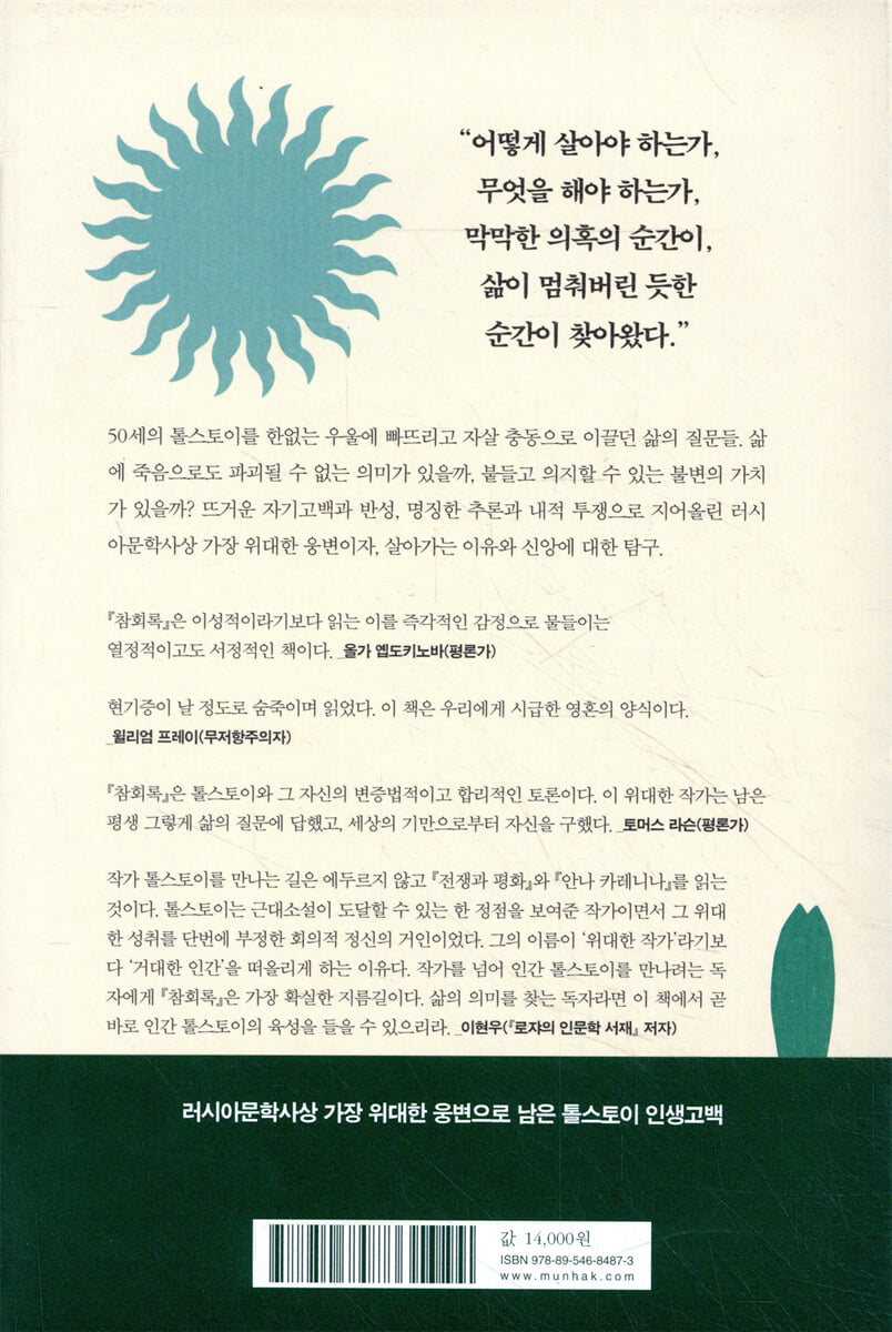 작가 톨스토이를 만나는 길은 에두르지 않고 『전쟁과 평화』와 『안나 카레니나』를 읽는 것이다. 톨스토이는 근대소설이 도달할 수 있는 한 정점을 보여준 작가이면서 그 위대한 성취를 단번에 부정한 회의적 정신의 거인이었다. 그의 이름이 ‘위대한 작가’라기보다 ‘거대한 인간’을 떠올리게 하는 이유다. 작가를 넘어 인간 톨스토이를 만나려는 독자에게 『참회록』은 가장 확실한 지름길이다. 삶의 의미를 찾는 독자라면 이 책에서 곧바로 인간 톨스토이의 육성을 들을 수 있으리라. - 이현우 (『로쟈의 인문학 서재』 저자)