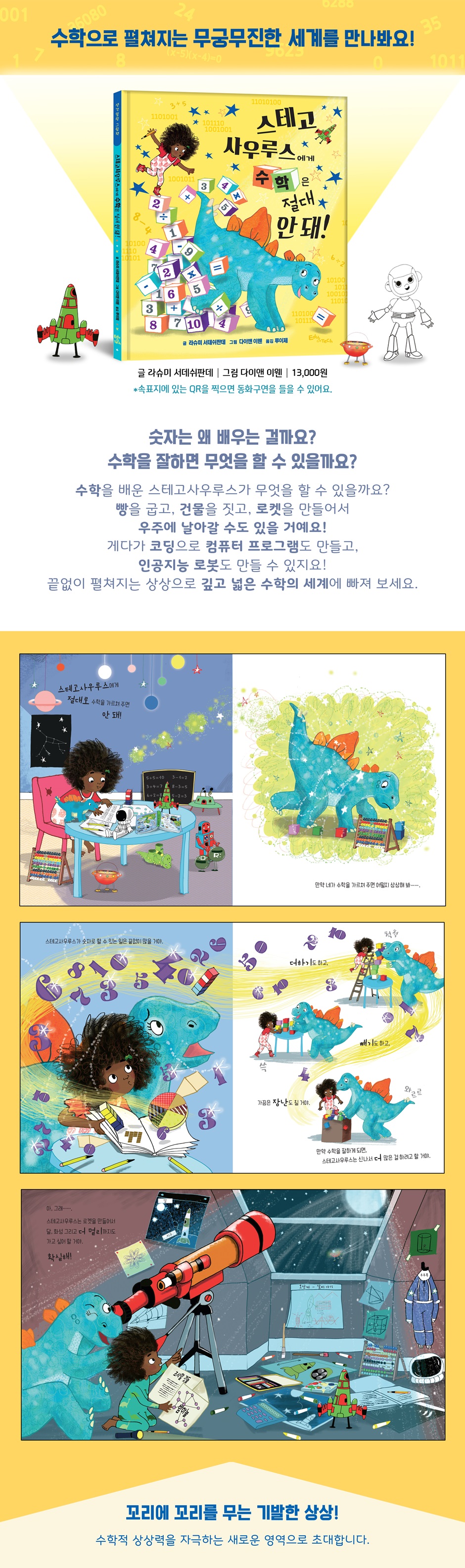 스테고사우루스가 수학을 잘하게 되면 어떻게 될까요? 일단 숫자로 무슨 일을 할 수 있는지 알게 될 거예요. 덧셈과 뺄셈을 알게 된 스테고사우루스는 숫자를 이용해서 암호를 풀고, 레시피를 보며 빵도 구울 수도 있겠지요. 더 나아가 로켓을 만들어서 우주에 갈지도 몰라요! 이처럼 수학은 생활에서 꼭 필요할 뿐만 아니라 무궁무진한 일을 할 수 있게 해요. 그림책을 읽고 스테고사우루스가 수학을 배우고 어떤 일을 할 수 있게 되는지 알게 되면 아이들도 수학을 꼭 배우고 싶어 할 거예요. 우주? 로봇? AI? 상상력이 끝없이 펼쳐져요! 스테고사우루스는 수학을 열심히 배워서 로켓을 만들어 우주에 가고, 인공지능 로봇을 만들어 세상을 로봇으로 가득 채워요. 스테고사우루스가 이뤄낸 일들은 터무니없는 상상만은 아니에요. 아이들이 곧 마주하게 될 미래의 모습일지도 몰라요. 또 어떤 일이 벌어질까요? 『스테고사우루스에게 수학은 절대 안 돼!』는 수학적 상상력을 자극하는 책이에요. 아이들이 평소 잘 접하지 못한 새로운 영역으로 초대하는 책이기도 하지요. 함께 책을 읽고 미래엔 어떤 세상이 기다리고 있을지 상상하며 아이와 이야기 나눠 보세요. |