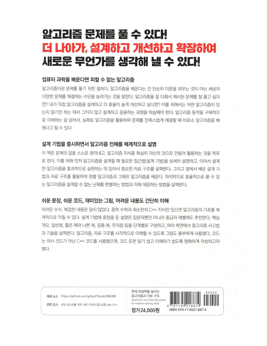 더 나아가, 설계하고 개선하고 확장하여 새로운 무언가를 생각해 낼 수 있다! 컴퓨터 과학을 배운다면 피할 수 없는 알고리즘 알고리즘이란 문제를 풀기 위한 절차다. 알고리즘을 배운다는 건 단순히 이론을 외우는 것이 아닌 세상의 다양한 문제를 해결하는 수단을 늘려가는 것을 말한다. 알고리즘을 잘 다뤄서 제시된 문제를 잘 풀고 싶다면? 내가 직접 알고리즘을 설계하고 더 효율이 높게 개선하고 싶다면? 이를 위해서는 어떤 알고리즘이 있는지 알기만 하는 데서 그치지 않고 설계하고 응용하는 과정을 학습해야 한다. 알고리즘 동작을 구체적으로 이해하는 걸 넘어서, 실제로 알고리즘을 활용하여 문제를 만족스럽게 해결할 때 비로소 알고리즘을 배웠다고 할 수 있다. 설계 기법을 중시하면서 알고리즘 전체를 체계적으로 설명 이 책은 문제의 답을 스스로 찾아내고, 알고리즘 지식을 확실히 자신의 것으로 만들어 활용하는 것을 목표로 한다. 이를 위해 먼저 알고리즘을 설계할 때 필요한 접근법(설계 기법)을 상세히 설명하고, 이어서 설계한 알고리즘을 효과적으로 실현하는 데 있어서 중요한 자료 구조를 살펴본다. 그리고 앞에서 배운 설계 기법과 자료 구조를 활용하여 정렬 알고리즘과 그래프 알고리즘을 배운다. 마지막으로 효율적으로 풀 수 있는 알고리즘을 설계할 수 없는 난제를 판별하는 방법과 이에 대응하는 방법을 살펴본다. 쉬운 문장, 쉬운 코드, 재미있는 그림, 어려운 내용도 간단히 이해 어려운 수식, 복잡한 내용은 담지 않았다. 중학 수학과 최소한의 C++ 지식만 있으면 알고리즘의 기초를 체계적으로 익힐 수 있다. 설계 기법에 중점을 둔 설명은 입문자뿐만 아니라 중급자 레벨에도 추천한다. 핵심 개요, 일반화, 좋은 예와 나쁜 예, 응용 예, 주의점 등을 단계별로 구성하고, 여러 측면에서 알고리즘 사고법과 기술을 살펴본다. 알고리즘, 자료 구조를 시각적으로 이해할 수 있도록 그림도 풍부하게 사용했다. 코드는 의사 코드가 아닌 C++ 코드를 사용했으며, 코드 또한 읽기 쉽고 이해하기 쉽도록 명확하게 작성하고자 했다. 이 책에서 다루는 내용 단순히 알고리즘 동작을 설명하기보다는 좋은 알고리즘을 설계하는 방법에 중점을 둡니다. 알고리즘을 처음 배우는 분부터 실용적인 알고리즘 설계 기법을 배우고 싶은 분까지 폭넓게 즐길 수 있으면 좋겠습니다. 필요한 예비지식 고등학교 수학을 배웠고 프로그래밍 경험이 있다고 전제합니다. 복잡한 수학적 이해가 필요한 부분도 있는데, 초보자에게 어려운 내용은 (*) 기호로 표시했습니다. 책에 나오는 소스 코드는 C++로 작성했는데, 기본 기능만 사용하므로 프로그래밍 경험이 있다면 큰 문제 없이 읽을 수 있습니다. C++의 고유 기능 중 다음을 사용합니다. - std::vector 같은 STL 컨테이너 - std::sort() 같은 표준 라이브러리 - const 수식자 - 템플릿 - 포인터 - 참조 - 구조체 사용하는 언어 이 책은 C++를 사용해서 알고리즘을 작성하며, 다음과 같은 C++ 11 이후 기능을 일부 사용합니다. - 범위 for문 - auto를 사용한 타입 추론(범위 for문에서만 사용) - std::vector〈int〉 v = { 1, 2, 3 }; 같은 vector형 변수 초기화 - using을 사용한 자료형 별명 선언 - 템플릿 오른쪽 괄호에 공백 생략 - std::sort() 복잡도가 O(NlogN)이라는 것이 보증됨 동작 환경 이 책에 실린 소스 코드는 C++ 11 이후 버전의 C++에서 컴파일 가능하고, Wandbox에서 gcc 9.2.0으로 코드 동작을 확인했습니다. (번역 시 macOS Big Sur clang 12.0.0 버전에서 확인) 소스 코드는 다음 주소에서 다운로드 가능합니다. - 저자 깃허브: https://github.com/drken1215/book_algorithm_solution - 길벗 깃허브: https://github.com/gilbutITbook/080288 [감수자 서문] 이 책은 입문서에서 중요한 기초를 확실히 다지도록 해주면서 구성이 개성적입니다. 유명 알고리즘을 소개하는 데 그치지 않고 알고리즘 응용법과 설계 방법에도 비중을 둡니다. 널리 쓰이는 알고리즘 교과서의 구성은 유명 알고리즘을 단순히 소개하는 형식이 대다수입니다. ‘이런 처리를 하면 되니까 XX 알고리즘을 사용하자’라고 바로 답이 나오는 상황이라면 참고용으로 좋겠지요. 하지만 현실 세계에서 우리가 직면하는 문제는 그렇게 간단히 끝나지 않습니다. 어떤 알고리즘을 어떻게 사용하면 좋을지 알 수 없고 직접 알고리즘을 설계해야 하거나 해결 가능 여부조차 알 수 없는 그런 상황도 적지 않습니다. 이 책은 이런 다양한 상황에서 알고리즘 능력을 사용해 문제를 해결할 수 있도록 유명 알고리즘을 소개할 뿐만 아니라 알고리즘을 설계할 때 필요한 접근법(설계 기법)을 상세히 설명합니다. [지은이 서문] 알고리즘을 배운다는 건 단순히 지식을 흡수하는 것이 아니라 세상의 다양한 문제를 해결하는 수단을 늘려가는 것입니다. 알고리즘이란 원래 문제를 풀기 위한 절차를 말합니다. 알고리즘 동작을 구체적으로 이해하는 걸 넘어서 실제로 문제 해결에 도움이 될 때 비로소 알고리즘을 배웠다고 할 수 있습니다. 알고리즘을 배우기 시작한 후 세상의 여러 문제와 마주쳤을 때 세계관에 혁명이 일어난 걸 기억합니다. 저도 알고리즘을 배우기 전에는 문제를 해결하는 행위란 고