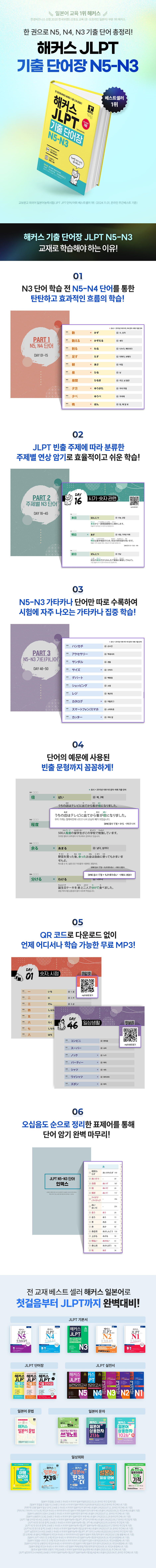 N5-N3 단어 학습 최적화 단어장! [이런 분들에게 추천합니다] 1) 합격을 위해 꼭 필요한 JLPT N3 단어를 주제별 연상 암기로 효율적으로 학습하고 싶은 분들 2) 한 권으로 JLPT N3 단어 학습과 함께 기초적인 N5-N4 단어도 간편하게 학습하고 싶은 분들 [해커스 교재만의 특장점] 1. JLPT N3 합격을 도와주는 단어 총 2,500개를 효율적으로 학습할 수 있습니다.1) PART 1N3 단어 학습 전, N5-N4 단어를 먼저 학습할 수 있게 구성하여 보다 탄탄하고 효과적인 흐름의 학습이 가능합니다. 2) PART 2 - N3 단어를 JLPT 빈출 주제에 따라 분류하여, 주제별 연상 암기로 단어를 효율적이고 쉽게 학습할 수 있습니다. - 실제 N3 시험에 나올법한 예문을 수록하여 단어의 올바른 쓰임을 학습할 수 있습니다. 3) PART 3 N5-N3 가타카나 단어만 따로 수록하여, 시험에 자주 나오는 가타카나 단어를 별도로 집중 학습할 수 있습니다. 2. 단어뿐만 아니라 JLPT N3 시험에 자주 나오는 문형까지도 꼼꼼히 학습할 수 있습니다. 1) 단어의 예문에 JLPT N3 문제를 풀 때 꼭 알아야 하는 빈출 문형을 함께 사용하여 단어뿐만 아니라 문형의 올바른 쓰임과 의미까지도 알차게 학습할 수 있습니다. 2) 예문 아래에 정리된 문형으로 JLPT N3 시험의 빈출 문형까지 꼼꼼하고 확실하게 학습할 수 있습니다. 3. QR코드로 다운로드 없이 언제 어디서나 학습 가능한 다양한 [무료 MP3]를 제공합니다. 1) 학습자의 상황과 편의에 맞게 골라서 들을 수 있도록 ‘단어(일/일한)’, ‘단어+예문(일/일한)’ 등 다양한 무료 MP3를 제공합니다. 2) QR코드와 모바일 스트리밍으로 언제 어디서나 원하는 버전의 MP3를 들으며 더욱 쉽고 정확하게 단어를 암기할 수 있습니다. 4. 단어 암기 효과를 극대화하는 해커스만의 무료 학습 자료를 통해 더 철저한 시험 대비가 가능합니다. 1) Day별 단어 퀴즈(PDF) 각 Day에 수록된 단어를 잘 암기했는지 퀴즈를 풀어보면서 복습할 수 있습니다. 2) 연습문제 체크체크 해석(PDF) 연습문제에 포함된 문장의 해석을 수록한 ‘연습문제 체크체크 해석’으로 스스로의 실력을 점검하며 효과적으로 학습할 수 있습니다. [원하는 급수를 단기간에 합격할 수 있는 해커스만의 추가 학습 콘텐츠 - 해커스일본어(japan.Hackers.com)] 1. 무료 MP3 ⓛ 단어(일/일한) MP3 ② 단어+예문(일/일한) MP3 ③ 연습문제 체크체크 MP3 2. 무료 Day별 단어 퀴즈 3. 무료 연습문제 체크체크 해석 |