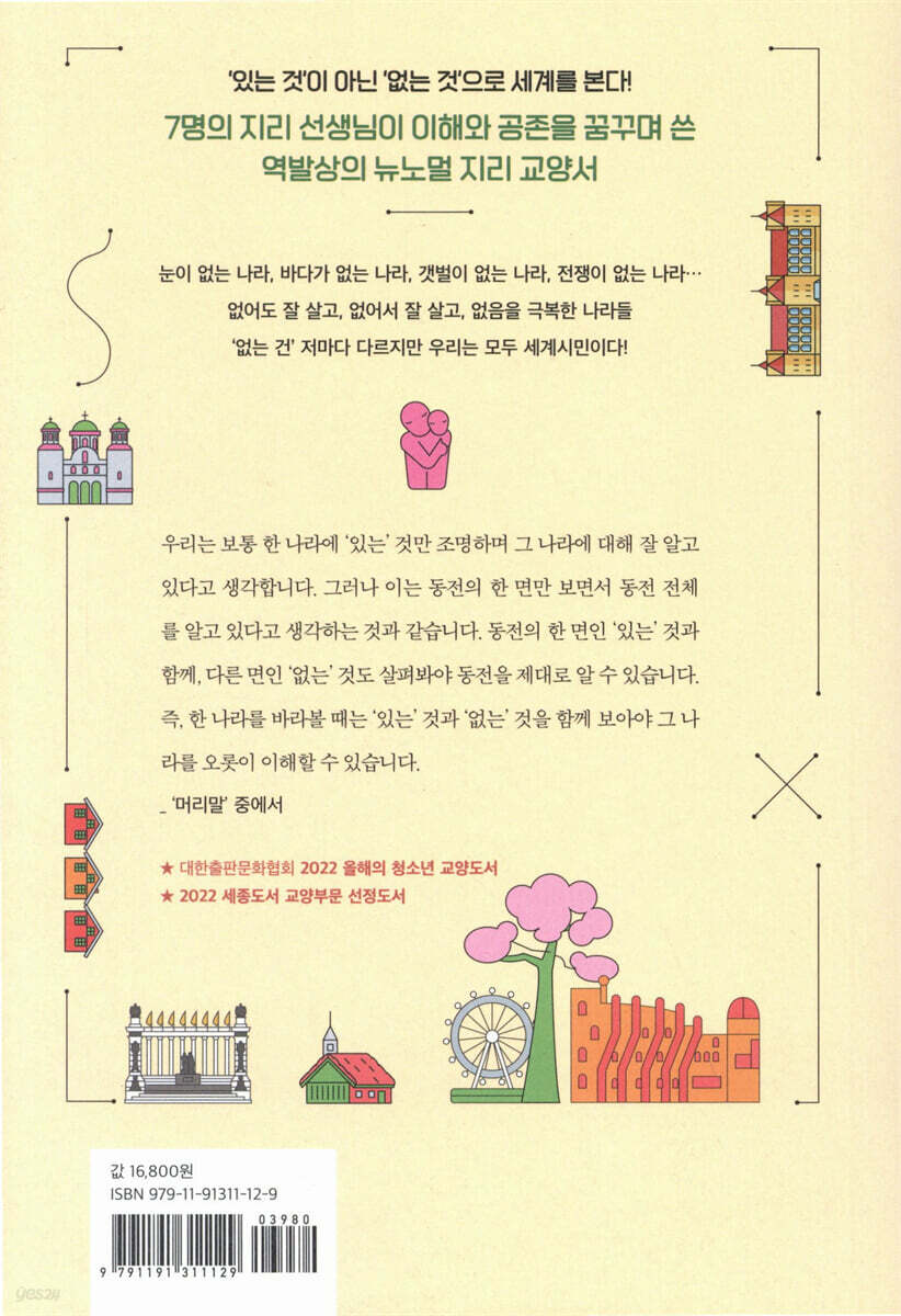 지구는 그대로이고 우리나라의 위치도 바뀐 게 없지만, 최근 몇 년 사이 우리는 세계가 점점 더 긴밀하게 연결되어가고 있음을 온몸으로 느끼고 있다. 미국 대통령 선거, 미얀마 쿠데타, 홍콩 민주화 운동, 우크라이나-러시아 전쟁 위기 등의 국제뉴스가 더욱 빈번하게 전해져오면서 경제에 영향을 끼치고 있고, 영화나 드라마, K-POP 등 우리의 대중문화를 세계의 수많은 사람들이 즐기는 일은 더 이상 놀라운 일도 아니다. 도시든 농촌이든 어디를 가도 어렵지 않게 외국에서 온 사람들을 만날 수 있고, 우리나라 사람들이 외국에서 활동하거나 아예 이주하는 일도 많다. 이렇게 세계가 연결되고 상호 의존성이 높아지는 상황은 우리가 한 나라의 ‘국민’을 넘어 ‘세계시민’이라는 또 다른 정체성을 갖게 되는 것을 의미한다. 당장 내일부터 다른 나라에서 온 사람과 협업을 할 수도 있고, 이웃이나 친구가 될 수도 있는 것이 바로 지금의 현실이다. 오늘을 살아가는 우리는 세계시민이 될 준비가 되어 있을까? 이를 위해 필요한 것은 무엇일까? 거기에 ‘없는 것’ - 세상을 이해하는 역발상의 렌즈 이 책의 저자인 7명의 지리 선생님들은 세계시민에게 필요한 것이 여러 나라 사람들에 대한 관심과 이해, 공감이라고 말한다. 이를 위해 ‘없는 것’이라는 새로운 렌즈로 세계를 들여다본다. 지구상에는 바다가 없는 나라가 있고, 공항이 없는 나라가 있다. 갯벌이 없는 나라가 있고, 자국 화폐가 없는 나라가 있다. 대한민국에 사는 우리에게는 너무도 당연한 것들이지만, 어떤 나라 사람들은 평생 경험해보지 못하는 것들이 있다. 세계를 이해하고 지리를 공부할 때 지금까지 우리는 각 나라의 주인공들을 주목해왔다. 극지방 나라를 이야기할 때는 오로라를 주목했고, 서남아시아 나라를 이야기할 때는 석유에 초점을 맞췄다. 그 나라에 어떤 자원이 있고, 어떤 기후가 있는지 외우기도 했다. 그에 비해 ‘무엇이 없는지’에 대해서는 관심이 소홀했던 게 사실이다. 우리나라에 바다는 있지만, 호랑이는 없는 것처럼, 다른 나라들에 ‘있는 것’과 ‘없는 것’을 함께 보면, 더욱 흥미롭고 입체적으로 그 나라의 온전한 모습을 이해할 수 있을 것이다. 《세계시민을 위한 없는 나라 지리 이야기》에는 스물두 나라의 ‘없는 것’이 흥미롭게 펼쳐진다. 여기에는 기후나 자연환경 때문에 처음부터 없던 것도 있고, 역사나 제도, 문화같이 오랜 시간 그 나라 사람들의 삶을 통해, 존재하지 않게 된 것들도 있다. 또한, 없는 것으로 잘못 알려지거나, 원래 없었는데 어느 순간 생겨난 것들도 있다. 이렇게 ‘없는 것’이라는 렌즈는 여러 각도를 통해, 각 나라의 특징들을 속속 찾아내 보여준다. 포스트 코로나 시대, 연대와 평화의 인류를 희망하다 지금처럼 세계가 연결되지 않았던 시대에는 다른 나라에 대한 편견이나 잘못된 정보도 많았고, 다른 나라의 문화를 폄하하거나, 외모에 대한 비하 발언을 하는 경우도 많았다. 국가 간 이동이 많아지고 정보의 교류가 활발해지면서 이제 그런 것들이 많이 줄어가고 있다. 그렇게 연결과 의존이 더욱 커지고 있는 세계는 자원 부족, 기후변화, 환경오염 등 인류의 생존을 위협하는 문제들을 눈앞에 두고 있다. 이를 해결하기 위해서는 평화와 연대, 협력이 긴밀하게 이루어져야 할 것이다. 인류사적 문제를 눈앞에 둔 중요한 시기, 동시에 국제분쟁의 가능성이 커지는 위기의 시대에 ‘지리’는 다른 공간에 대한 이해, 그곳에서 살아온 사람들에 대한 공감으로 향하는 중요한 통로가 될 수 있다. 이 책은 역발상의 흥미로운 렌즈로, 나와 다른 이 세상 어디에선가 살아가고 있는 여러 사람들의 생활을 이해하고 공감하게 해준다. 이를 바탕으로 타인을 배려하는 사회, 협력하고 연대하는 세계가 되는 데, 작은 힘이라도 보태는 것이 이 책의 희망이다. |