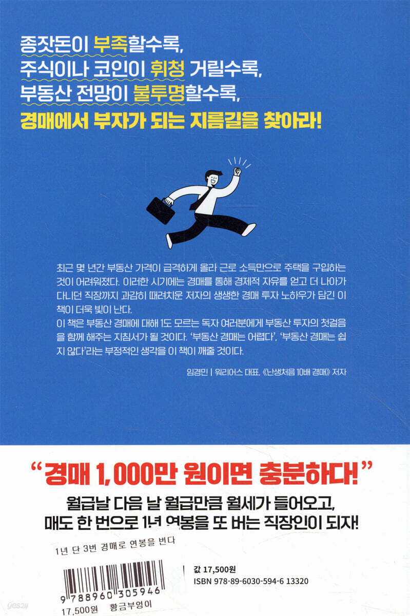 ‘내 연봉의 2배를 벌었다고?“ 경매에 눈을 뜨다! 화장실 갈 시간도 줄여가며 일을 한 결과, 연봉이 몇백만 원 올라간 것에 감사하게 여기던 저자는 어느 날 충격을 받게 된다. 지인의 딸이 회사는 회사대로 다니면서 경매를 통해 부가적인 수익으로 8,000만 원을 벌었기 때문이다. 연봉 몇백만 원 더 올리기 위해 매일 8시간 이상씩 일을 했는데 다른 누군가는 약간의 시간을 투자해 몇천만 원을 벌었다니. 저자는 그때부터 경매를 공부하면서 몇천, 몇억이 아니라 적은 금액으로도 충분히 가능하다는 사실을 알게 됐다. 실제로 저자는 2,000만 원으로 시작해 현재 14채 이상의 부동산을 소유하고 있다. 경매를 접하면서 저자는 다짐한 것이 있다. ‘회사와 멀어질 것이다.’ 그동안 회사가 전부라고 생각했지만 회사는 다니는 사람의 인생과 미래를 책임져주지 않는다. 경제적 자유를 위해 수입의 다양한 파이프라인을 만들어야 하는 것이 더욱 중요했다. 경매를 하면서 저자는 회사의 다른 직원들과 경쟁하거나 월급에 예민해지지 않았다. 경매를 통해 새로운 인생이 열렸기 때문이다. 그것은 바로 경제적 자유를 위한 투자 인생이었다. 경매의 진입 장벽은 없다. 그 누구도 할 수 있다, 지금의 저자처럼! 공부할 때는 좋은 대학에 들어가는 게, 대학교 다닐 때는 대기업에 들어가는 게 성공적인 삶이라고 생각한 저자는 경매를 만나면서 인생의 기준이 확 바뀌었다. 평생 일을 하며 살 수밖에 없는 시대에서 몇백만 원 연봉 인상을 위해 잠까지 줄여가며 일하는 누군가와 1번의 투자로 연봉만큼을 버는 또 다른 누군가가 공존하고 있다. 그렇다면 나는 어떤 사람처럼 살아야 하는지에 대한 고민을 해야 하는데 저자는 그 고민의 해결방안으로 ‘경매’를 독자들에게 제안하고 있다. 1장에서는 경매를 알기 전에 쳇바퀴 돌 듯 산 저자의 이야기와 경매를 알게 되면서 받은 충격, 그리고 경매를 공부하는 방법에 대해 이야기하고 있다. 지금도 경매가 두려운 사람들에게 동기부여가 될 것이다. 2장에서는 그동안 경매에 대해 잘못 알려진 사실, 경매가 우리 경제에 얼마나 좋은 역할을 하는지, 최근 몇 년간 발표된 부동산 규제에서도 경매만큼은 승산이 있다는 이야기를 담았다. 3장에서는 경매 초보자라면 반드시 알아야 하는 경매의 과정에 대해 일목요연하게 담았으며 경매 투자자의 상황에 맞는 투자법을 자세하게 소개하고 있다. 4장에서는 저자의 첫 낙찰을 사례로 경매의 한 사이클을 보여준다. 그런데 이 사이클이 흥미롭다. ‘첫 낙찰’이라는 전율이 채 가시기도 전에 명도하면서 강제 집행까지 그야말로 롤러코스터 같은 과정을 보냈기 때문이다. 경매를 하면서 강제 집행은 손에 꼽힐 정도로 적다고 하는데 저자는 첫 낙찰 때부터 강제 집행을 하게 됐다. 독자들은 저자의 첫 낙찰 사례를 통해 실제 경매에서 예상 밖의 상황을 마주쳤을 때 어떻게 돌파해야 하는지 알 수 있을 것이다. 5장에는 경매 노하우가 쌓인 저자가 빠른 매도가 가능한 부동산을 낙찰받아 2주 만에 매매를 한 사례를 담았다. 경매에서는 낙찰도 중요하지만 매도도 중요하다. 그 매도와 관련한 노하우를 알 수 있다. 6장에서는 누구나 원하는 아파트 경매를 할 때 알아야 하는 것과 피해야 하는 것에 대해 담았다. 그 어떤 부동산보다 덩치가 큰 아파트의 경우 작은 실수도 큰 피해로 돌아오기 때문에 더욱 주의해야 한다. 6장에 담긴 내용을 통해 준비할 수 있을 것이다. 마지막 7장에서는 지금까지 이야기한 경매 노하우를 바탕으로 1년에 3번 낙찰로 연봉 정도 수익을 올리는 방법에 대해 다루고 있다. 읽다 보면 실현 불가능하다는 생각이 사라질 것이다. 초보자일수록 ‘꾸준히 하는 경매’에서 경제적 자유를 찾아라! 흙수저였던 저자는 좋은 대학을 나와 취업을 잘 하면 성공적인 삶이라고 생각했다. 하지만 그게 아니었다. 회사에서 아무리 노력해봤자 연봉 몇백 인상에 그쳤다. 경제적 자유는 요원했다. 그러다가 운명처럼 찾아온 경매를 통해 경제적 자유라는 목표에 한 걸음씩 다가가고 있다. 또한, 저자는 경매에 편견을 갖고 있었던 수강생이 이제는 법인을 세울 생각까지 하는 모습을 보며 경매의 힘을 다시한번 느꼈다고 한다. 경매를 꾸준히 한다면 분명 부자의 길을 찾을 수 있다. 경매는 결코 어렵지 않다. 그 증거가 바로 이 책을 쓴 저자다. 다만, 초보자일수록 경매로 부자가 되겠다는 목표보다 꾸준하게 경매를 해 꾸준하게 부를 증식하겠다는 자세가 중요하다. 그래야 잃지 않는 투자를 할 수 있기 때문이다. 그 자세를 정립하기 위해 이 책이 확실히 지지 역할을 해줄 것이다. |