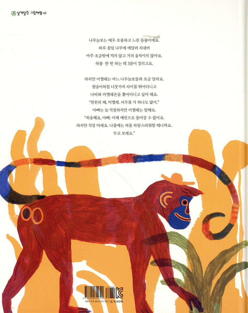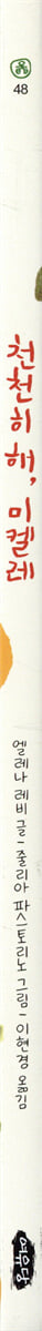 줄리아 파스토리노와 엘레나 레비의 멋진 컬래버! 나무늘보를 주인공으로 다름과 세대간 소통을 이야기하다 『천천히 해, 미켈레』는 2020년 로다리 상을 안겨 준 ??공룡이 도착했다??를 이어 엘레나 레비와 줄리아 파스토리노가 두 번째로 협업한 작품입니다. 두 작가 모두 한국에 처음 소개하는 작가입니다. 스승 잔니 로다리를 이어받아 자유와 환상의 세계에 대해 이야기하기를 좋아하는 엘레나 레비는, 미켈레 이야기로 매력적인 문학작품이 주는 즐거움과 힘을 물씬 선물합니다. ‘나무’와 ‘느림보’의 합성어인 나무늘보! 하루 종일 나무에 매달려 지내고, 밤새 자지만 낮에도 대부분 자는 나무늘보. 하루에 나뭇잎 세 장이면 식사가 해결되고, 전력 질주해도 1시간에 200m 정도 이동할 수 있는 나무늘보. 우리가 알고 있는 나무늘보의 일반적 습성이지요. 그러나 물에 빠졌을 때 빠르게 움직이는 모습을 포착한 다큐도 있습니다. 엘레나 레비는 멸종 위기에 처한 (갈기세발가락)나무늘보의 독특한 생태에서 착안해 다름에 대한 태도, 세대간 소통, 나아가 환경 문제까지 생각해 볼 수 있는 특별하고 재미있는 이야기를 지었습니다. 그림을 그린 줄리아 파스토리노는 ‘이탈리아 일러스트레이션계의 진정한 신동’, ‘가장 흥미롭고 독창적인 재능을 지닌 일러스트레이터’라고 평가받는 젊은 작가로, 『천천히 해, 미켈레』에서 실력을 여실히 입증하고 있습니다. 오일 파스텔로 자유롭고 유연하게, 마치 아이들 그림 같은 경쾌함에 따스함까지 더해 나무늘보가 사는 숲속 풍경을 활기차게 그려냈지요. 숲속의 초목과 나무늘보는 물론, 카멜레온과 이구아나, 원숭이와 나비 등 동물들의 움직임과 표정 하나하나까지 단순한 듯하면서도 섬세하고 정겹게 표현해 생기를 더해 줍니다. 2016년, 2022년 볼로냐 올해의 일러스트레이터 선정, 2017년 나미 콩쿠르 입상, 2019 ILLUSTRI 페스티벌 떠오르는 일러스트레이터 선정, 2020년 로다리 상 등을 받은 작가의 진면목을 확인할 수 있습니다. ▶어린 나무늘보 미켈레의 굉장한 발견 “아빠, 일어나 보세요! 굉장한 사실을 발견했어요! 우리 나무늘보도 원숭이처럼 뛸 수 있어요.” 나무늘보들 모두 갈색 눈인데 혼자만 초록색 눈인 어린 나무늘보 미켈레가 있습니다. 나무늘보들 모두 하루 종일 나무에 매달려 지내고 낮에도 잠을 자는데, 혼자만 아침 일찍 일어나고, 날아다니는 나비를 구경하고, 원숭이처럼 빠르게 뛰어다니고 싶어 하는 미켈레입니다. 미켈레 아빠는 활동적인 아들을 걱정하며 ‘천천히’ 하라는 말을 끝없이 반복합니다. 하지만 미켈레는 궁금한 게 많습니다. 이구아나의 나비 사냥을 끝까지 구경하고 싶은 미켈레는, 그들을 따라가려면 원숭이처럼 다른 나뭇가지로 뛰는 수밖에 없다고 생각합니다. 아무도 가르쳐 주지 않은 일, 태어나서 처음 해보는 일입니다. 겁이 났지만 눈을 감고 온 정신을 집중하고 훌쩍 뛰었는데, 성공했습니다. 흥분한 미켈레는 잠자고 있는 아빠에게 달려가 이 굉장한 발견에 대해 말하지만, 아빠는 더욱 당황하며 “천천히 해, 미켈레. 서두를 거 하나도 없어.”라고 말합니다. 아빠는 왜 기뻐하지 않는 걸까요? 무엇을 걱정하는 걸까요? ▶다름을 받아들이지 못하는 어른들을 향한 선언 “이제 예전으로 돌아갈 수 없어요. 하지만 걱정 마세요. 나중에는 저를 자랑스러워할 테니까요. 두고 보세요.” 호기심 많고 진취적인 미켈레는, 나무늘보는 느리고 조용한 동물이라는 오랜 습성과 고정관념을 깹니다. 아빠는 그런 미켈레를 이해하지 못하지요. 하지만 미켈레는 주눅 들지도 포기하지도 않고, 더 일찍 일어나 나뭇가지 사이를 뛰어다니며 새로운 도전을 계속합니다. 파리가 머리에 앉으면 재빨리 쫓아 버리고, 3분이 아니라 3초 만에 하품을 할 수 있게 되지요. 미켈레의 곡예를 신기해하며 구경하던 어린 나무늘보들도 미켈레를 흉내내기 시작합니다. 이제 숲의 어린 나무늘보들 모두 나뭇가지 사이를 뛰어다니고 빠르게 움직일 수 있게 됩니다. 이를 본 엄마 아빠 나무늘보들은 화가 나서 미켈레 아빠를 찾아와 ‘뛰어다니는 나무늘보는 살다 살다 처음“이라며 미켈레를 멈추게 하라고 요구합니다. 미켈레 아빠는 슬퍼하면서도 미켈레에게 뛰기를 멈추라고 말합니다. 그러나 미켈레는 이제 예전으로 돌아갈 수 없다며 “아빠, 죄송해요. 하지만 나중에는 저를 자랑스러워할 거예요. 두고 보세요.”라고 자신 있게 말하지요. 어른 대 어린이, 고정관념 대 혁신의 줄다리기는 어떻게 끝날까요? 과연 미켈레는 자랑스러운 아들이 될까요? ▶미켈레처럼 당당하게, 함께! 다름을 개성으로, 개성을 장점으로! 결국 새로운 흐름과 변화를 거스를 수 없습니다. 커다란 위기 상황에서 미켈레의 활약으로 나무늘보들은 생명을 구하고 마침내 어른 나무늘보들도 변화를 받아들이며 미켈레에게 고마워합니다. 미켈레 아빠가 “알아보지 못해서 미안”하다고 사과하는 장면에서 이 책을 읽는 어린이들은 큰 안도와 뭉클함, 뿌듯함을 동시에 느낄 것입니다. 어른이라면, 자신의 태도를 돌아보게 되지요. 미켈레의 당당한 태도와 성취는 우리 시대 어