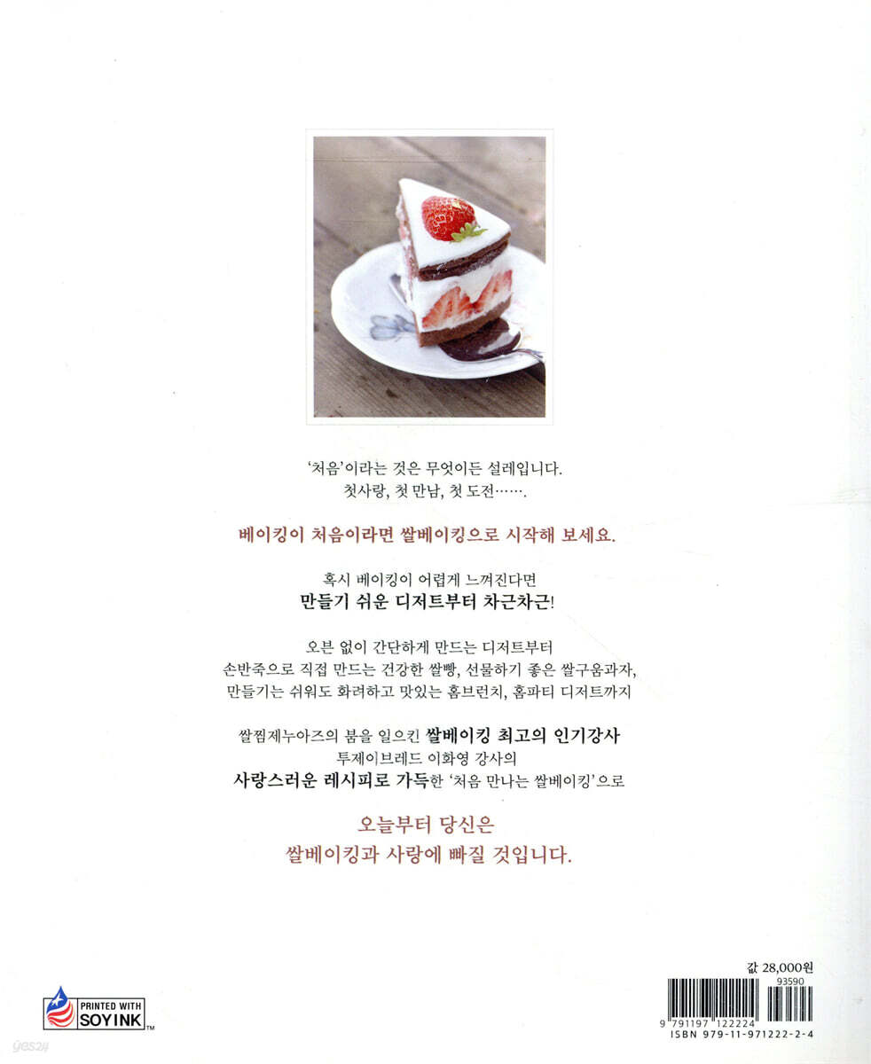 01. 곡류와 쌀에 대하여 02. 쌀가루와 밀가루의 차이 03. 쌀가루의 종류 04. 쌀베이킹을 위한 기본도구 05. 알아두면 유용한 베이킹 TIP Chapter01 ▶No오븐 쉬운 베이킹 (찜기·가스·밥솥) 01. 건포도 컵케이크 02. 호박 찜카스텔라 03. 무화과 치즈머핀 04. 말차 크림치즈 설기 05. 초코 딸기 찜케이크 06. 흑임자 영양찰떡 07. 흑미 호두과자 08. 쑥 건포도 찜케이크 09. 말차 찜카스텔라 10. 바닐라 치즈케이크 Chapter 02 ▶오븐만으로 쉬운 베이킹 01. 견과 듬뿍 찹쌀타르트 02. 무화과 찹쌀빵 03. 초코찰빵 04. 레오 마들렌 05. 양파 치즈 마들렌 06. 단호박 치즈케이크 Chapter 03 ▶손 반죽으로 만드는 건강한 쌀빵 01. 모닝빵 02. 먹물 롤치즈빵 03. 브리오슈 큐브식빵 04. 소시지 피자빵 05. 피자롤빵 06. 브리오슈 식빵 07. 먹물 치즈 큐브식빵 08. 잉글리시 머핀 09. 먹물 치즈 머핀 Chapter 04 ▶집에서도 손쉽게 홈브런치 01. 하와이안 미니버거 02. 핫치킨 토스트 03. 햄치즈 토스트 04. 불고기 토스트 05. 프렌치 토스트 06. 햄치즈 머핀 07. 블랙 새우 머핀 08. 비나그래찌 Chapter 05 ▶선물하기 좋은 구움과자 01. 콩가루 사브레 02. 단호박 사브레 03. 촉촉한 초코쿠키 04. 프라리네 다쿠아즈 05. 베리 다쿠아즈 06. 말차 쑥 다쿠아즈 07. 피스타치오 캐러멜 다쿠아즈 08. 쑥 피칸 스노우볼 09. 갈레트브루통 10. 새우 명란 스콘 11. 밀크티 스콘 12. 유자 코코 휘낭시에 13. 먹물 치즈 휘낭시에 14. 오꼬노미 휘낭시에 15. 허니고르곤 휘낭시에 Chapter 06 ▶홈파티로 즐기는 데일리 디저트 01. 시나몬 파운드케이크 02. 쑥절미 머핀 03. 유자 머핀 04. 베리치즈 머핀 05. 당근피칸 머핀 06. 말차 하트 파운드케이크 07. 딸기타르트 |