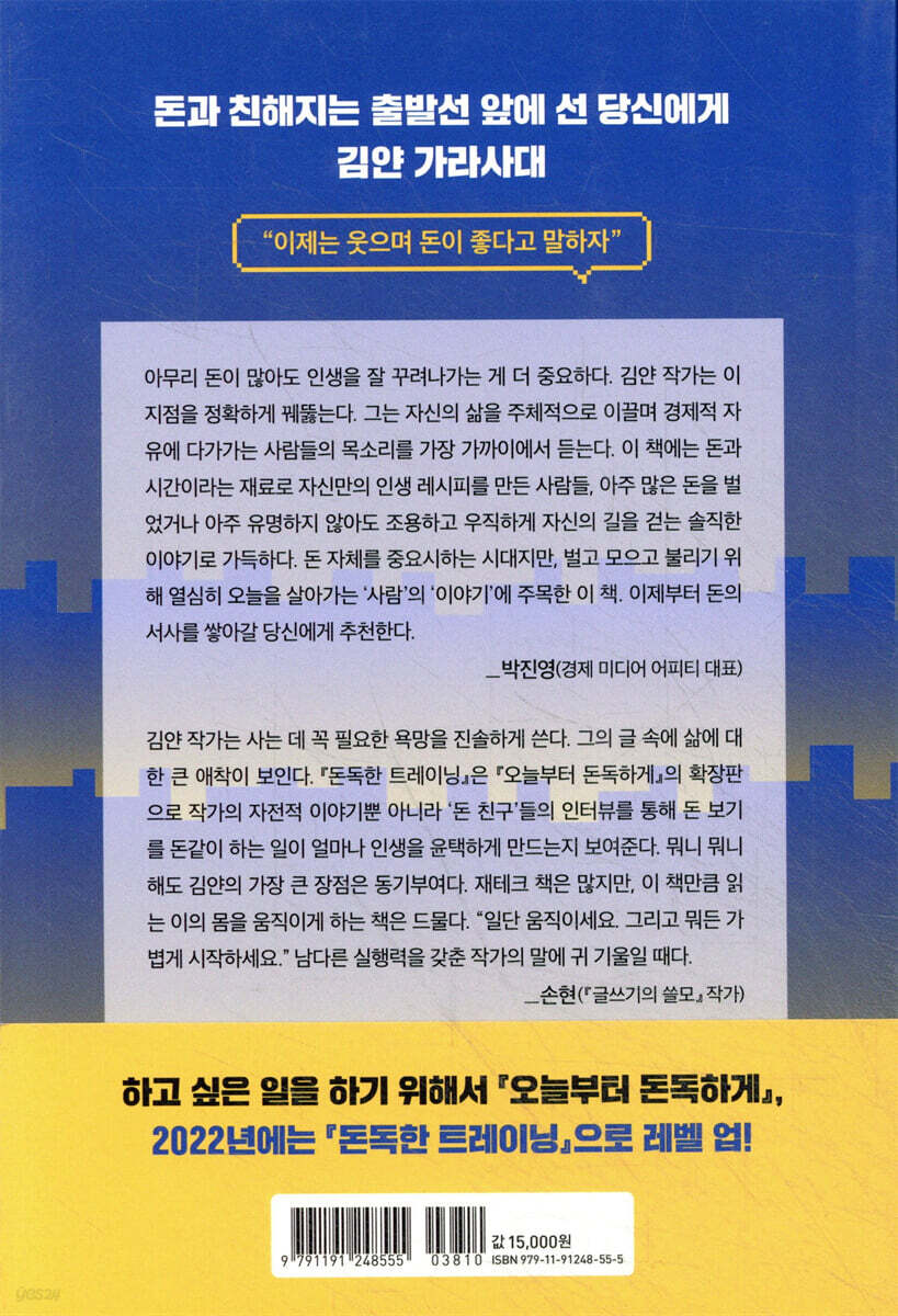 (서두에도 나와 있지만) 나는 김얀 작가가 블로그를 할 때부터 그의 글을 좋아하던 독자다. 어쩌다 보니 10년 동안 그가 쓴 글을 읽다 보니 이제는 공통점이 보인다. 다들 쉬쉬하지만 사는 데 꼭 필요한 욕망을 진솔하게 쓴다는 점. 나아가 삶에 대한 애착이 크다는 점이다. 『돈독한 트레이닝』은 『오늘부터 돈독하게』의 확장판으로 작가의 자전적 이야기뿐 아니라 ‘돈 친구’들의 인터뷰를 통해 돈 보기를 돈같이 하는 일이 얼마나 인생을 윤택하게 만드는지 보여준다. 뭐니 뭐니 해도 김얀의 가장 큰 장점은 동기부여다. 재테크 책은 많지만, 이 책만큼 읽는 이의 몸을 움직이게 하는 책은 드물다. “일단 움직이세요. 그리고 뭐든 가볍게 시작하세요.” 남다른 실행력을 갖춘 작가의 말에 귀 기울일 때다. - 손현 (『글쓰기의 쓸모』 작가)