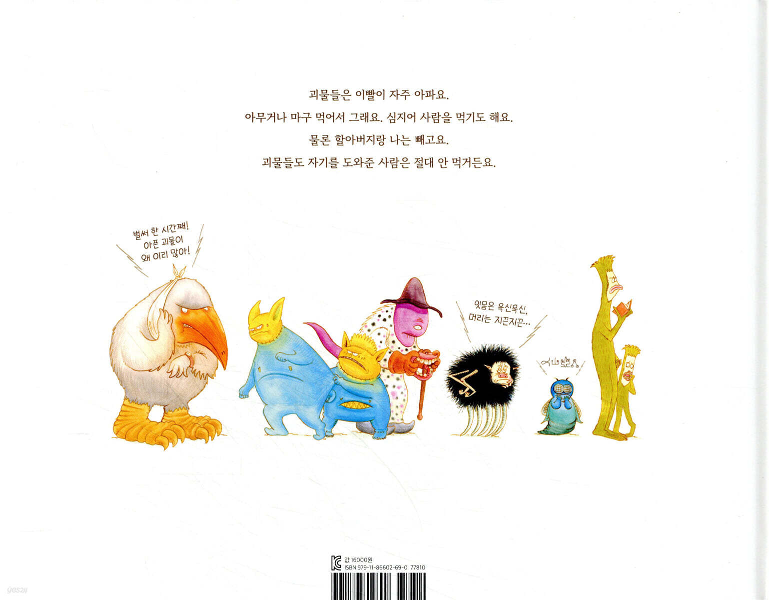 ‘미카’가 할아버지와 단둘이 사는 집 앞은 날마다 괴물들로 북적거린다. 괴물 마을에 단 하나뿐인 치과이기 때문이다. 괴물들은 이빨이 자주 아프다. 아무거나 마구 먹어서 그렇다. 괴물 마을에서 괴물들이 가장 무서워하는 곳, 바로 괴물 치과다. 그런데도 괴물들이 제 발로 괴물 치과까지 찾아오는 이유는 이빨을 뚫고, 긁고, 갈고, 뽑는 아픔보다도 충치 때문에 겪는 고통이 훨씬 크기 때문이다. 특히나 괴물은 덩치가 클수록 더 많이, 더 마구 먹어서 충치가 더 잘 생긴다. 심지어 커다랗고 사나운 큰 괴물들은 사람을 먹기도 한다. 다행히 할아버지와 미카는 빼고. 괴물들도 자기를 도와준 사람은 절대 안 먹는다. 어느 날 아주아주 큰 괴물의 이빨을 치료하다가 미카는 이빨 틈에서 작은 아이를 구해낸다. 큰 괴물에게 잡아먹힐 뻔했다가 가까스로 살아남은 아이의 이름은 ‘미지’다. 갈 곳 없던 미지는 미카의 도움으로 괴물 치과에 머물며 요리 솜씨를 발휘하고, 미지의 음식 맛을 본 괴물들이 하나둘 모여들면서 괴물 치과는 이빨을 치료하려는 괴물뿐만 아니라 미지의 음식을 맛보려는 괴물들로 더욱 북적거리게 된다. 괴물 치과에서 치료도 받고 건강한 음식도 얻어먹으며 ‘도움’을 받은 괴물들이 늘어나면서, 더 이상 괴물 마을에서는 아무거나 마구 먹는 괴물들을 찾아볼 수 없게 되나 싶었는데…. ● 서로 돕고 나누던 관계가 서로 먹고 먹히는 관계에 위협받는, 괴물 마을 크기와 모습과 성격이 제각각인 괴물들은 ‘괴물 치과’에 모여 아픈 이빨을 치료받고 다른 존재들과 맛난 음식을 나누면서 점점 잘 먹고 잘 살아가게 된다. 괴물들의 이빨을 치료해주는 미카와 할아버지, 그리고 산과 들에서 구한 풀과 곡식으로 맛난 음식을 만들어 괴물들을 먹여주는 미지는 괴물들을 ‘살리는’ 존재다. 그런데 여기에 미지가 정성껏 만든 음식은 ‘괴물 음식’이 아니라며 괴물은 풀떼기 따위는 먹지 않는다고 을러대는 큰 괴물들이 나타나면서, 서로 돕고 나누던 관계는 서로 먹고 먹히는 관계로 위협당하고 만다. 크고 힘센 큰 괴물들을 당해내지 못하면 미지가 잡아먹혀야 하는 ‘괴물 시합’에서 미지와 미카, 그리고 작은 괴물들은 큰 괴물들을 어떻게 이길 수 있을까? ● 욕심 많은 큰 괴물이 사라지자 충치도 사라졌다 큰 괴물들이 등장하면서 생겨난 위기를 간신히 극복한 기쁨도 잠시, 엎친 데 덮친 격으로 큰 비가 쏟아져 괴물 마을 전체를 덮친다. 피할 곳은 단 하나, 괴물 치과뿐이다. 커다란 재앙 앞에서 미카와 미지와 괴물들은 다시 함께 돕고 나누며 연결된 존재, 한 배를 탄 공동체가 된다. 미지는 다시 음식을 만들어 괴물들을 먹여 살리고, 미카는 괴물들의 아픈 이를 치료한다. 괴물들도 미지와 미카를 도우며 저마다 필요한 일을 맡아서 열심히 해낸다. 그렇게 한 배를 타고 지내는 동안, 저 혼자 하고 싶은 대로 하겠다고 고집 부리고 먹고 싶은 대로 못 먹어 투정을 부리던 큰 괴물도 사라진다. 그러고는 마침내 새로운 섬에 도착하는데…. ● 우리가 ‘먹는 것’을 통해 우리가 ‘살아갈 세상’을 생각하게 하는 그림책 이 책은 ‘무시무시한 존재도 무서워하는 것이 있을까?’라는 생각에서 시작되었다. 김한민 작가는 ‘괴물’을 너무 좋아했고 ‘치과’를 끔찍이 싫어했던 어린 시절의 기억에서 ‘치과를 무서워하는 괴물’을 떠올렸다. 괴물 마을에도 치과가 있을까? 치과에는 어떤 괴물들이 올까? 그 괴물들은 왜 충치를 앓게 됐을까? 맞아, ‘아무거’나 ‘마구’ 먹어서! 이 책에서 괴물들이 자주 이빨이 아픈 것도, 괴물 치과에 괴물들이 몰려든 것도, 큰 괴물들이 소동을 피운 것도, 그러다 커다란 재앙을 만난 것도, 이유를 거슬러 가다보면 모두 괴물들이 ‘먹는 것’과 이어져 있다. 김한민 작가는 작품 활동을 하는 한편 해양환경보호단체 ‘시셰퍼드’에서 환경운동가로도 활동하고 있다. 『괴물 치과』는 작가가 ‘치과에 가기 싫어했던’ 어린 시절의 경험을 ‘괴물’에 비추어 활발한 그림과 왁자지껄한 이야기로 풀어냄과 동시에, 우리가 앞으로 살아갈 세상은 우리가 지금 ‘먹고 있는 것’과 가까이 연결되어 있다는 사실을 넌지시 보여준다. 지구가 망가지고 평화가 깨지고 관계가 끊어지는 것, 바로 우리가 ‘아무거’나 ‘마구’ 먹는 큰 괴물처럼 살고 있어서일지도 모른다고 말이다. |