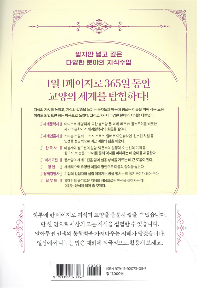 일상의 품위를 한층 높여주는 교양의 힘 교양은 ‘소양’이라고도 불리며, 우리가 살아가는 사회에서 반드시 갖춰야 하는 역량이다. 그런 까닭에 늘 배우고 익혀서 자신의 삶에 적용하는 연습이 필요하다. 교양을 습득하는 방법은 다양하지만, 독서를 통해서 얻는 지식이 그 바탕이 된다고 할 수 있다. 이 책은 짧은 시간에 다양한 분야의 교양을 키울 수 있도록 구성되어 인생의 품위를 한층 높여준다. 바쁜 현대인들에게 무엇보다 효율적으로 세계의 문학사, 인물사, 경제경영사, 고전 등 다양한 주제를 단시간에 접할 수 있는 책이다. 여러 권의 책을 읽는 것이 부담스럽고 시간이 부족하다면 이 책으로 교양을 쌓아보는 것이 좋다. 방대한 지식의 양이지만 하루에 1페이지를 읽는 것만으로도 교양의 폭을 넓히고, 세상을 바라보는 관점이 변화하는 즐거움을 느낄 수 있을 것이다. |