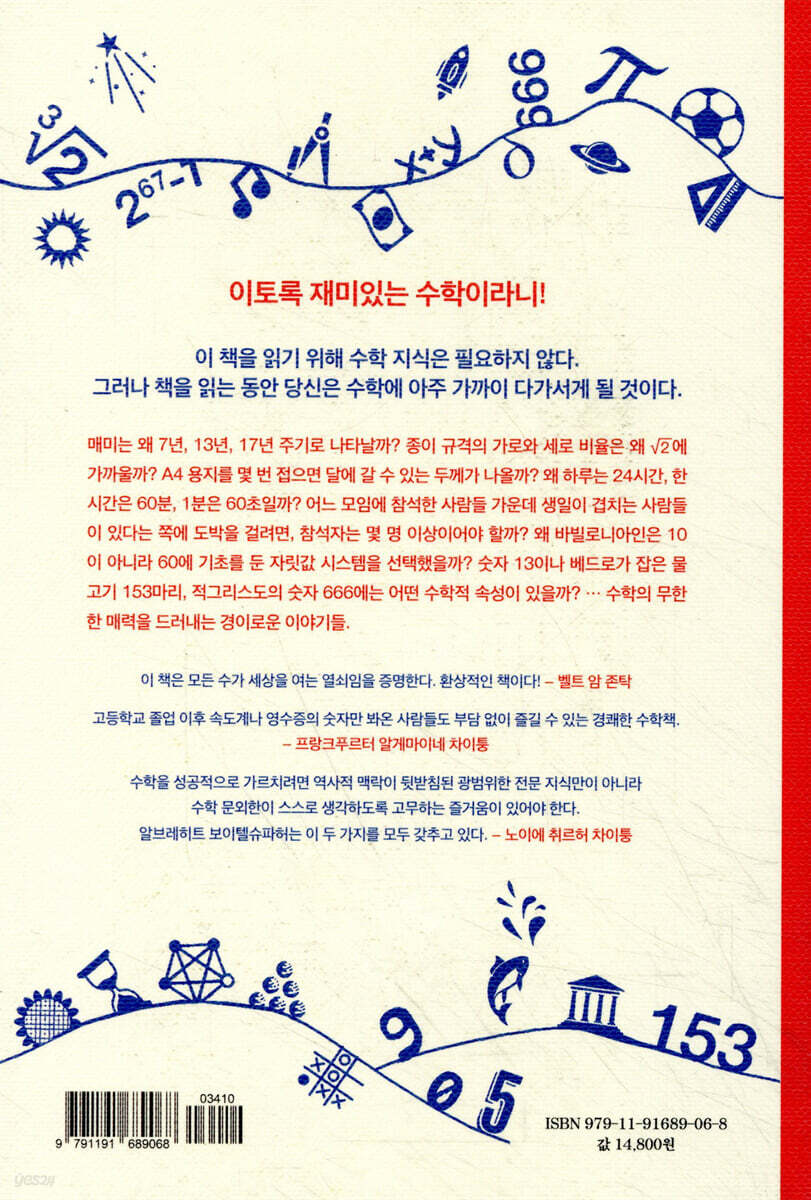 보이텔슈파허는 아무리 어려운 이야기도 쉽고 재미있게 풀어가는 놀라운 재주가 있다. 수학에 흥미를 유발하는 수준이 아니다. 이 책을 읽어나가는 사이 독자들은 금광을 캐듯 학교에서 좀처럼 가르치지 않는 수의 본질적 속성에 눈뜨게 된다. 여러 자연수와 무리수, 소수, 음수, 분수, 소수점, 초월수, 허수, 무한(∞) 등에 관한 이야기를 따라가다 보면, 어느 순간 무미건조하게만 보이던 숫자들이 고유한 생명을 얻는다. 비유만은 아니다. 생존율을 높이기 위해 7년, 13년, 17년 등 소수 주기로 세상에 등장하는 매미와 피보나치수열을 해바라기 씨앗의 배열을 보라! 보이텔슈파허의 말마따나, 수는 세상을 여는 열쇠다! 경이로운 것은 수들의 속성만이 아니다. 수의 속성을 찾고자 하는 수학자들의 집념과 인내력도 경이롭다. 이를테면 수학자 구스타프 메르헤스는 이미 가우스에 의해 작도가 가능하다고 증명된 정65,537각형의 작도에 도전한다. 그는 그 일을 10년 만에 해낸다. 그리고 그 과정을 기록해 괴팅겐 대학에 논문으로 제출한다. 이런 논문을 쓴다는 것도 상상하기 어렵지만, 그 논문을 읽어 검증한다는 것도 상상하기 어렵다. “이 과업을 실행한 사람은 아직 없다.” (〈65,537: 궤짝 안의 수〉) 1903년 10월 31일 수학자 프랭크 넬슨 콜은 강단에 올랐다. 이미 소수가 아님이 증명되었지만 아무도 그 약수가 무엇인지 몰랐던 수 267-1의 약수를 자신이 발견했다는 것을 입증하기 위해서였다. 콜은 자리에서 일어나 먼저 왼쪽 칠판으로 가서 칠판 위쪽에 267-1이라고 적고 아무 말 없이 그 값을 칠판 위에 계산해갔다. 그런 다음 또 아무 말 없이 오른쪽 칠판으로 가서 193,707,721과 761,838,257,287을 계산했다. 꼼꼼하고 참을성 있게 계산한 끝에 콜은 왼쪽 칠판에 적혀 있는 수와 똑같은 수를 얻었다. 강연 내내 콜은 침묵했다. 그럼에도 청중은 기립박수로 이 강연에 경의를 표했다. 훗날 그는 그 약수들을 어떻게 찾아냈냐는 질문을 받고 이렇게 대답했다. “3년 동안 일요일마다.” (〈267-1: 말 없이〉) 왜 음수 곱하기 음수는 양수일까? 이 책은 음수나 , π 등 우리가 그냥 원래 그런 것이라고 자연스럽게 받아들이는 수들의 새로운 면모를 보여준다. 먼저 음수. “교수가 강의실 앞에 서 있다. 그는 학생 다섯 명이 강의실에 들어가는 것을 보고 얼마 후에 여섯 명이 나오는 것을 본다. 교수는 생각한다. ‘이제 한 명이 들어가면 강의실이 다시 텅 비겠군.’” 이 수학적 재담은 음수가 그렇게 간단히 취급할 수 있는 문제가 아님을 은연중에 드러낸다. 수천 년 동안 사람들은 음수를 받아들이기를 꺼렸다. 아무것도 없는 상태에서 또 무언가를 뺀다는 것을 상상하기가 어려웠기 때문이다. 그래서 1544년 저서 『종합 산술Arithmetica integra』에서 최초로 음수가 존재할 권리를 인정한 수학자 미하엘 슈티펠도 음수를 “터무니없는 수”라고 불렀다. 어려운 질문 하나. 음수 곱하기 음수는 왜 양수인가? 이를테면 (-1) 곱하기 (-1)은 왜 +1인가? 초등학교 저학년도 코웃음 칠 문제이지만, 그 이유를 설명해 보라면 대부분의 사람들은 눈을 동그랗게 뜨며 놀란 표정을 지을 것이다. 이에 대한 납득할 만한 설명은 19세기에 이르러서야 수학자 헤르만 항켈에 의해 이루어졌다. (〈-1: 터무니없는 수〉) 보이텔슈파허는 이 책에서 플라톤의 대화편 『메논』을 인용하여 가 등장하게 되는 순간을 설명한다. 그러고 나서 가 어째서 무리수인지 유클리드의 증명 방식을 보여준다. 증명 과정을 따라가는 것은 어렵지 않지만, 경탄이 절로 나온다. 마지막으로 “어떤 종이 전체와 그 종이의 4절지, 8절지, 16절지가 모두 닮은꼴이 되려면, 종이의 규격이 어떠해야 할까”라는 물음의 답에서 는 다시 등장한다. 는 우리의 일상생활 어디에나 있다. A4 용지는 이 아이디어에서 탄생한 것이기 때문이다. (〈: 탁월한 무리수〉) π 값 알아내기 π의 근삿값이 3.14라는 것은 누구나 알고 있다. 하지만 그 값은 어떻게 구하는가, 라는 질문에 자신 있게 답변할 사람은 많지 않을 것이다. 그런데 π의 값은 왜 알아야 할까? 약 6,000년에 혁명적인 발명이 하나 이루어졌다. 바로 바퀴다. 바퀴 덕분에 엄청난 노력을 들여 조금씩 끌어 움직일 수 있었던 짐을 사람들은 수레에 실어 쉽게 옮길 수 있게 되었다. 그런데 바퀴를 제작하려면 그 둘레와 면적을 알아야 한다. 그래야 바퀴 제작에 필요한 재료의 양을 구할 수 있기 때문이다. 문제는 그 값을 정확히 계산하고자 할 때 그 문제가 영원히 해결되지 않는다는 것이다. 사람들은 그 값을 구하려면 지름에 특정한 수를 곱해야 한다고 생각했다. 그 특정한 수가 바로 π의 값이다. 세계 여러 곳에서 채택된 최초의 근삿값은 π=3이었다. 기원전 1900년에 바빌로니아인은 π= 25/8=3.125를 채택했다. 기원전 1650년 이집트의 린드 파피루스에는 π=(16/9)2?3.1605가 등장한다. 기원전 4세기에 인도 수학자들은 π=339/108?3.139를 채택했다. 그러고 나서 우리는 아르키메데스의 놀라운 사고의 전환을 만난다. “아르키메데스(기원전 288-212)의 연구는 수 π를 간단히 표현할 수 있다는 생각을 완전히 추방했다. 그는 이렇게 생각했다. ‘원의 둘레를 알아내기