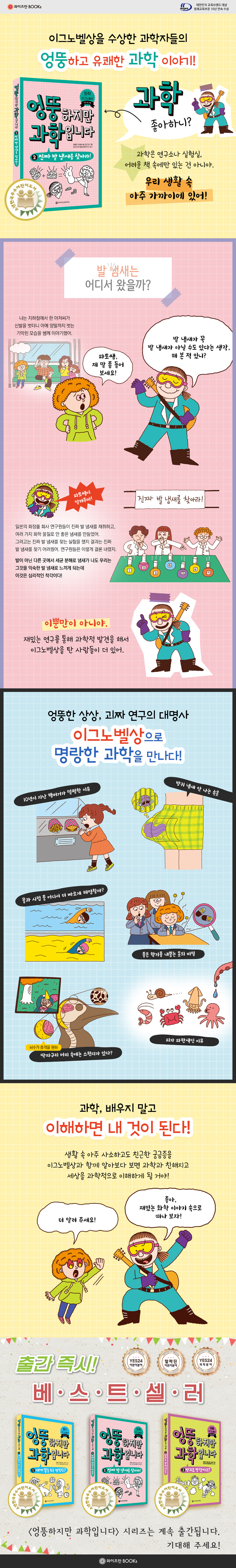 이 책에는 10년이 지난 햄버거와 54년 전에 만든 통조림이 어떻게 멀쩡할까? 향수를 뿌리거나 방금 세탁하지 않은 옷에서 어떻게 좋은 향기가 날까? 크론병을 앓고 있는 아내를 위해 냄새를 가두는 속옷을 발명한 남편의 이야기에서 필터는 어떻게 냄새와 먼지를 걸러 낼까? 물과 시럽 중 어디서 더 빠르게 헤엄칠까? 와 같은 우리가 한 번쯤 궁금해 하거나 호기심을 가질법한 엉뚱한 질문과 연구로 가득하다. 아주 사소하고도 친근한 생활밀착형 궁금증을 이그노벨상과 함께 알아보다 보면 과학과 친해지고 세상을 과학적으로 이해가게 된다. 열 마디 말보다 내 마음을 더 잘 표현하는 이모티콘과도 같은 두 주인공의 표정, 인포그래픽처럼 핵심과 원리만 쏙쏙 뽑아 쉽고 간결하게 과학 정보를 전달하는 그림과 디자인은 『엉뚱하지만 과학입니다』를 읽는 책이 아닌 보는 책으로 만들어 주어 또 다른 즐거움을 선사할 것이다. 과학, 배우지 말고 경험하고 이해하면 내 것이 된다! 과학은 연구소나 실험실, 어려운 책 속, 아니면 먼 미래에만 있는 게 아니라 생활 속 우리 가까이에 있다는 이야기, 참 많이 듣지만 쉽게 와 닿지 않는다. 어려운 과학 용어나 법칙, 공식이라도 마주하면 머리부터 아프다. 특히 아이들은 과학을 교과서로 배우고 시험까지 봐야 해서 더욱 멀고 어렵게만 여긴다. 와이즈만북스의 『엉뚱하지만 과학입니다』 시리즈는 이런 아이들에게 과학은 쉽고 재미있는 것이라고 직접 보고 느끼게 할 수 있는 방법이 없을까 하는 고민에서 출발했다. ‘아주 엉뚱하고 기발한 이야기를 읽었을 뿐인데 어느새 과학을 마주하고 이해하고 생활에 적용까지 하고 있네!’ 이것이 『엉뚱하지만 과학입니다』 시리즈가 지향하는 어린이를 위한 과학책의 방향이다. 『엉뚱하지만 과학입니다』에서 다루는 내용은 기발하고 엉뚱해서 아이들의 호기심을 자아낸다. 그래서 아이 스스로 혼자서 끝까지 읽어낼 수 있다. 읽는 데서 그치는 게 아니라 이해하고 소화해서 주변과 세상을 이해하고 의문을 갖고 분석하고 해결하려는 힘, 즉 과학문해력을 갖추게 된다. 다음의 세 가지 전제에서 출발한 『엉뚱하지만 과학입니다』시리즈는 과학적 사고력과 문제해결력은 물론 과학문해력까지 키울 수 있도록 구성했다. 첫째, 과학은 가까이 있다! 과학은 어려운 책이나 복잡한 실험실, 알 수 없는 기계 속에만 있는 게 아니다. 우리 가까이, 어디에나 있다. 아침에 일어나 잠들 때가지 우리가 접하는 모든 것에 과학의 원리가 숨어 있다. 둘째, 과학은 엉뚱한 상상에서 출발했다! 지금까지 과학의 원리라고 밝혀진 것들은 모두 나, 주변, 세상을 이해해 보려는 호기심과 노력에서 출발했다. 작은 호기심, 엉뚱한 상상, 이해해 보려는 노력에서 출발한 작은 시도들이 모이고 쌓여 과학의 원리로 입증된 것이다. 셋째, 과학은 이해하면 쉬워지고 쉬워지면 좋아진다! 과학을 어려워하는 아이들도 재미있고 친근한 주제로 접근하면 과학을 이해할 수 있다. 과학을 이해하면 과학을 좋아하게 되고 사고력과 문제해결력을 키울 수 있을 뿐 아니라 세상을 과학적으로 이해하는 과학문해력까지 갖추게 된다. 엉뚱한 상상, 괴짜 연구의 대명사 이그노벨상으로 명랑한 과학을 만나다! 이그노벨상은 하버드 대학교 유머 과학 잡지 [애널스 오브 임프로버블 리서치]가 과학에 대한 대중의 관심을 불러일으키기 위해 노벨상을 패러디해서 1991년 제정한 상으로, 물리, 화학, 의학, 수학, 생물, 평화 등 여러 분야에 걸쳐 수상자를 선정한다. 선정 기준은 ‘사람들을 웃게 하거나 생각하게 만드는 연구를 해서, 과학에 대한 관심을 높인 연구자’다. 그래서 이그노벨상을 수상한 연구는 엉뚱하고, 기발하다. 여기에서 그치는 것이 아니라 ‘과학이 재미있구나!’ ‘과학은 우리 생활 속에 있구나!’라는 걸 깨닫게 해 준다. 『엉뚱하지만 과학입니다』 시리즈는 초등 교과 과학 원리를 재미있게 경험할 수 있는 연구 50개를 뽑았다. 그리고 그 연구들을 다시 물리, 화학, 생물, 지구과학, 정보·환경공학의 5개 분야로 나누어 한 권에 한 분야씩 담았다. 첫 권 물리 편 『개가 똥을 누는 방향은?』을 시작으로, 2022년 상반기에 화학 편 『진짜 발 냄새를 찾아라!』, 생물 편 『방귀로 말해요!』, 지구과학 편 『메기가 꼬리를 흔들면 지진이 일어난다?』, 정보·환경공학 편 『미스터리 서클의 비밀을 풀어라!』(이상 가제)을 순차적으로 출간할 계획이다. |
