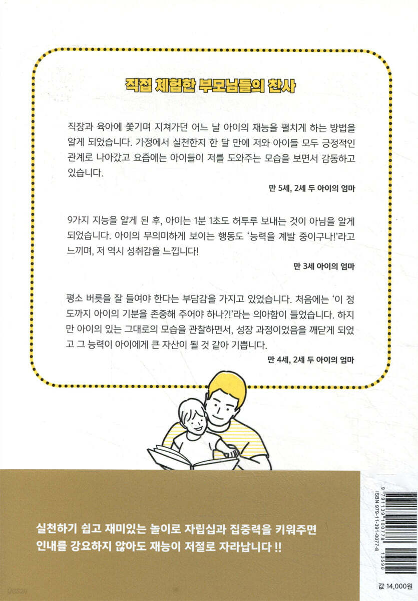 몬테소리 교육의 목표를 한마디로 표현하면 ‘자립’이며 아이들이 자발적으로 결정하도록 독려한다. 아이들은 놀이를 통해 자신이 원하는 것을 스스로 발견하고 선택하는 자주성, 만족할 때까지 몰입하는 집중력, 목표를 완수한 후에 느끼는 성취감을 경험한다. 그 과정에서. 발상력, 문제해결력, 응용력이 자라나고 자립을 향해 나아가게 된다. 자립은 자신의 인생에 대해 스스로 생각하고 결정할 수 있다는 것을 의미한다. 자립을 제대로 준비한 아이들은 자발적으로 생각하고 행동하는 힘을 바탕으로 어른이 되어서도 다양한 분야에서 개성을 꽃피우며 활약한다. 가정에서 아이의 자발적 활동을 지원하면 자립이 촉진되기 때문에 그만큼 부모는 시간과 마음의 여유가 생긴다. 부모가 육아에 매몰되지 않고 자기계발을 통해 느끼는 성취감과 기쁨은 자녀에게도 긍정적인 영향을 미치며 빛나는 선순환을 이루게 된다. 하버드 식 두뇌계발을 통해 아이의 잠재된 능력이 보인다 아이가 가지고 있는 능력은 가능성으로 가득 차 있다. 아이의 가능성을 단편적으로 판단하지 말고 다양한 관점에서 파악하고 성장을 지원해 주는 것이 중요하다. 그러나 아이가 가진 능력의 범위를 알지 못하면 ‘왜 저런 행동을 하는 것인지’ 이해하지 못하고 부모의 지식과 경험에서 비롯된 교육 방식을 강요하게 될 위험이 있다. 아이가 티슈를 계속 뽑아대는 것은 말썽을 부리고 관심을 얻으려는 목적이 아니라 손으로 잡고 뽑아내는 신체운동 능력을 발달시키고 싶은 욕구에서 비롯된 행위이다. 장난감을 던지는 것 역시 거리감을 파악하고 싶은 호기심 때문이다. 하지만 아이의 설명을 들을 수 없는 부모는 아이의 행동을 자의적으로 해석하고 답답함과 걱정이 앞설 수밖에 없다. 모든 아이는 태어날 때부터 9가지 지능을 가지고 있으며 재능이 없는 아이는 없다. ‘9가지 지능’의 관점으로 아이를 바라보면 지금까지 미처 알지 못했던 잠재된 능력들이 보이고, 아이의 행위들이 사실 재능의 표현이었음을 깨닫게 된다. 아이의 재능을 늘리려면 아이가 원하는 만큼 능력을 발휘하게 해주는 방법을 고안해야 한다. 이 책에서는 아이의 행동 이면에 담긴 마음의 소리와 부모는 곤란하지 않고 아이는 마음껏 누릴 수 있는 육아 아이디어들을 제시하고 있다. 육아 상황이 비슷했던 부모들의 체험담을 통해 어렵지 않게 실천할 수 있음을 알 수 있다 직장과 육아에 쫓기면 지쳐가던 어느 날 아이의 재능을 펼치게 하는 방법을 알게 되었습니다. 가정에서 실천한지 한 달 만에 저와 아이들 모두 긍정적인 관계로 나아갔고 요즘에는 아이들이 저를 도와주는 모습을 보면서 감동하고 있습니다. (만 5세, 2세 두 아이의 엄마) 9가지 지능을 알게 된 후, 아이는 1분 1초도 허투루 보내는 것이 아님을 알게 되었습니다. 아이의 무의미하게 보이는 행동도 ‘능력을 계발 중이구나!’라고 느끼며, 저 역시 성취감을 느낍니다! (만 3세 아이의 엄마) 평소 버릇을 잘 들여야 한다는 부담감을 가지고 있었습니다. 처음에는 ‘이 정도까지 아이의 기분을 존중해 주어야 하나?!’라는 의아함이 들었습니다. 하지만 아이의 있는 그대로의 모습을 관찰하면서, 성장 과정이었음을 깨닫게 되었고 그 능력이 아이에게 큰 자산이 될 것 같아 기쁩니다. (만 4세, 2세 두 아이의 엄마) 육아가 시작되고, 여러 가지 문제에 직면하면서 저의 자기긍정감도 낮아진 상태였습니다. 빛나는 재능을 키워주는 방법을 통해 저 자신을 대면하는 방법도 익히게 되었습니다. 그러고 나니 남편과 아이와의 관계도 더욱 돈독해졌습니다. (만 3세 아이의 엄마) |