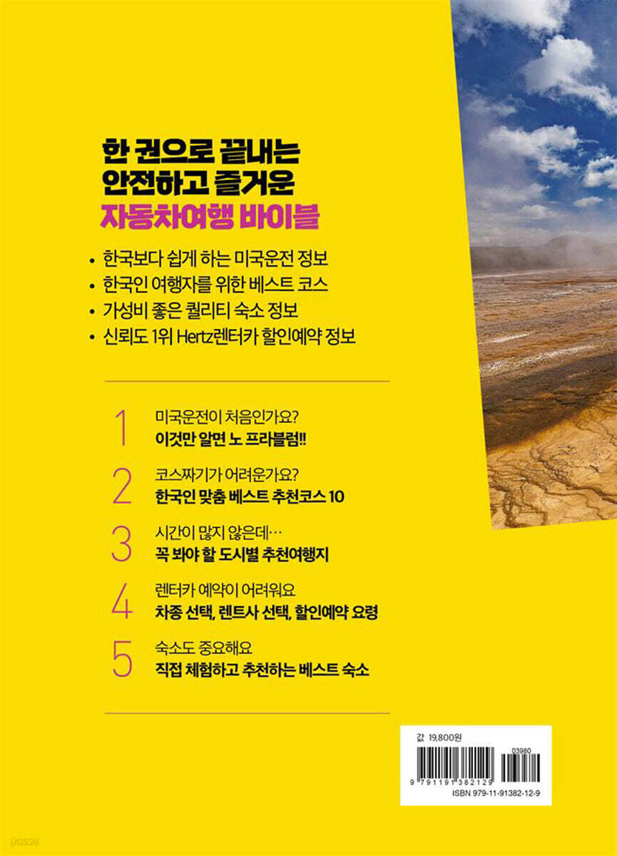 - 한국인 여행자를 위한 베스트 추천코스 10 - 가성비 좋은 퀄리티 숙소 정보 - 신뢰도 1위 Hertz렌터카 할인예약 정보 코로나 이후의 여행에서 가장 두드러진 변화는 ‘안전한 여행’ 이 되었다. 단체여행에서 개별여행으로, 대중교통에서 렌터카로 옮겨가는 것이 세계 여행의 추세이지만 코로나 사태를 계기로 그 변화의 속도가 훨씬 빨라졌다. 대중교통 요금보다 자동차 기름값이 더 싼 나라가 미국과 캐나다다. 이런 나라에서 외국인 여행자가 대중교통을 이용해 구석구석 여행한다는 것은 무척 어렵고 놀라운 일일 수 있다. 하지만 30년 넘게 자동차로 유럽과 미국, 캐나다를 해외 여행해온 전문가 부부와 함께 책을 따라가다 보면 안전하고 알차게 미국과 캐나다를 돌아볼 수 있을 것이다. 1 미국운전이 처음이어도 이것만 알면 노 프라블럼!! 미국과 캐나다는 한국사람들의 운전상식과 판이하게 다른 교통규칙도 많고, 몰라서 엄청난 벌금을 미국에 기부하고 오는 사람들도 적지 않았다. 한국사람들이 미국과 캐나다에서 가장 주의해야 할 교통규칙은 ‘스톱사인’이다. 미국도로를 운전하면서 가장 많이 만나는 표지판이 스톱 표지판이고 가장 철저하게 지켜야 할 것도 스톱 표지판이다. 한국의 표지판은 대부분 ‘어떻게 하라’는 규정을 담고 있지만 미국의 표지판은 대부분 금지규정을 담고 있다. 금지되지 않은 것은 모두 자유다. 신호등 없는 교차로에서의 우선순위는 먼저 스톱한 차에게 있다는 것, 꼬리물기 금지, 신호등 보는 법과 규제표지판 보는 법만 미리 숙지하면 미국에서의 운전도 문제없다. 2 코스짜기가 어려운가요? 한국인 맞춤 베스트 추천코스 10 한국 사람들이 가장 많이 가는 여행코스인 로스엔젤레스와 라이베이거스 일주일 코스, 로스엔젤레스와 샌디에이고 코스, 낭만 도시 샌프란시스코와 웅장한 대자연을 느낄 수 있는 요세미티 국립공원을 묶은 일주일 가족여행코스, 미 서부에서 가장 유명한 두 도시 샌프란시스코와 로스엔젤레스 일주일 코스, 시애틀/밴쿠버와 샌프란시스코 또는 LA 일주일 코스, 토론토 스톱오버로 뉴욕 왕복 항공권을 끊어서 토론토와 나이아가라, 뉴욕을 돌아보는 일주일 코스 등 한국인 맞춤 베스트 추천코스 10을 알차게 안내한다. 이대로만 따라가셔도 좋다! 3 시간이 많지 않다면, 꼭 봐야 할 도시별 추천여행지 세계최대의 도시, 세계최대의 테마파크, 세계최대의 계곡 등 미국에는 ‘세계적인’ 것들이 정말 많다. 미국은 미국대로 캐나다는 캐나다대로, 또 동부와 서부 남부와 북부는 제 나름의 특성을 지니고 여행자들의 발길을 이끈다. 땅도 넓고 가볼 곳도 많지만 이 책에서는 그 중에도 꼭 가볼 만한 곳들을 골라서 우선적으로 소개했다. 그 중에서도 또 골라서 “이건 정말 세계적인 관광지, 천하 없어도 여긴 꼭 가야 해!” 하는 곳은 별표 3개(탑오브더락, 타임스퀘어, 금문교, 씨월드, 테마파크(디즈니랜드/유니버설스튜디오/넛츠베리팜, 나이아가라폭포, 옐로스톤 국립공원 등)로 표시했고, “하루밖에 시간이 없다면 이곳으로!” 하는 곳은 별표 2개(자유의 여신상, 모마, 게티센터, 샌디에이고 동물원, 모뉴먼트 밸리 등), “이틀 이상 시간을 낼 수 있다면 여기는 놓치지 마라~”하는 곳은 별표 한 개(미국 자연사 박물관, 드 영 뮤지엄, 트윈픽스, 헌팅턴, 티후아나 등)로 표시하였다. 한 번의 여행으로 모두를 다 볼 수는 없겠지만, 기회가 닿는 대로 야금야금, 미국과 캐나다도 한동안 다녀볼 만한 충분한 매력을 지닌 여행지다. 여행전문가의 발길 따라 함께 Go Go~ 4 렌트카 예약이 어려워요 - 차종 선택, 렌트사 선택, 할인예약 요령 미국과 캐나다 여행준비는 어찌 보면 무척 간단하다. 항공편과 렌터카만 예약되면 여행준비는 다 된 셈이나 마찬가지다. 항공권도 네이버나 그 외 가격비교사이트에서 클릭 몇 번이면 결제까지 완료할 수 있고, 렌터카도 미국 캐나다 거의 모든 도시에서 원하는 차종을 예약해 쓸 수 있다. 어디를 가나 손쉽게 들어갈 수 있는 숙박시설들, 어느 도시에서나 만날 수 있는 한국마켓과 식당, 그리고 여행자 맞춤형으로 잘 짜여진 관광시스템들이 별다른 준비 없이도 미국과 캐나다 여행을 즐겁게 다닐 수 있게 해준다. 미국과 캐나다 자동차여행은 유럽이나 다른 나라에 비해 심적 부담이 적은 것이 사실이다. 미국/캐나다의 국내에서는 어느 도시에서나 픽업/반납을 할 수 있다. 그러나 주를 건너가 반납할 경우는 그 차를 다시 회수해 가는 비용 ‘Drop Fee’를 내야 하고 그 비용은 두 도시간 거리에 따라 달라지는데 적으면 $100 정도부터 대륙을 횡단하는 경우는 $750까지 나오는 것으로 예상할 수 있다. 그러나 주를 건너가 반납하더라도 편도비용이 없는 경우도 있고 이런 조건은 렌트사별로 다르므로 예약(견적)할 때 확인해야 한다. 허츠 렌터카의 경우 캘리포니아와 네바다(라스베이거스) 사이에서는 편도비용이 없고, 동부 대도시 공항 영업소 사이에도 편도비용이 없다. 미국/캐나다 사이는 렌터카로 자유로이 넘어 다닐 수 있지만 다른 나라로 편도반납은 안 된다. 미국/캐나다의 렌터카로 멕시코 입국은 할 수 없다. 항공 스케줄