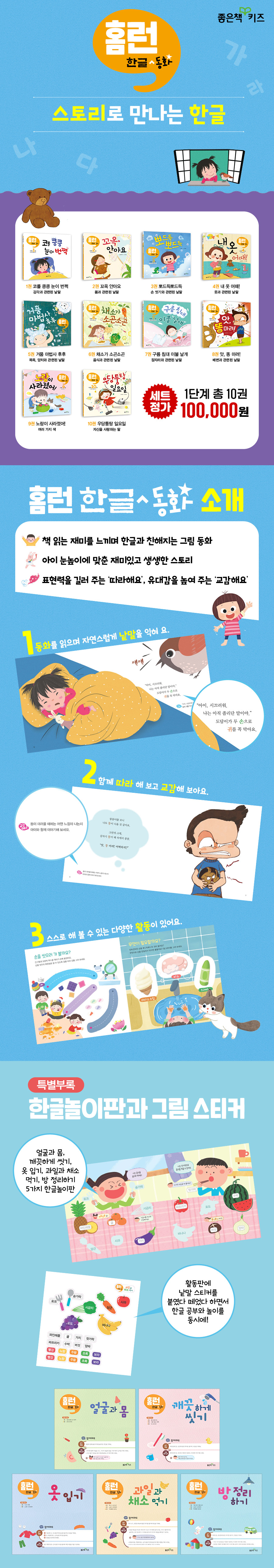 아이가 우리글을 처음 접할 때에는 체계적으로 학습하는 것보다 다양한 말을 사용할 수 있다는 자신감과 즐거움을 느끼게 해 주는 것이 중요합니다. ‘홈런한글동화’는 책 읽는 재미를 느끼며 한글과 친해지는 그림책입니다. 재미있는 이야기 그림책과 만나는 경험을 통해 글자 모양을 인지하고 읽기, 말하기, 쓰기에 흥미를 가질 수 있도록 해 줍니다. 아이와 함께 따라 해 보고 교감하는 그림책 ‘홈런한글동화’에는 등장인물의 말과 행동을 따라 해 보는 ‘따라해요’, 부모와 아이가 정서적으로 교감해 보는 ‘교감해요’ 활동이 있습니다. 이러한 활동은 아이의 표현력을 길러 주고, 아이와 부모가 정서적 유대감을 높이는 데 도움이 될 것입니다. 특별 부록 ‘한글놀이판+스티커’ ‘홈런한글동화’와 연계한 활동 및 놀이를 할 수 있도록 놀이판과 스티커를 제공합니다. 주제에 따라 얼굴과 몸, 깨끗하게 씻기, 옷 입기, 과일과 채소 먹기, 방 정리하기의 5개로 구성했습니다. ‘홈런한글동화’와 함께 활용하며 낱말을 인지하고, 그림 스티커를 붙였다 떼었다 하면서 놀이도 할 수 있습니다. |