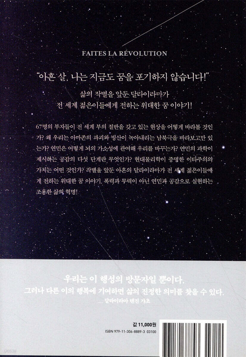 나의 희망, 인류의 미래인 여러분에게 세상을 움직일 평화의 역동적 힘 무너진 장벽 아래의 촛불 참된 것과 그른 것을 구분하는 방법 테러와 전쟁을 대화와 비폭력으로 맞서는 용기 제2부 나는 지금도 꿈을 꿉니다 나는 작별할 준비가 되어 있습니다 인류애로 기후 위기에 답을 낸다면 어떠할까요? 자유·평등·박애·정의의 가치 조용한 혁명을 합시다 제3부 세상을 바꾸는 ‘우리’ 뇌를 바꾸는 연민의 혁명 연민은 배움이 아니라 깨달음입니다 무엇보다 우선하는 인간이라는 카테고리 전 세계 부의 절반을 갖고 있는 67명의 부자들 감정은 숨기는 것이 아니라 드러내는 것입니다 현대물리학이 증명한 이타주의의 필연성 제4부 나의 마지막 선물 어떻게 연민의 혁명을 할 것인가? 공감을 넘어 진정한 연민으로 미래의 인류를 위해 남겨진 일들 소피아 스트릴르베의 후기 : 지성을 넘어 우주적 영성으로 프랑스대혁명의 신봉자 달라이라마 신경과학과 불교의 만남 인더스강 변에서의 자연에 대한 명상 이타주의 혁명과 지구의 민주주의 보편적 책임 선언 요약 |