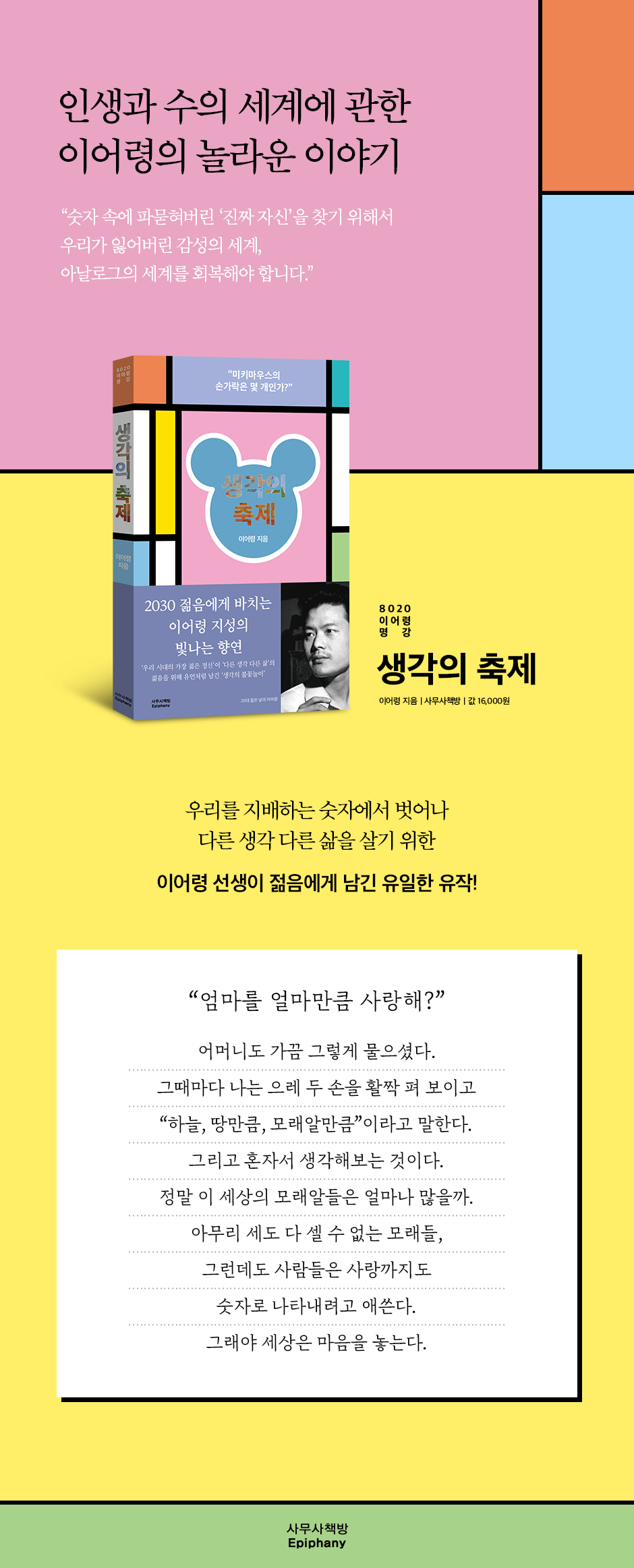 어머니도 가끔 그렇게 물으셨다. 그때마다 나는 으레 두 손을 활짝 펴 보이고 “하늘, 땅만큼, 모래알만큼”이라고 말한다. 그리고 혼자서 생각해보는 것이다. 정말 이 세상의 모래알들은 얼마나 많을까. 아무리 세도 다 셀 수 없는 모래들, …… 그런데도 사람들은 사랑까지도 숫자로 나타내려고 애쓴다. 그래야 세상은 마음을 놓는다. --- p.15~16 남자들이 여성에게 끌려서 가는 그 길. 사랑의 길. 그건 알 수 없다는 겁니다. 이걸 숫자로 셀 수 있을까요? 우리가 사랑하는 순간 시장에서 쓰는 화폐가 별 의미가 없어져요. 이수일과 심순애 같은 거 있죠? 사랑보다도 돈 때문에 움직이는 것. 이것은 위험한 세계입니다. 그렇기 때문에 숫자의 세계와 언어의 세계 가운데, 사랑은 언어로 숫자가 아닌 언어로 표현해야 하는 겁니다. 그런데 지금은 모든 것이 숫자로 표현되지요. GNP나 서열, 돈의 액수. 하지만 모든 것이 이렇게 숫자로 표현될수록 우리는 숫자로 표현할 수 없는 것들, 사랑이나 마음이나 정의 같은 것의 귀중함을 더 깨닫게 됩니다. 참 역설적이지요. --- p.60 컴퓨터는 1과 0으로 모든 걸 기록할 수 있습니다. 바로 디지털문화이고 음양사상입니다. 디지털의 원(One)과 제로, 즉 피타고라스가 얘기하는 2개의 대립하는 짝으로 보면 세상이 확연해집니다. 유한과 무한, 단수와 복수, 기수와 우수, 우와 좌, 정과 동, 직선과 곡선 등등 이 세상이 복잡하게 많은 것 같아도 정리가 되어 질서정연한 하나의 우주를 생각할 수 있지요. 삼라만상 무한한 우주를 음과 양으로 나누면 인식할 수 있습니다. 그러니까 우리는 둘이라는 숫자가 없었으면 부부, 남녀, 빛과 어둠 등을 의식할 수 없었겠죠. 우리 머리 자체가 이미 디지털화되어 있는 겁니다. --- p.178~179 이렇게 보면, 인문학이라는 것은 마술입니다. 시 마술이고, 문학 마술입니다. 과학이 아닌 것이 마술인데, 과학을 상징하는 숫자에 신비가 있어요. 문명의 극단에 와 있는 21세기는 숫자와 언어의 세계로 끝없이 분할된, 갈가리 찢어진 산업주의 시대라고 하는데 이것을 다시 통합하려는 마술이 바로 여기서 비롯되는 것이지요. --- p.191 관념적으로 생각하는 것보다 스토리로 상상하고, 스토리로 생각하면 훨씬 절실하게 느낄 수 있습니다. 정말 심장이 두근두근 뛰는 사람에게는 피가 뚝뚝 흘리는 삶의 철학, 삶의 시가 다가옵니다. 그것은 아인슈타인도 나에게 말하지 못하는 겁니다. 사랑에 애인을 잃고, 고민하고 밤을 새우는 사람에게 상대성 원리는 아무 의미가 없으니까요. 결국 ‘8020 이어령 명강-생각의 축제’는 숫자(8020)와 고유명사(이어령), 보통명사(명강)가 혼합된, 숫자와 언어의 세계, 숫자의 삶과 언어의 사랑이 살아 숨 쉬는 ‘생각의 축제’입니다. --- p.221 속일 때 속이더라도 말(곡식, 액체, 가루 따위의 분량을 되는 데 쓰는 그릇)과 되(사각형 모양의 나무그릇)에 수북하게 쌓아주는 한국 시장의 훈훈한 풍경이 새삼 그리워지더군요. 정확한 도량형을 만들어놓고도 실제로 줄 때는 부정확하게 수북하게 쌓아 주는 민족은 아마 한국 말고는 없을 겁니다. 근대화하여 정찰제나 엄격하게 도량형을 따지는 오늘날에도 시장에서 되를 사용하는 것을 보면 더욱 그래요. 옛날같이 수북한 봉우리가 아니라 수평으로 깎아도 마지막까지 싹 훑지 않고 한 뼘 정도는 남기는 그 정서의 그리움이라고나 할까요. 야박하게 끝까지 싹 쓸지 못하는 것이 바로 한국인의 계산법인 까닭이겠지요. --- p.236 오늘의 젊은 벗들에게 창조력과 상상력을 알려주고 싶습니다. ‘다른 생각, 다른 삶’을 선택한 젊은이들이 창조력과 상상력을 이해한다면, ‘악마의 숫자든 뭐든 오너라. 인생이 숫자 아니면 이름으로 시작된다고? 어느 것이든 좋다. 숫자든 이름이든 인생의 운명이여 오라. 나는 나의 인생을 나의 창조적 상상력으로 행복하게 만들겠다. 숫자도 만들겠다. 숫자와 함께 수많은 아름다운 이름과 시 또한 발견하겠다”고 외칠 수 있을 것입니다. 이런 젊은이들에 의지하여 우리의 미래는 새로운 도전 앞에 머뭇거리지 않는 용기와 열정으로 활짝 열릴 것입니다. --- p.238 |