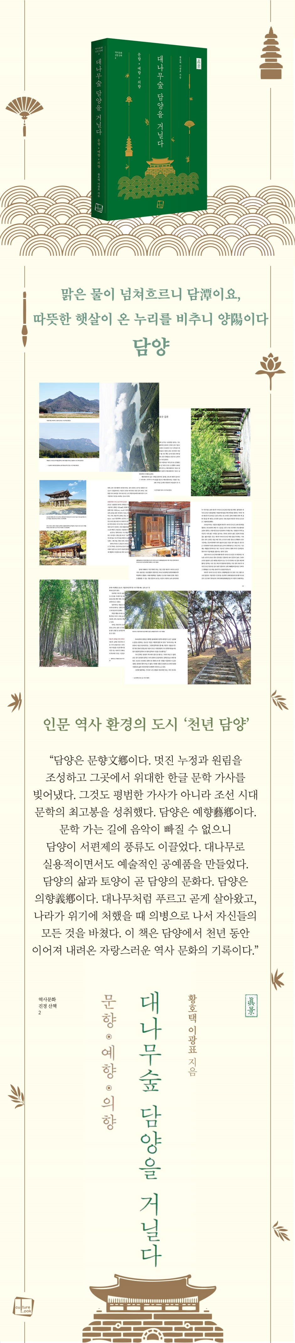 느려서 행복하다……삼지내 돌담과 고택의 향기 춘향의 낭군이 조성한 관방제 숲 담양의 3대 자연 유산 서편제 명창 이날치와 박동실 메타세쿼이아 가로수 길과 메타프로방스 폐사지 연동사를 복원한 원행 스님 2부 영산강에 유유히 흐르는 역사 임진왜란에 삼부자가 목숨 바친 충절의 집안 조선 시대 기록 문화의 꽃 ≪미암일기≫ 창평에서 벌족 이룬 양녕대군 후손들 동학농민군과 항일 의병의 격전지 금성산성 풍수지리 사연 담긴 담양의 석조 문화재 용이 태어난 절 용흥사 3부 가사 문학과 원림 가사 문학의 최고봉 담양 꽃이 진다고 슬퍼 마라 ― 송순 면앙정 송강이 광주호 바라보면 무슨 시 지을까 정치와 문학의 기묘한 만남, 정철과 송강정 한국 전통 정원의 백미 소쇄원 인조의 삼고초려 사절한 명옥헌 고려 충신이 무등산 자락에 지은 독수정 4부 왕대밭의 미래 유산 담양 관광 1번지 죽녹원 세계중요농업유산 삼다리와 만성리 대나무밭 대를 잇는 대나무 공예의 장인들 미래의 먹거리 대나무 산업 5부 담양의 뉴트로와 음식 문화 옛 해동주조장과 해동문화예술촌 담빛예술창고와 대나무 파이프오르간의 만남 창작 공간 ‘글을낳는집’ 아트센터 대담 골목길의 아련한 추억과 아기자기한 매력 맛 들이면 살림이 기우는 담양 10미 1 대를 물려 내려오는 레시피 담양 10미 2 에필로그 천년 문장과 담양학 |