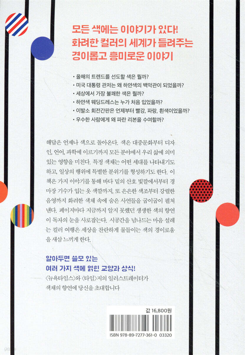 시대를 앞서가는 문화인의 경쟁력을 갖춘다 - 올해의 트렌드를 선도할 색은 뭘까? - 미국 대통령 관저는 왜 하얀색의 백악관이 되었을까? - 세상에서 가장 불쾌한 색은 뭘까? - 1억 가지 색을 구별하는 초능력자 테트라크로맷의 정체는? - 미국 지폐를 그린백(Greenback)이라고 부르는 데는 이유가 있다! - 하얀색 웨딩드레스는 누가 처음 입었을까? - 이발소 회전간판은 언제부터 빨강, 파랑, 흰색이었을까? - 우수한 사람에게 왜 파란 리본을 수여할까? 밥 햄블리는 세계 최고의 매체에서 오랜 기간 일러스트레이터로 활동하면서 쌓은 전문지식과 열정으로 색채의 향연을 차려놓고 독자들을 초대한다. 2017년 개설한 그의 블로그 ‘Colour Studies’는 세계의 톱 디자이너들이 참조하는 가장 인기 있는 사이트다. 유럽과 북미의 디자인 문화를 선도하는 인기 있는 잡지 《Uppercase Magazine》에서 특집으로 다루기도 했다. 색은 세상을 이루는 기본적인 요소다. 우리 기분을 좌우하고 매혹하기도 한다. 예술가나 디자이너부터 감수성이 풍부한 일반인들을 포함한 모두가 지금까지 알지 못했던 진기한 색에 얽힌 이야기의 매력에 흠뻑 빠져들 것이다. 저자는 따스하면서도 예리한 유머와 통찰력으로 세상사에 스며든 색채 이야기를 흥미진진하게 풀어낸다. 무엇보다 대담한 색조와 디자인, 사진들은 이 책을 읽는 재미를 배가시킨다. 페이지마다 탄성이 저절로 나올 만한 색과 관련된 정보가 들어 있는 이 책은 아름다움을 사랑하는 이들에게 완벽한 선물이 될 것이다. |